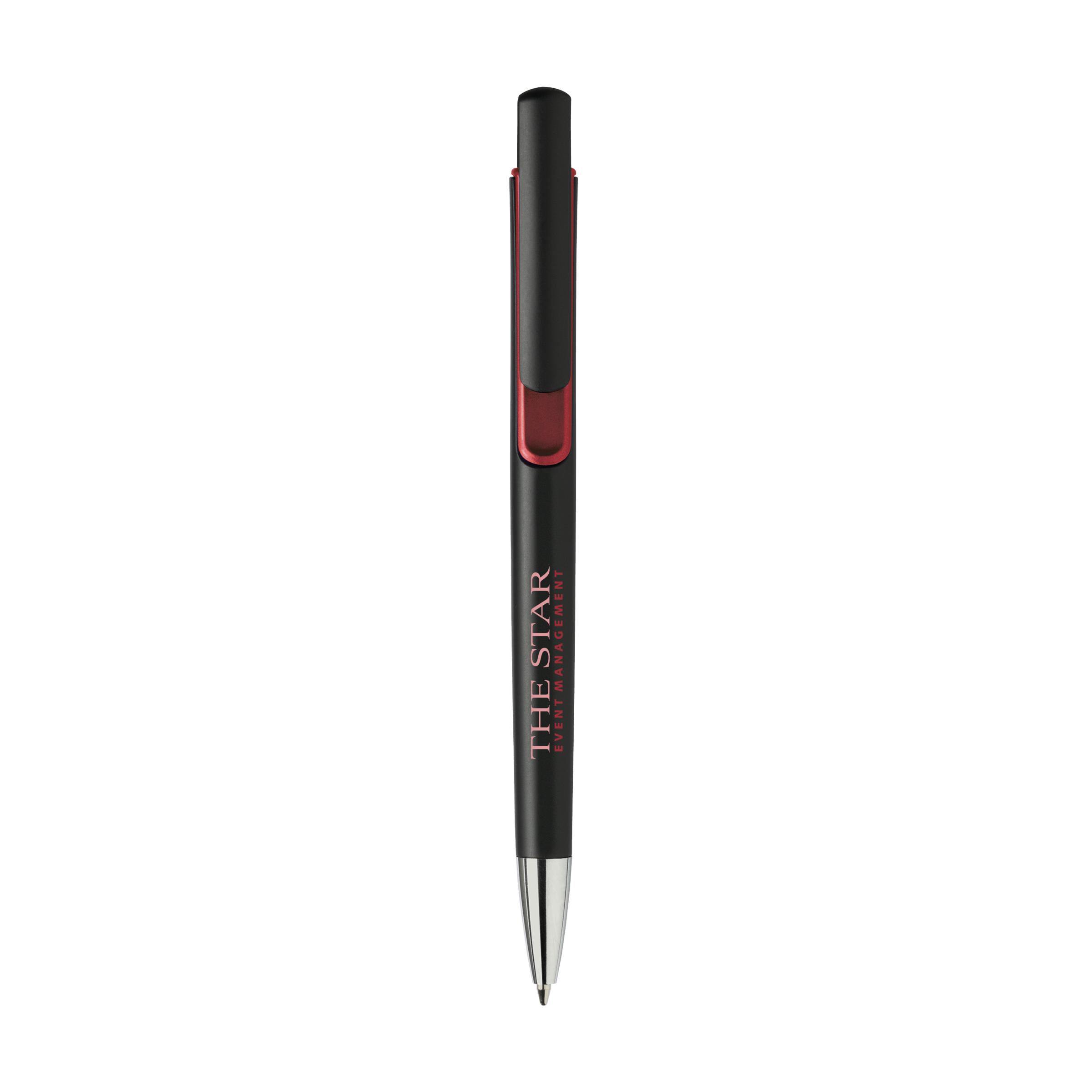 Blue ink ballpoint pen with matte black barrel, outstanding designed clip and metallic-look detail.