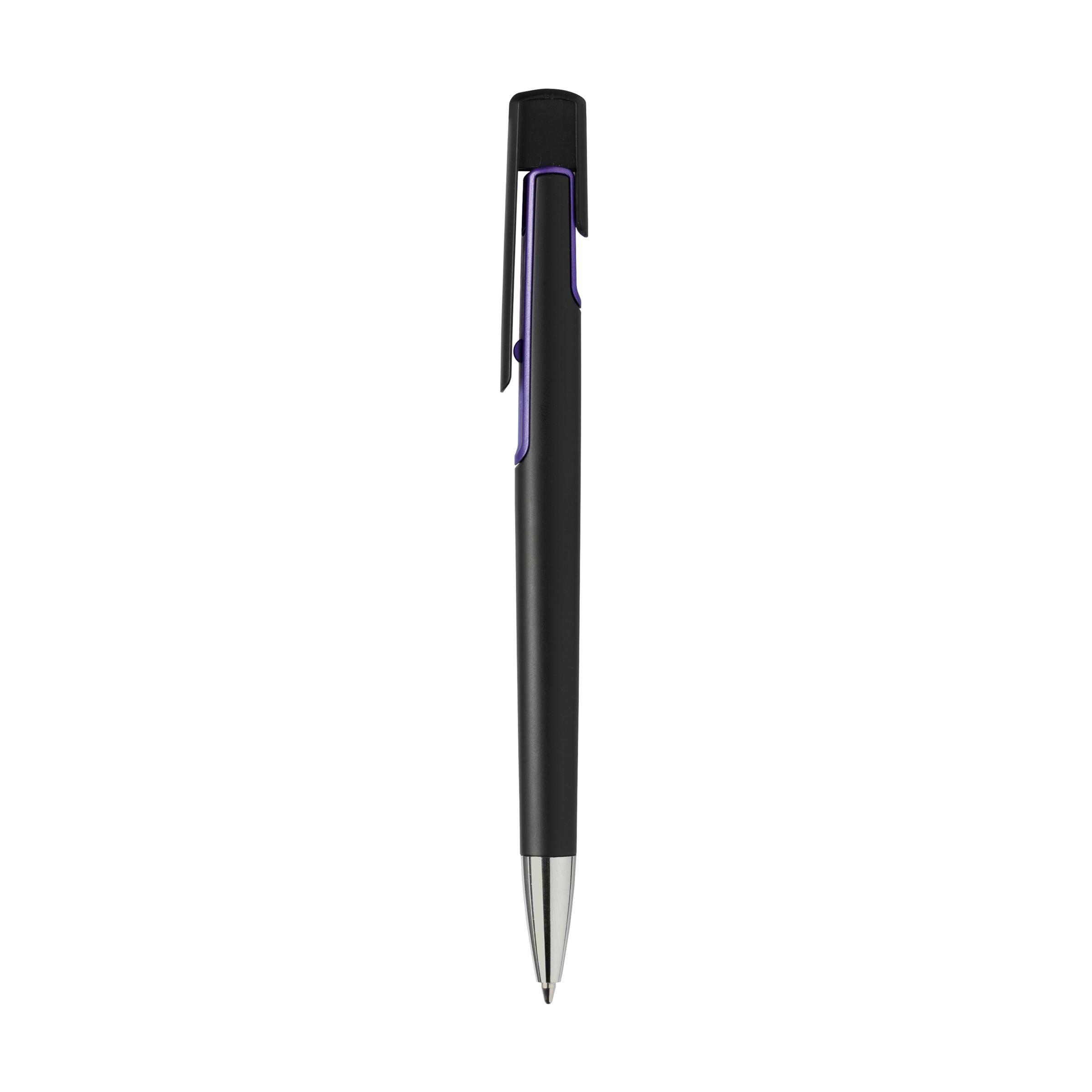Blue ink ballpoint pen with matte black barrel, outstanding designed clip and metallic-look detail.