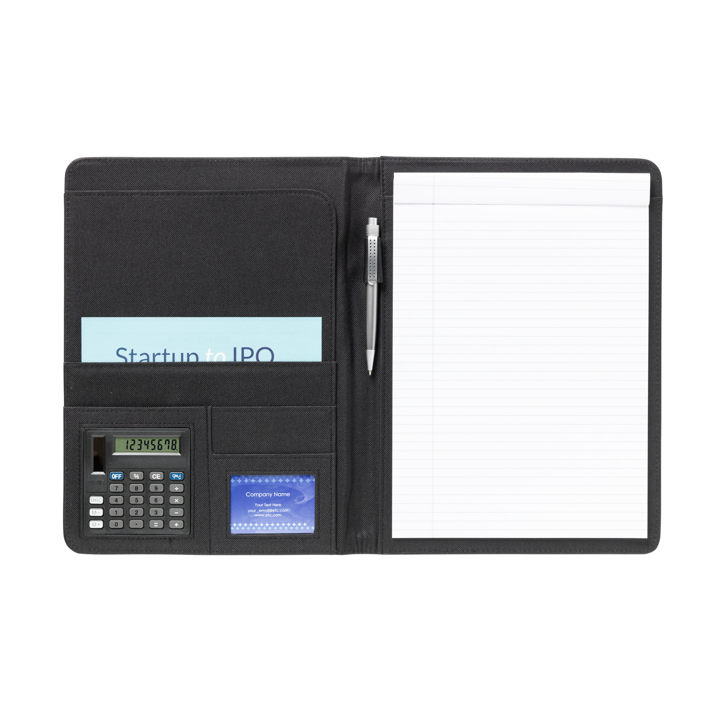 Conference/document folder made of 600 D polyester/imitation leather in A4 format. Incl. detachable dual power calculator (incl. battery) writing pad and ballpoint pen.