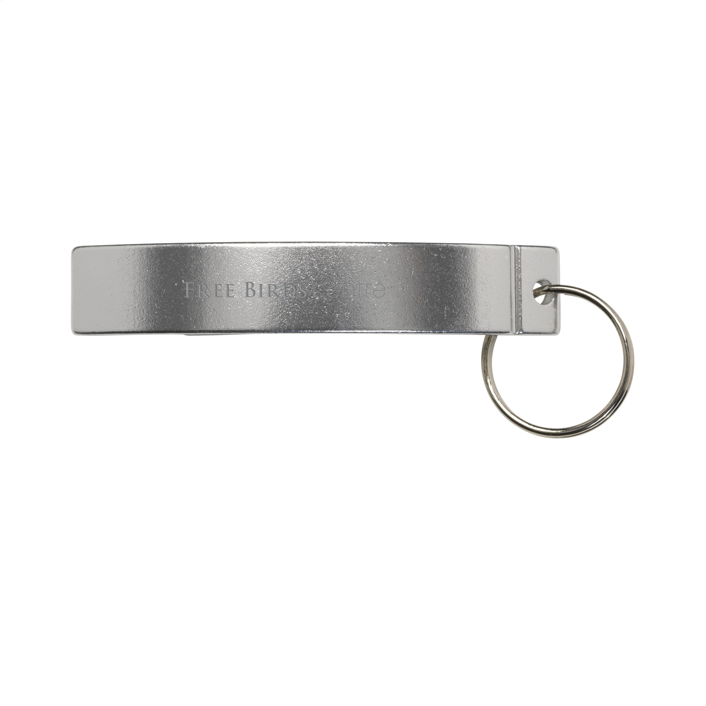 Arched aluminium bottle opener and keyring.