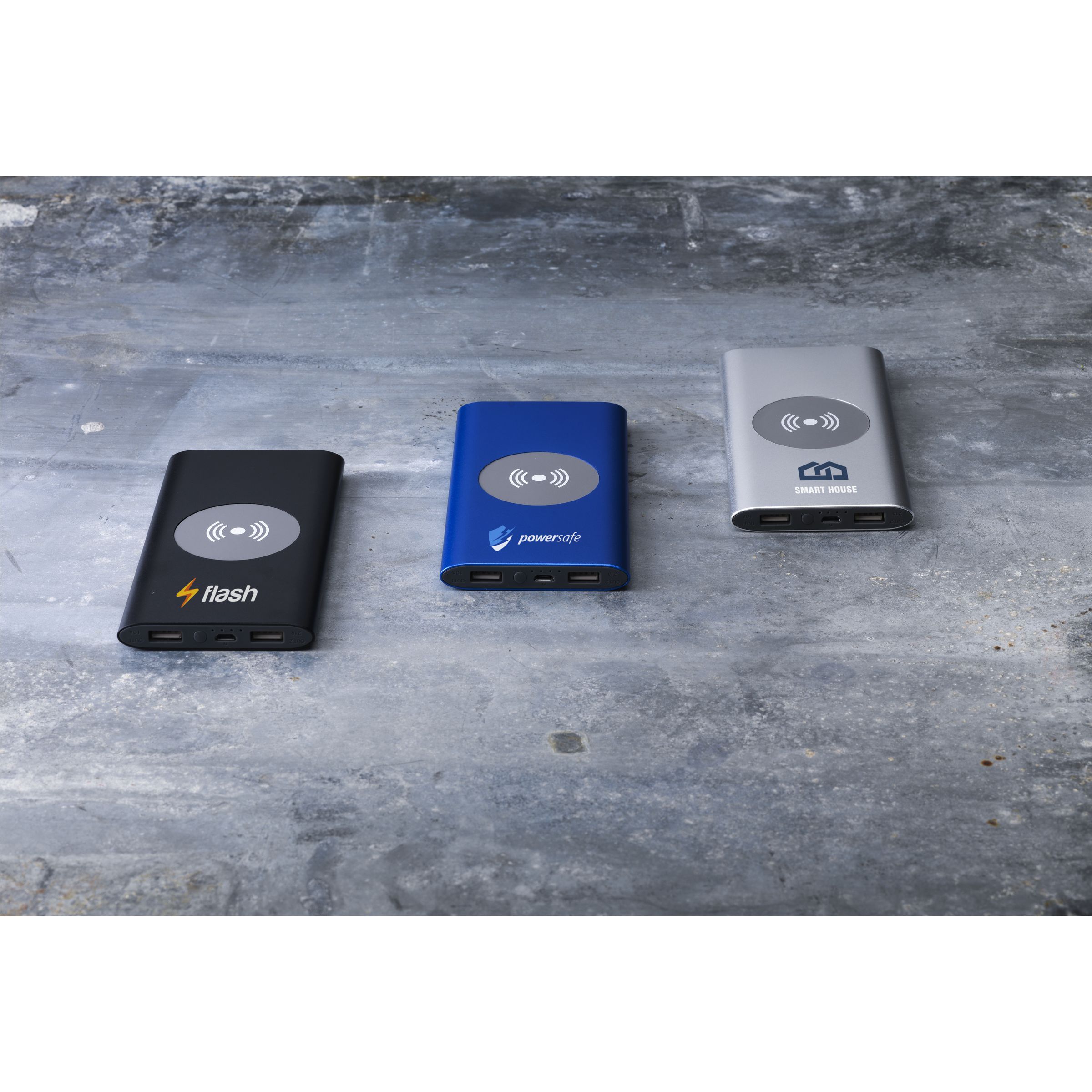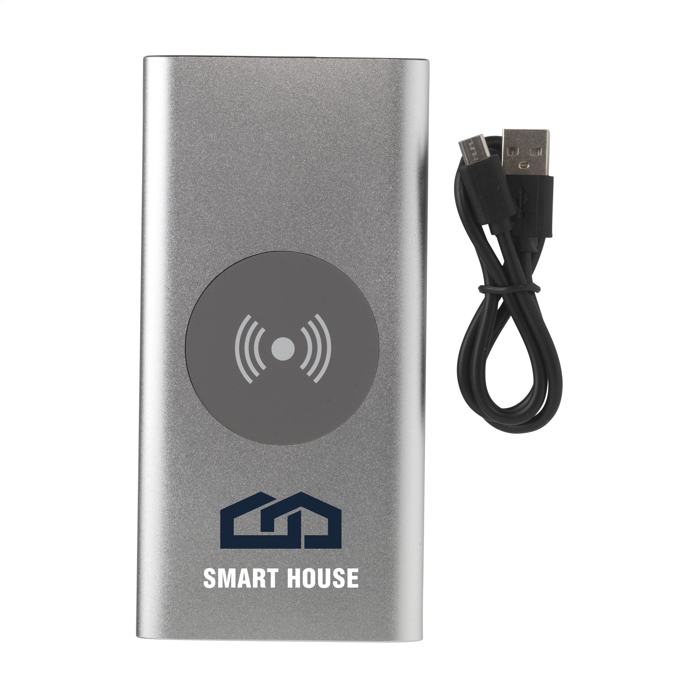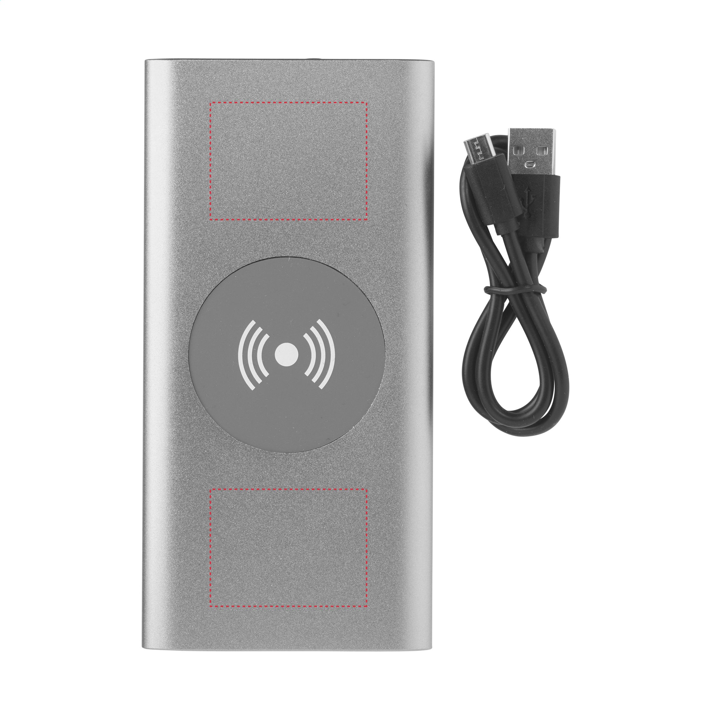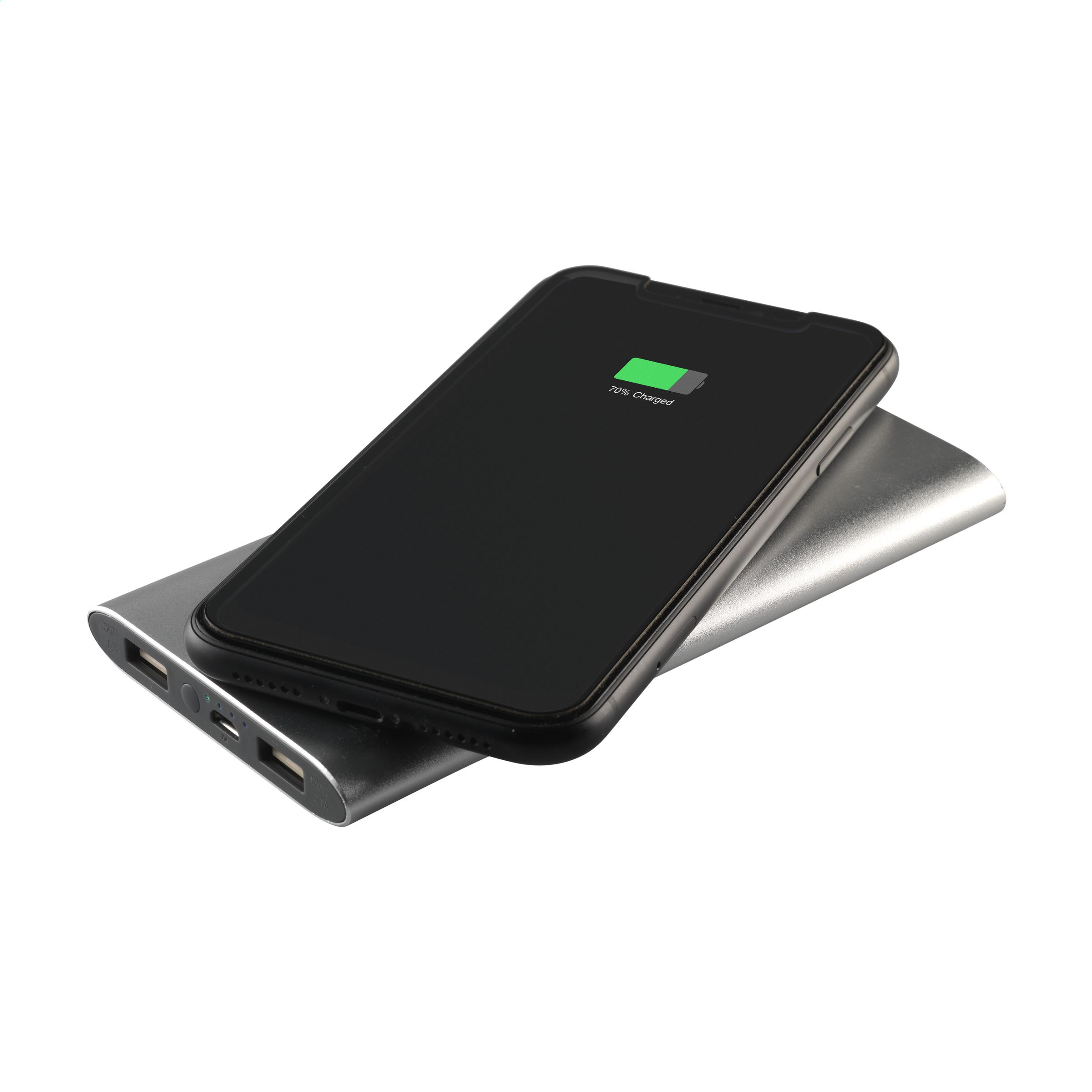 Powerful, durable wireless charging power bank with a high-quality finish, made of aluminium, with a built-in lithium polymer battery (8000mAh). Quickly charges smartphones or tablets via the USB ports and includes an integrated 5W wireless charging function for mobile devices that support QI wireless charging (newest generations Android and iPhone). Input 5V/2A. Output: 5V/2A. Wireless output: 5V/1A (5W). Includes 50 cm micro-USB (2A) charging cable, indicator lights, on/off button and user manual. Each piece in a box.
