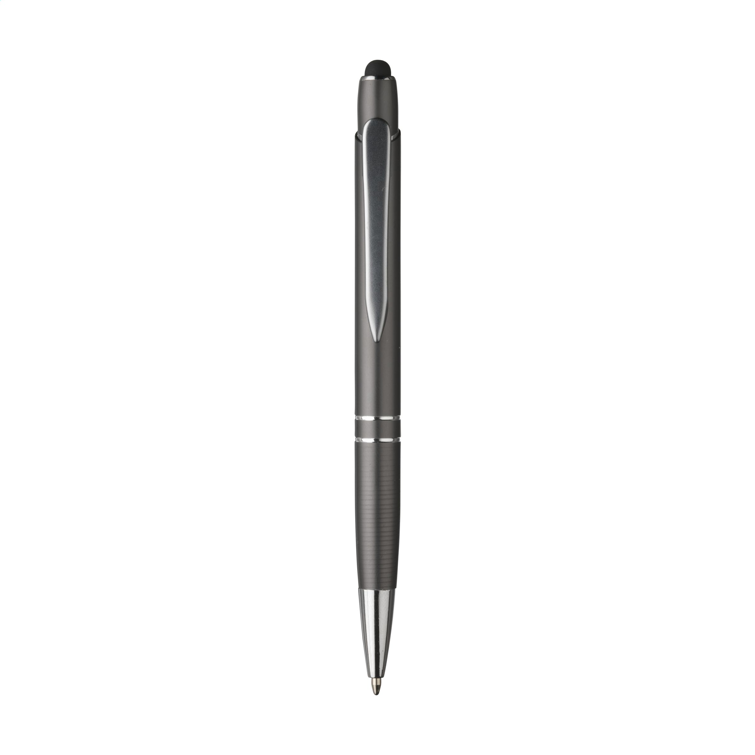 Blue ink pen with aluminium holder with trimmed grip, silver accents and metal clip. Equipped with a top/pointer to operate touch screens (eg iPhone/iPad).