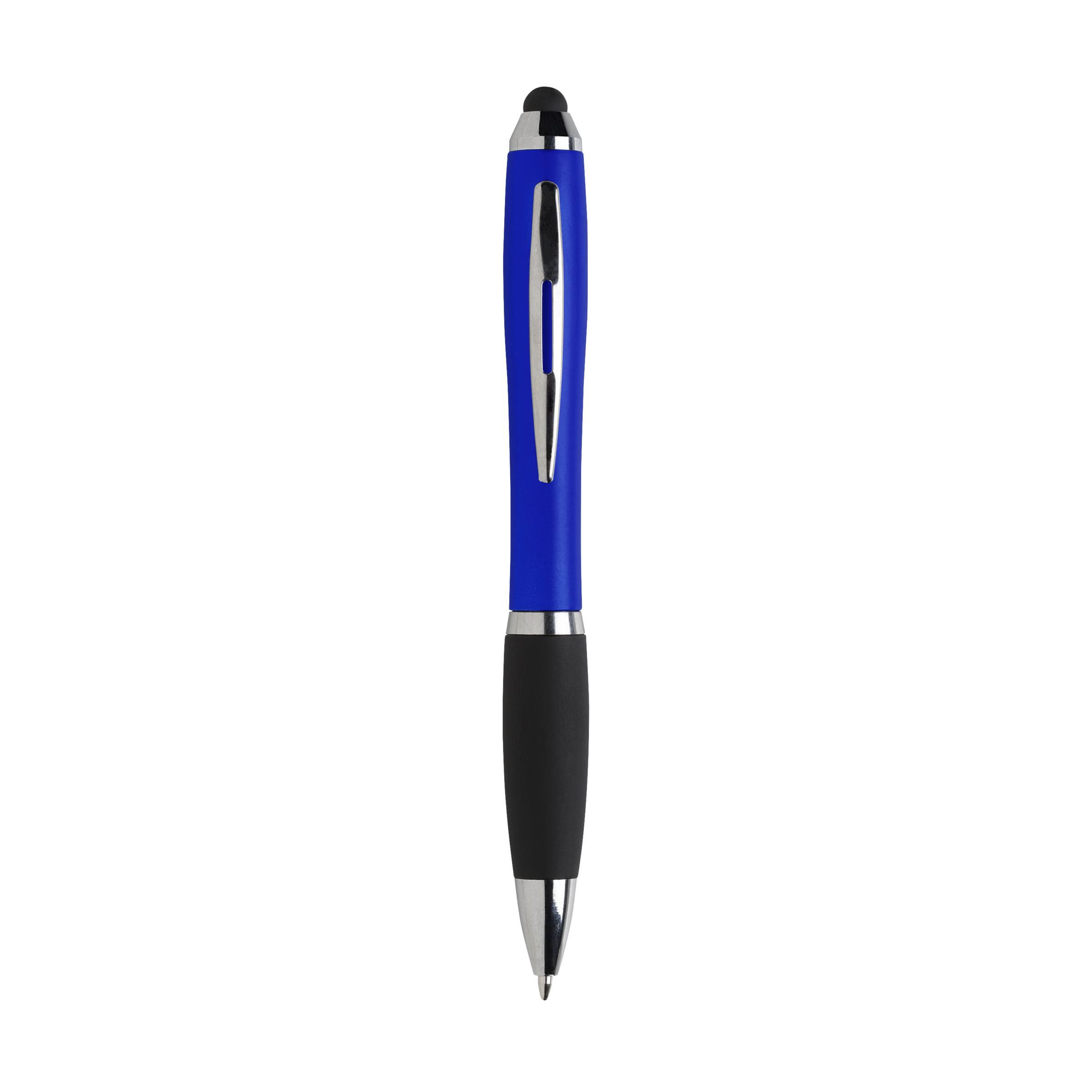 Blue ink ballpoint pen with coloured barrel, rubber grip, glossy accents, recess in metal clip and rubber top/pointer to operate touch screens (eg iPhone/iPad).