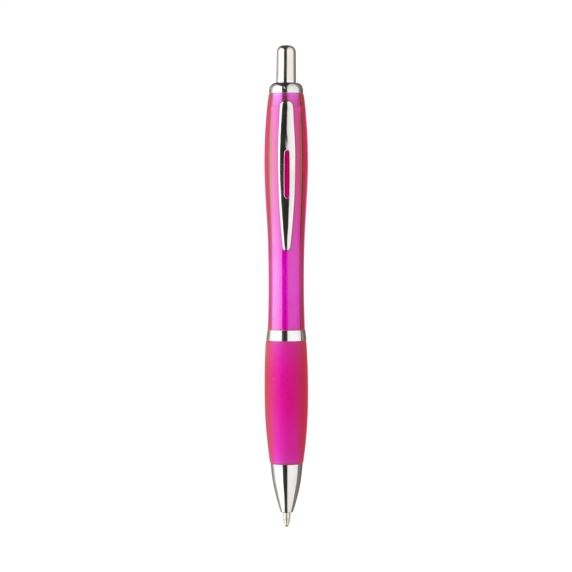 Blue or black ink ballpoint pen with transparant coloured barrel, non-slip grip and metal clip.