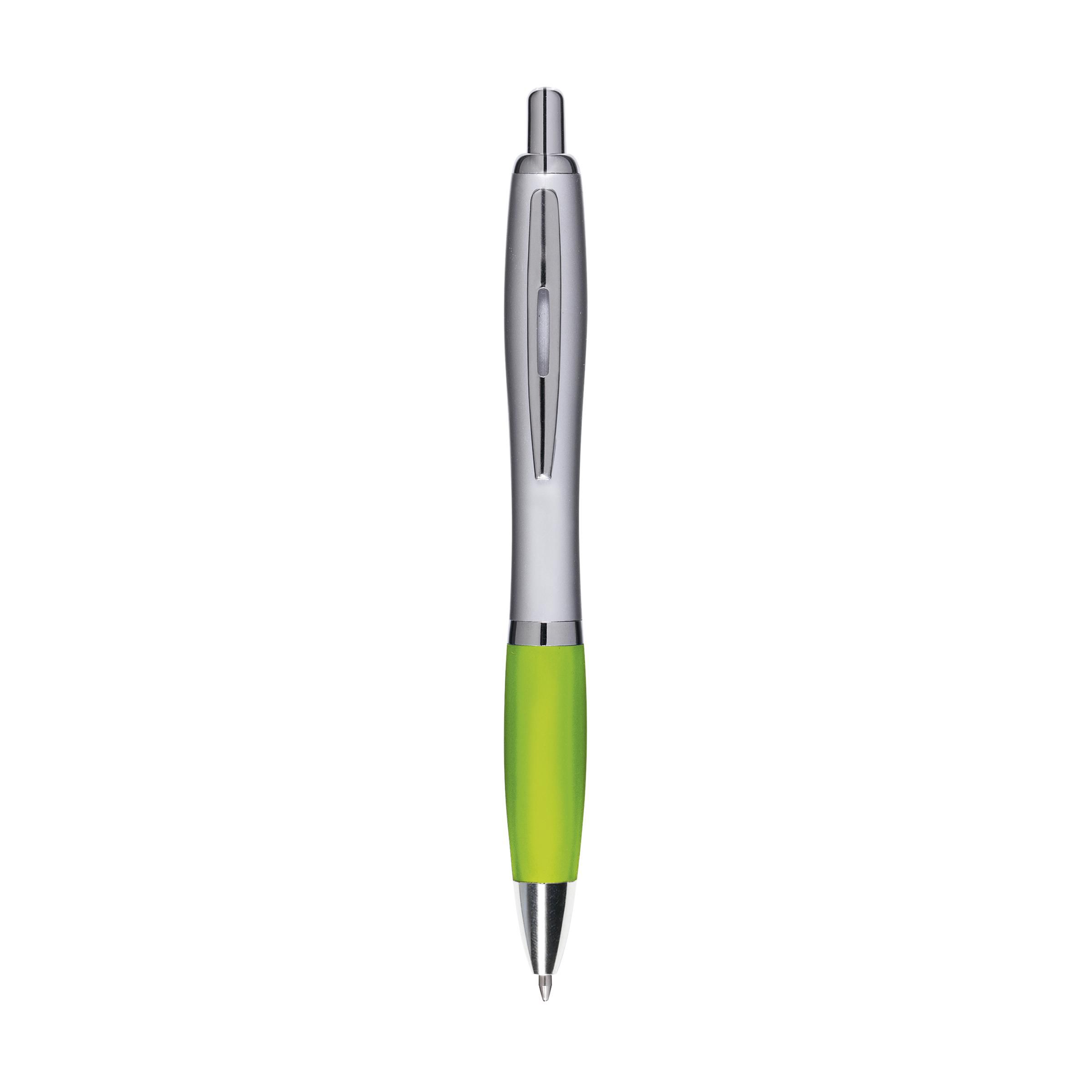 Blue or black ink ballpoint pen with coloured non-slip grip and metal clip.