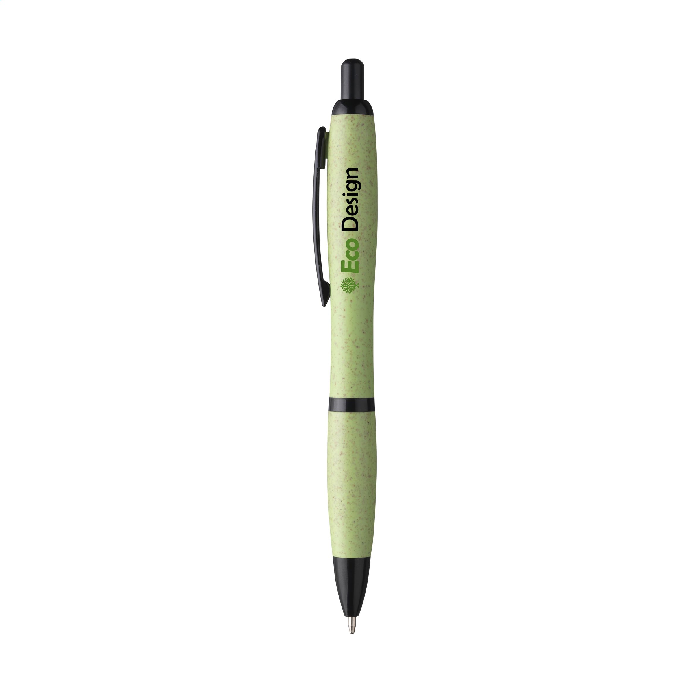 Eco-friendly, blue ink ballpoint pen made of 50% PP and 50% wheat straw. With black accents and metal clip. Partly biodegradable.