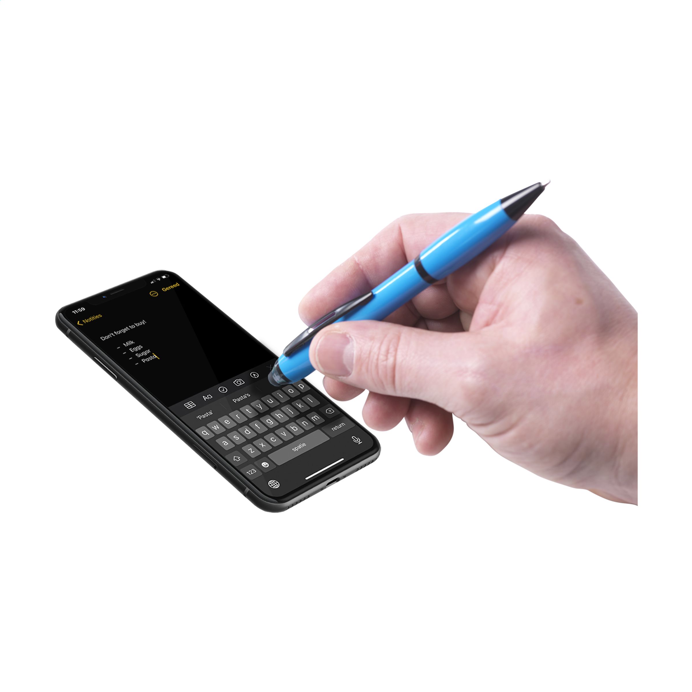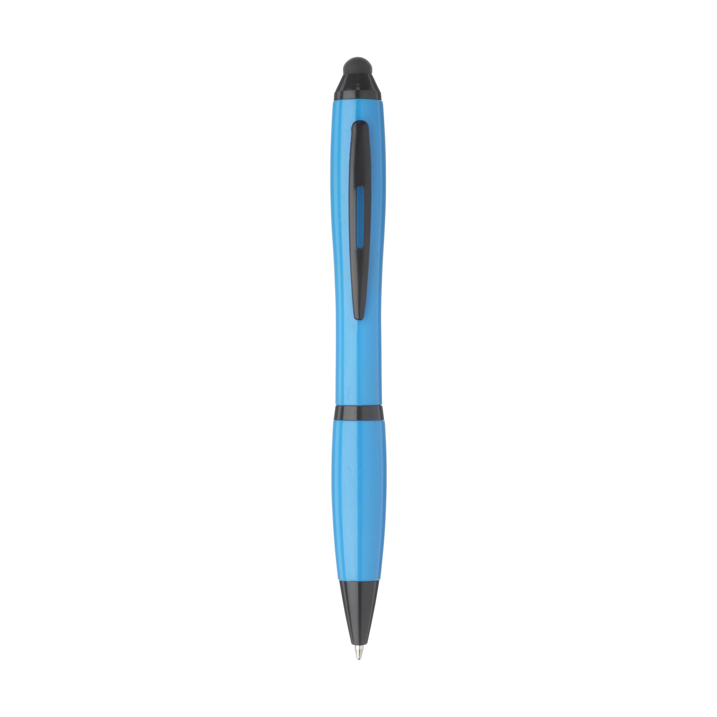 Blue ink ballpoint pen with rubber top/pointer to operate touch screens (eg iPhone/iPad). With black accents, recess in clip and twist mechanism.