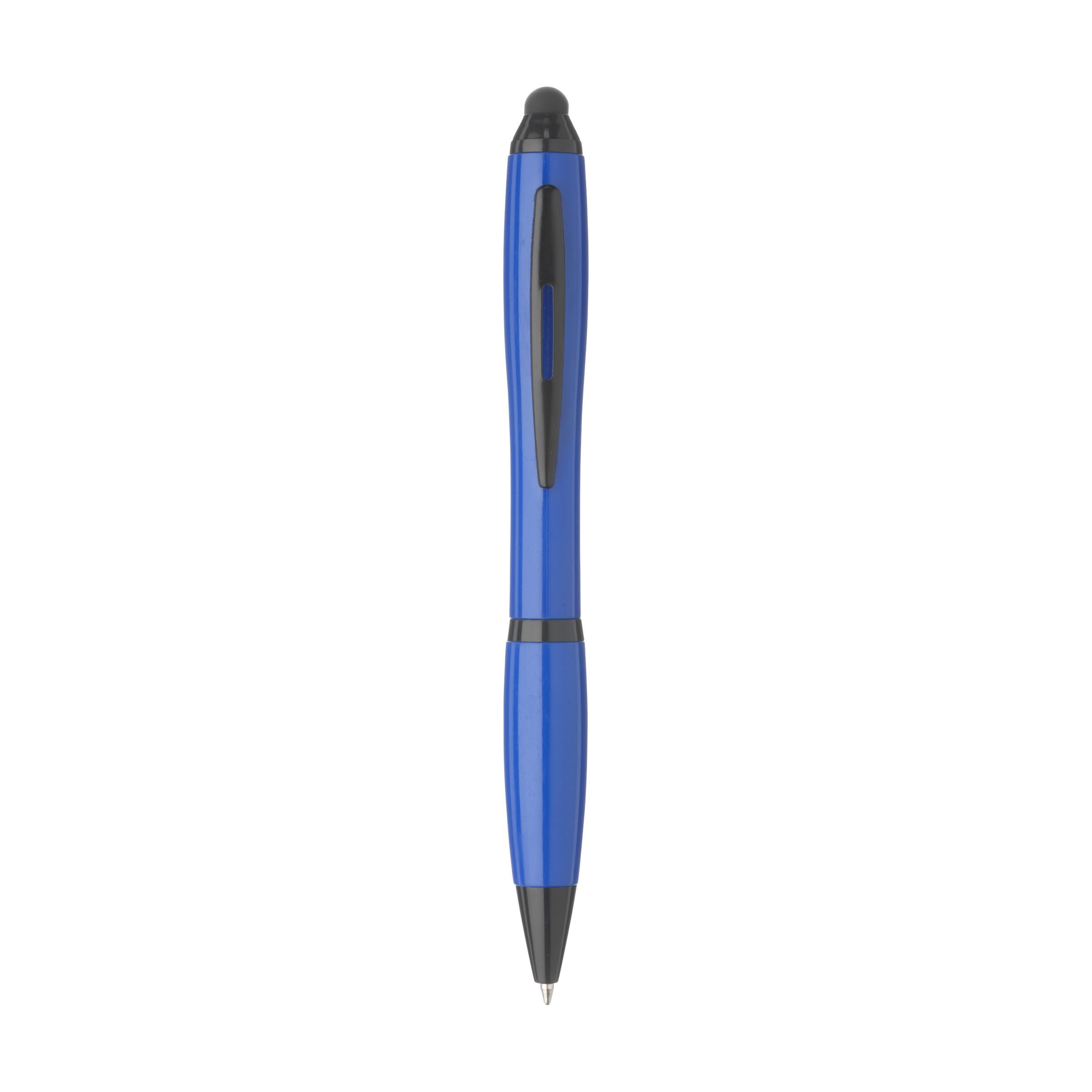 Blue ink ballpoint pen with rubber top/pointer to operate touch screens (eg iPhone/iPad). With black accents, recess in clip and twist mechanism.