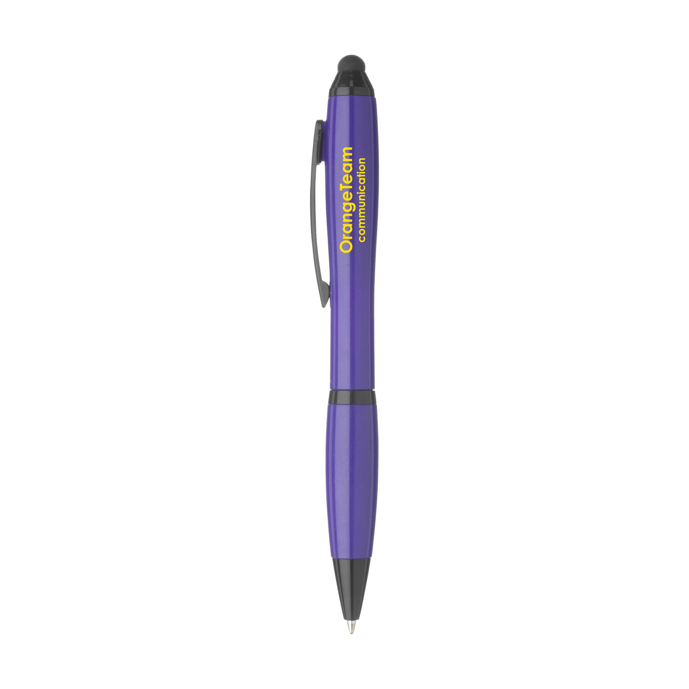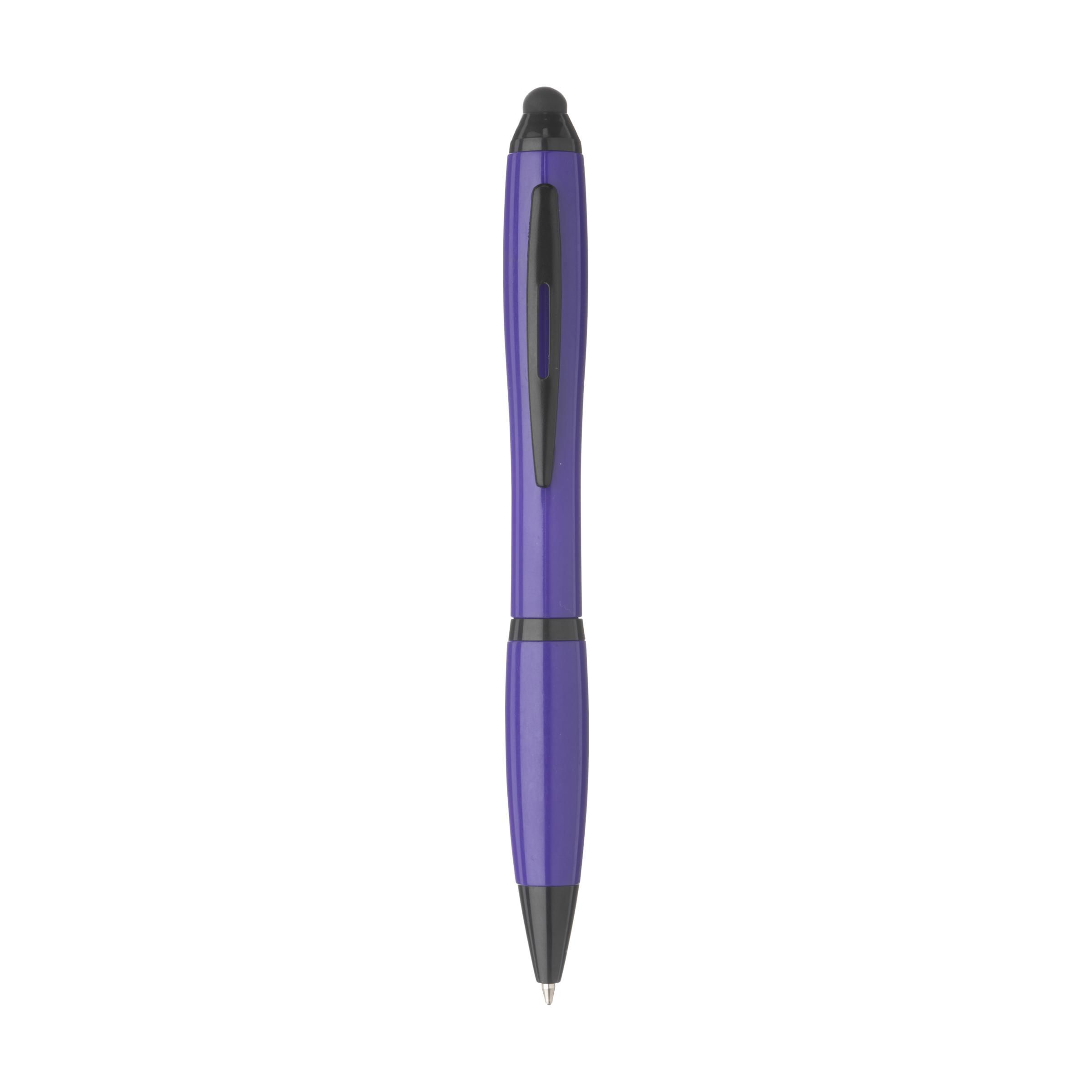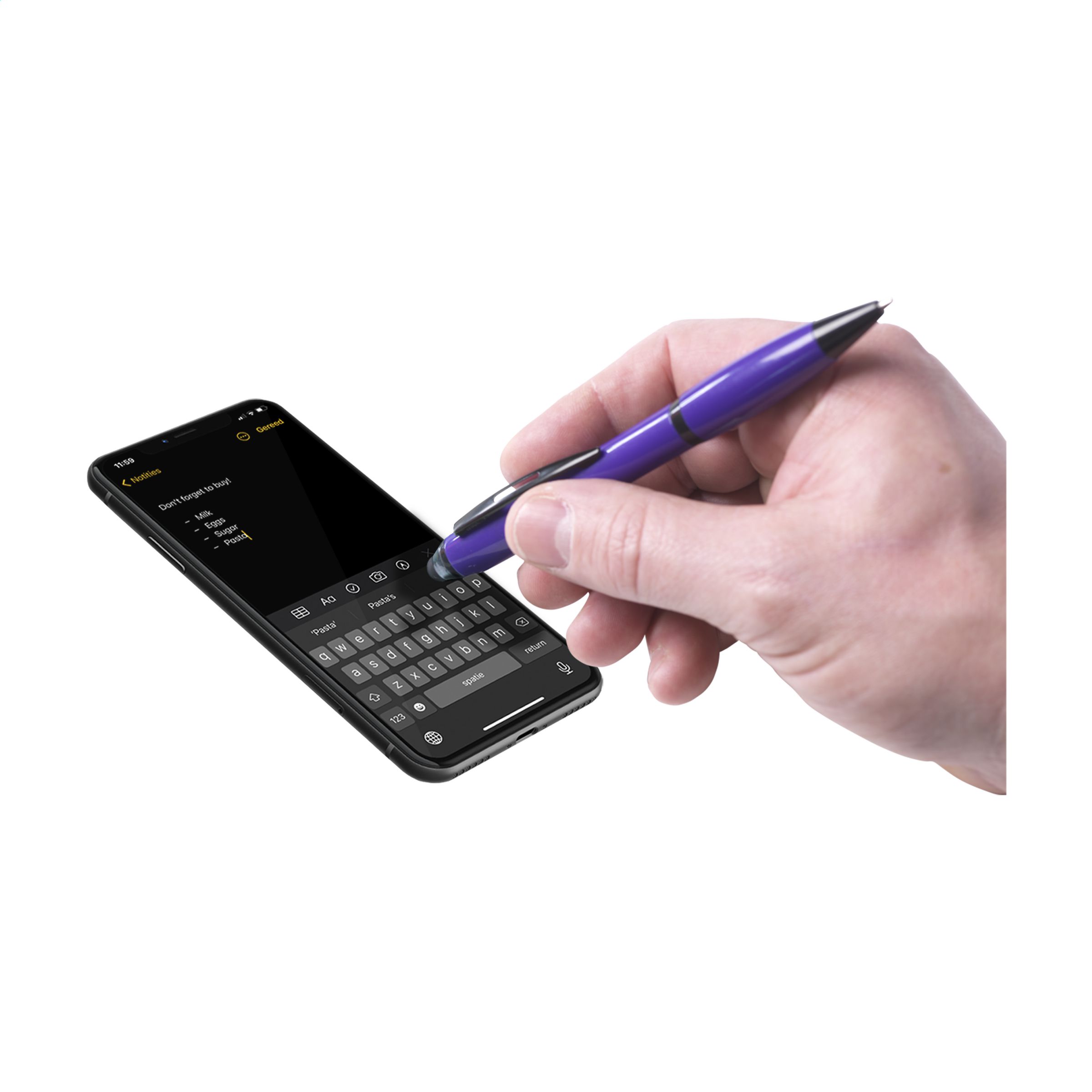Blue ink ballpoint pen with rubber top/pointer to operate touch screens (eg iPhone/iPad). With black accents, recess in clip and twist mechanism.