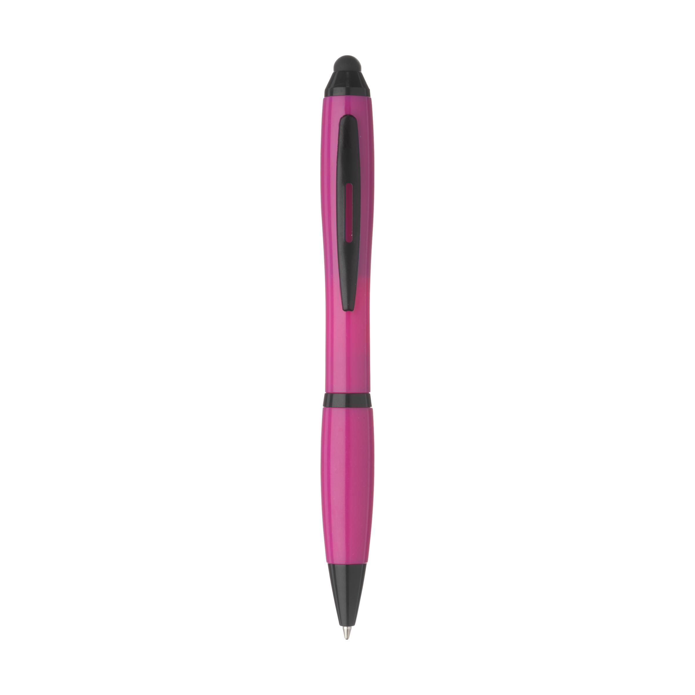 Blue ink ballpoint pen with rubber top/pointer to operate touch screens (eg iPhone/iPad). With black accents, recess in clip and twist mechanism.