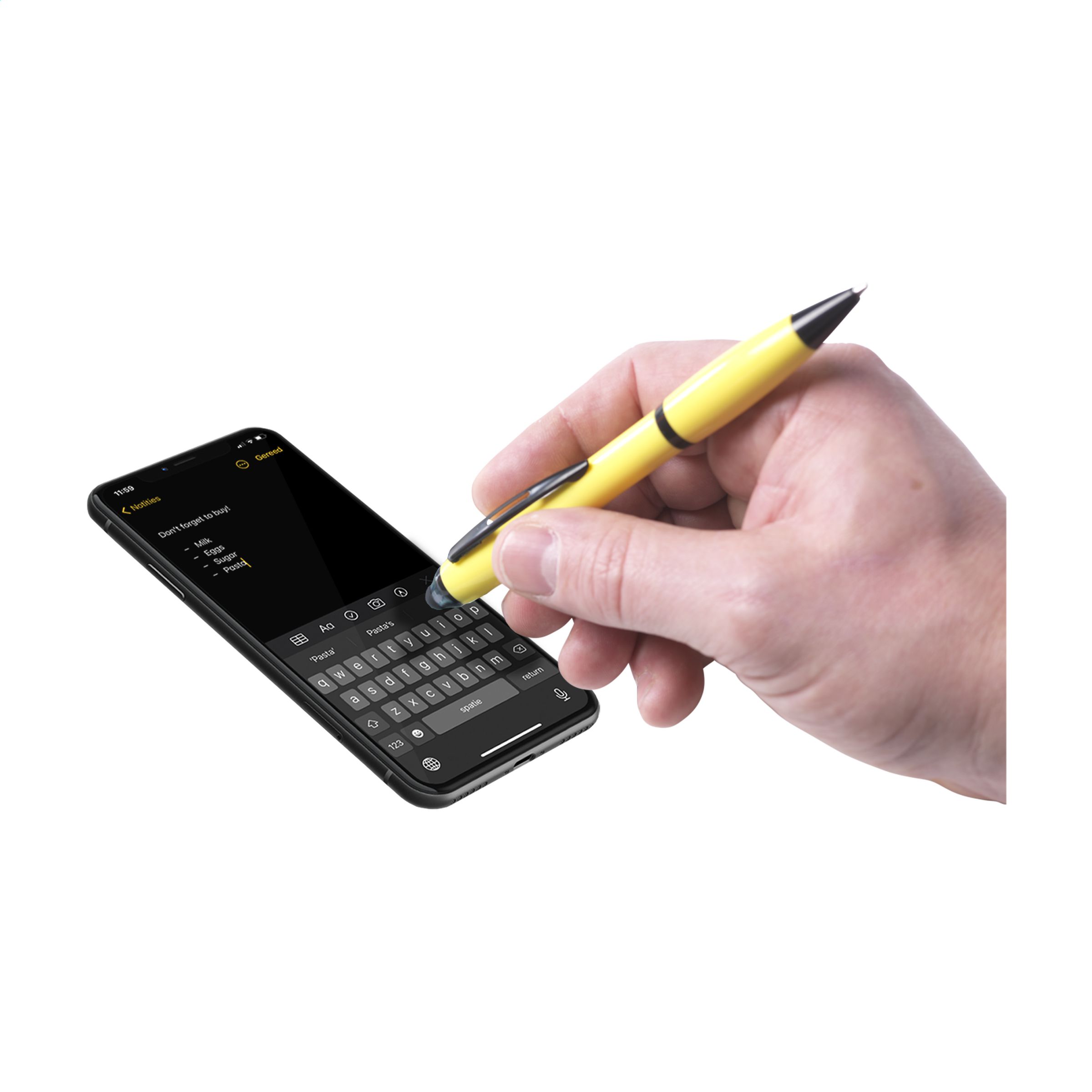 Blue ink ballpoint pen with rubber top/pointer to operate touch screens (eg iPhone/iPad). With black accents, recess in clip and twist mechanism.