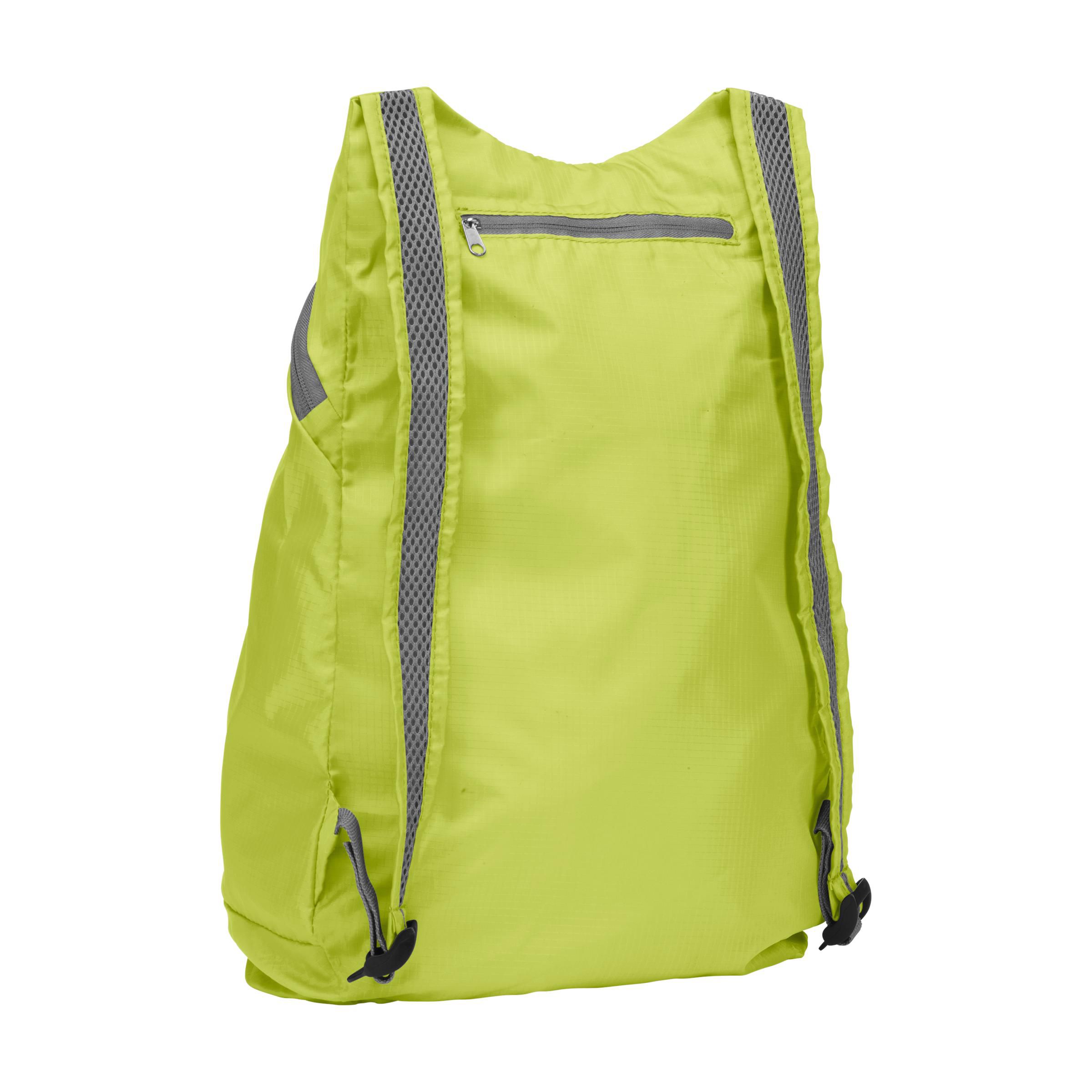 Foldable, lightweight backpack made of strong, durable 190T polyester jacquard. With generous storage space and adjustable mesh shoulder straps. Backpack to pouch. Meas. folded 13 x 12.5 x 2.5 cm.