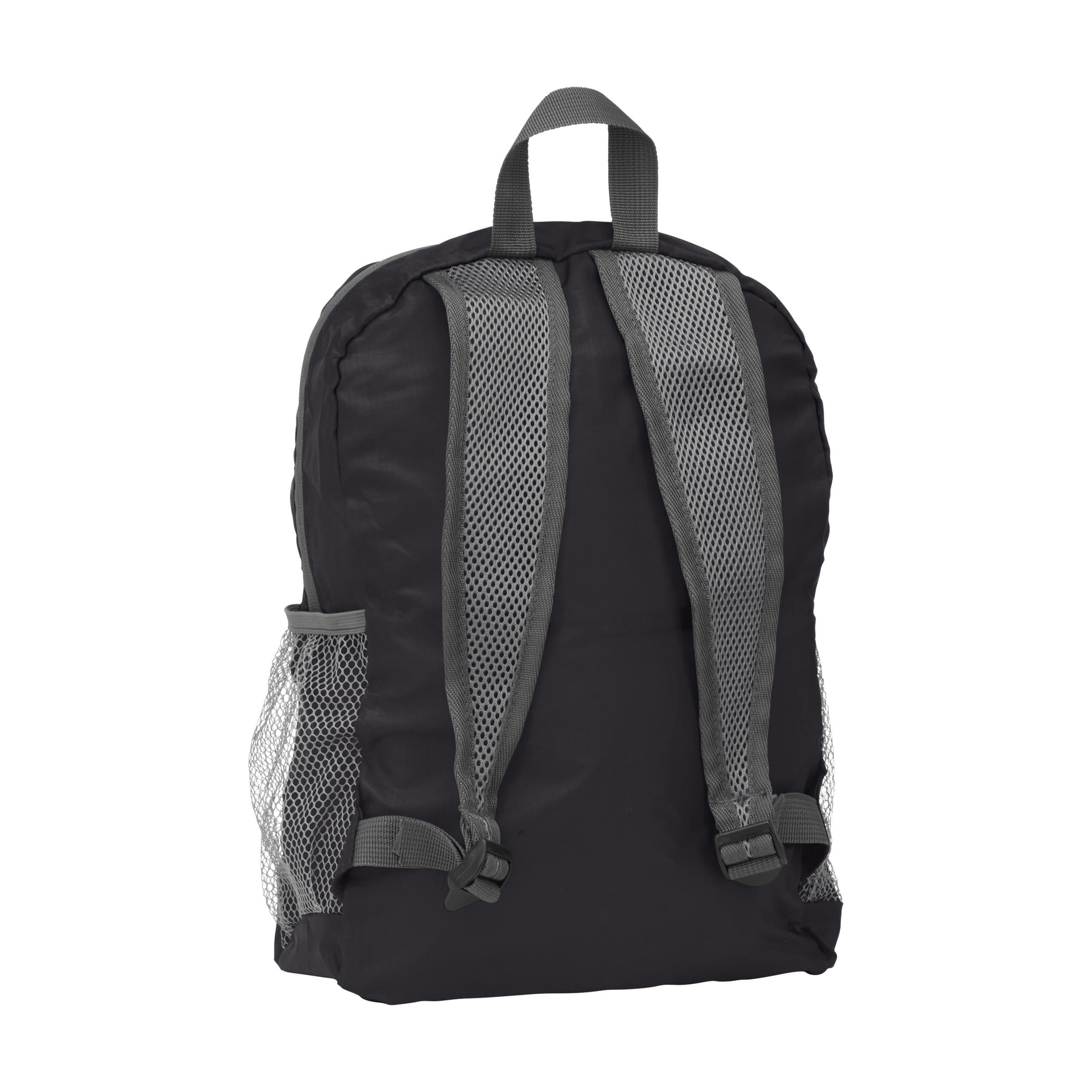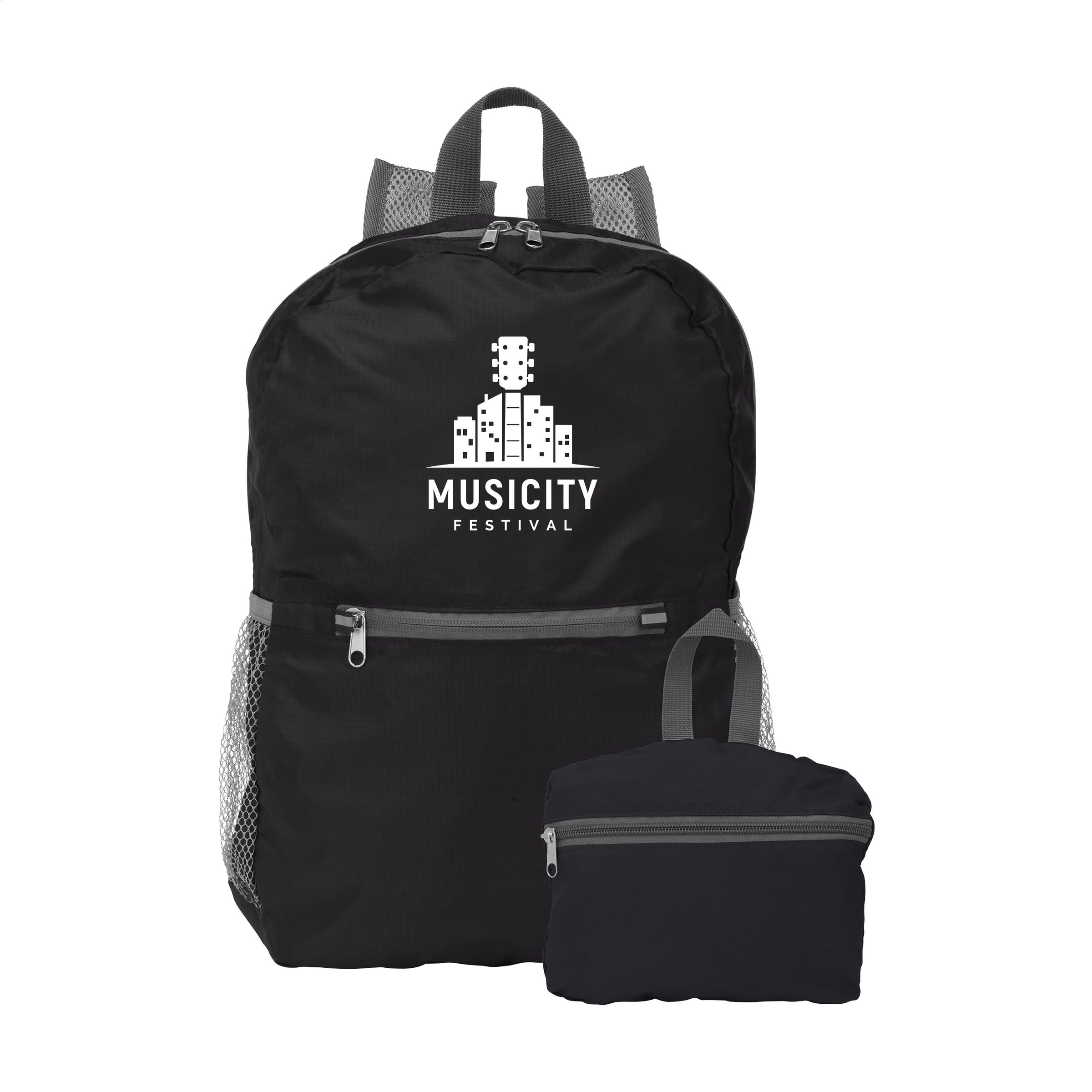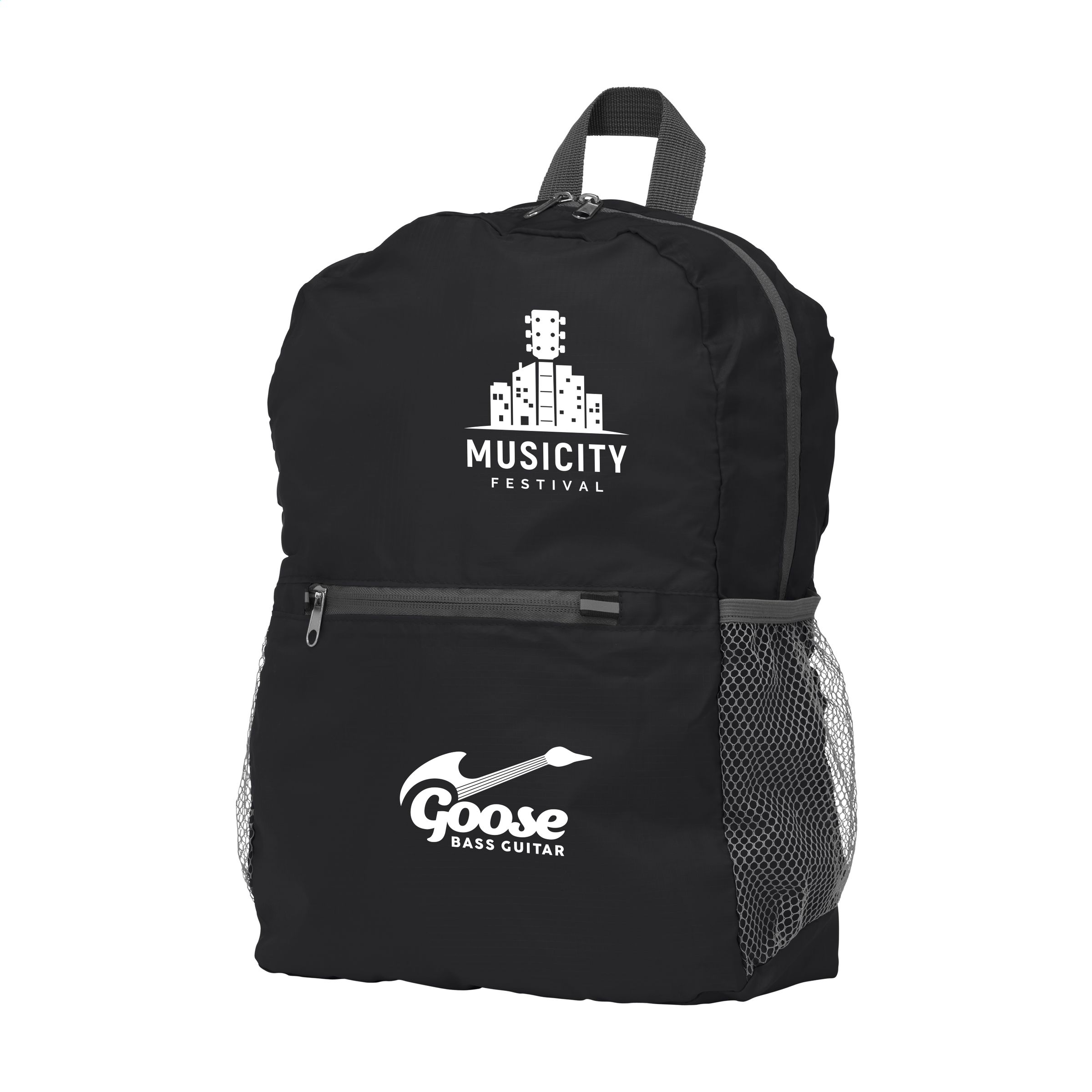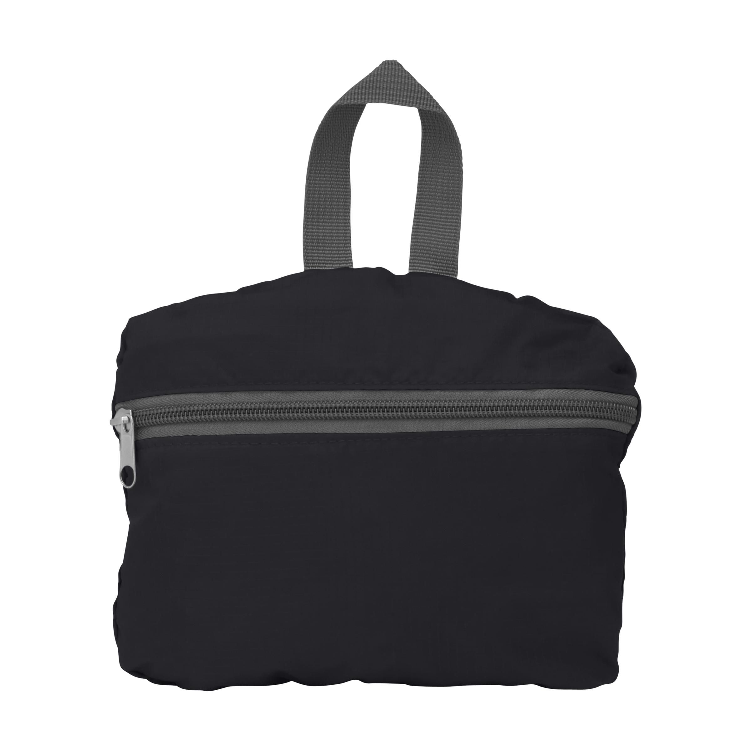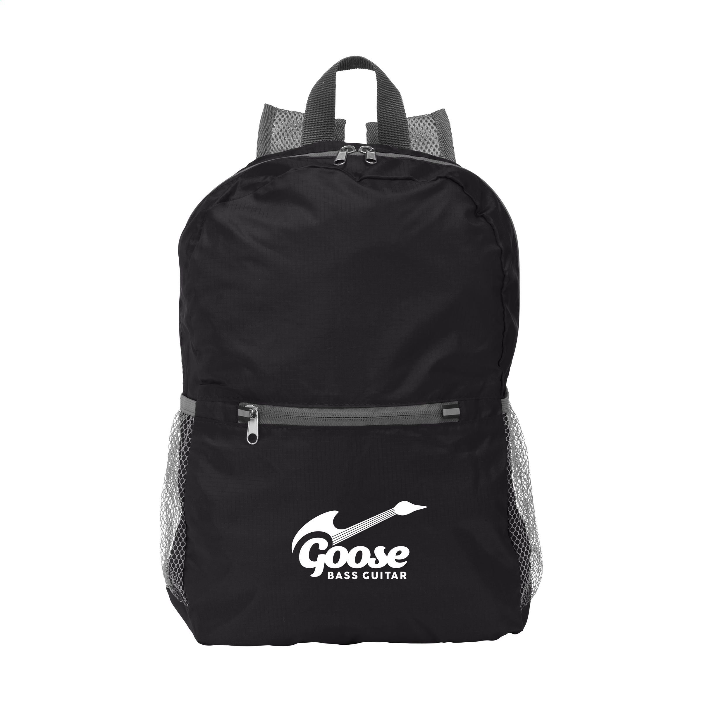 Complete, foldable, lightweight backpack made of strong, durable 190T polyester jacquard. With a front pocket with zip, two mesh pockets, adjustable mesh shoulder straps. Backpack to pouch. Meas. folded 21 x 17 x 3 cm.