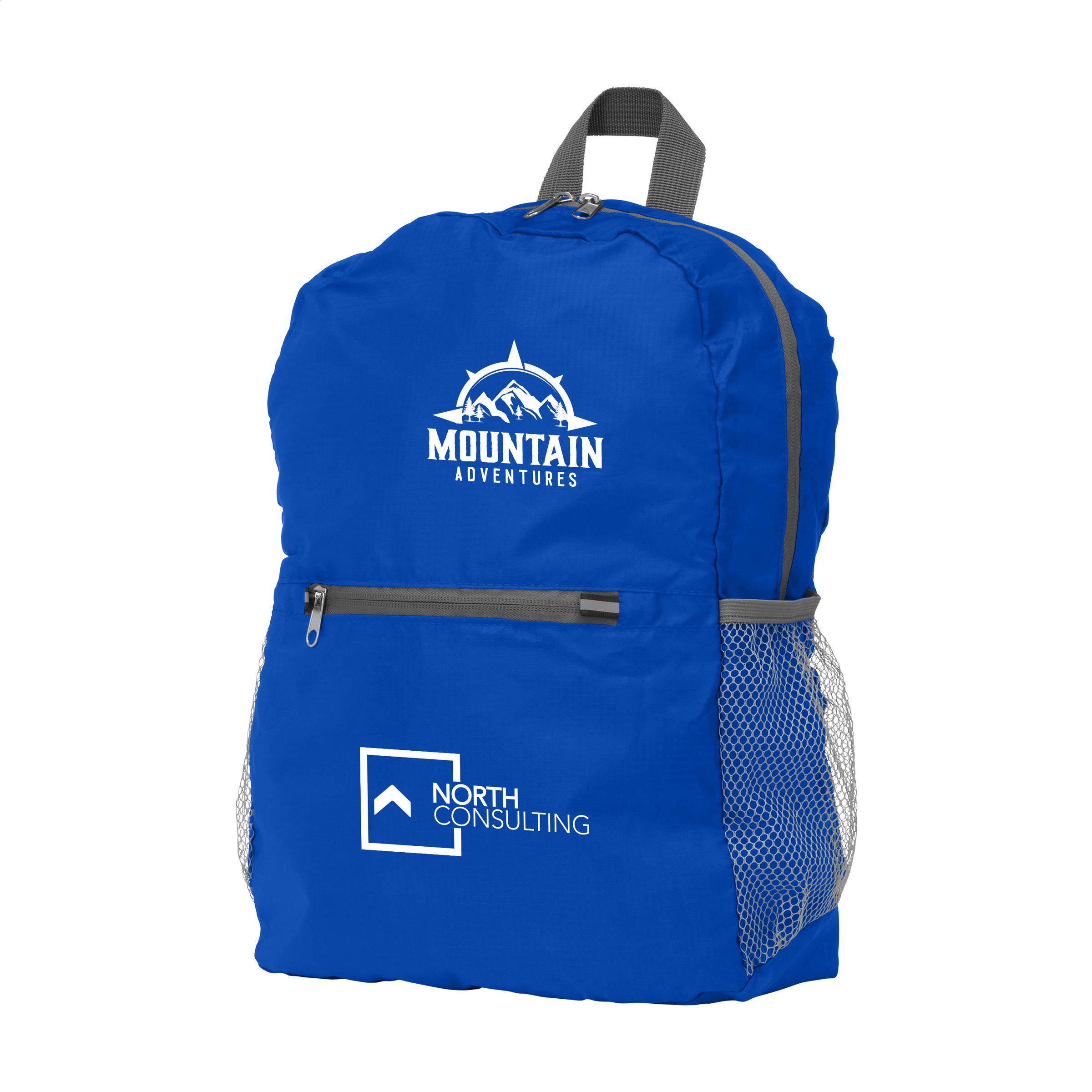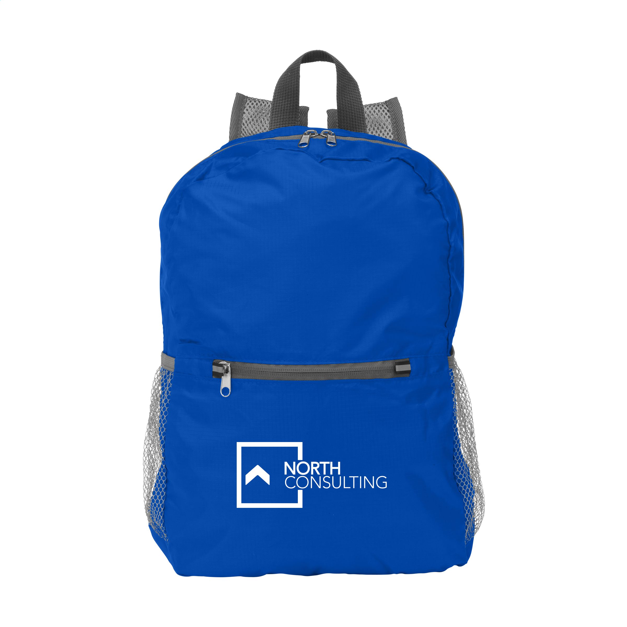 Complete, foldable, lightweight backpack made of strong, durable 190T polyester jacquard. With a front pocket with zip, two mesh pockets, adjustable mesh shoulder straps. Backpack to pouch. Meas. folded 21 x 17 x 3 cm.