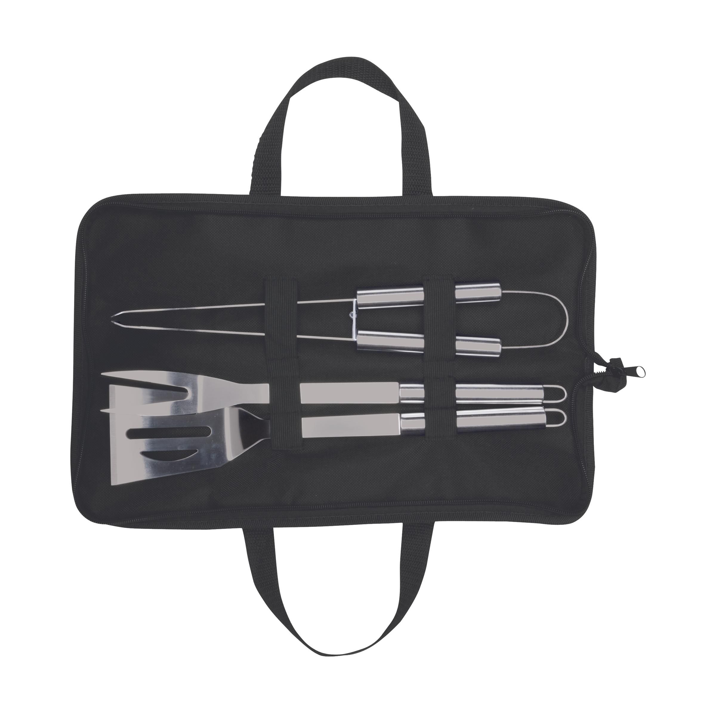 3-piece stainless steel BBQ set: spatula, fork and meat tongs. In a non-woven pouch with an extra 420D nylon pocket on the front. Conforms to EU standard (2004/1935/CE).