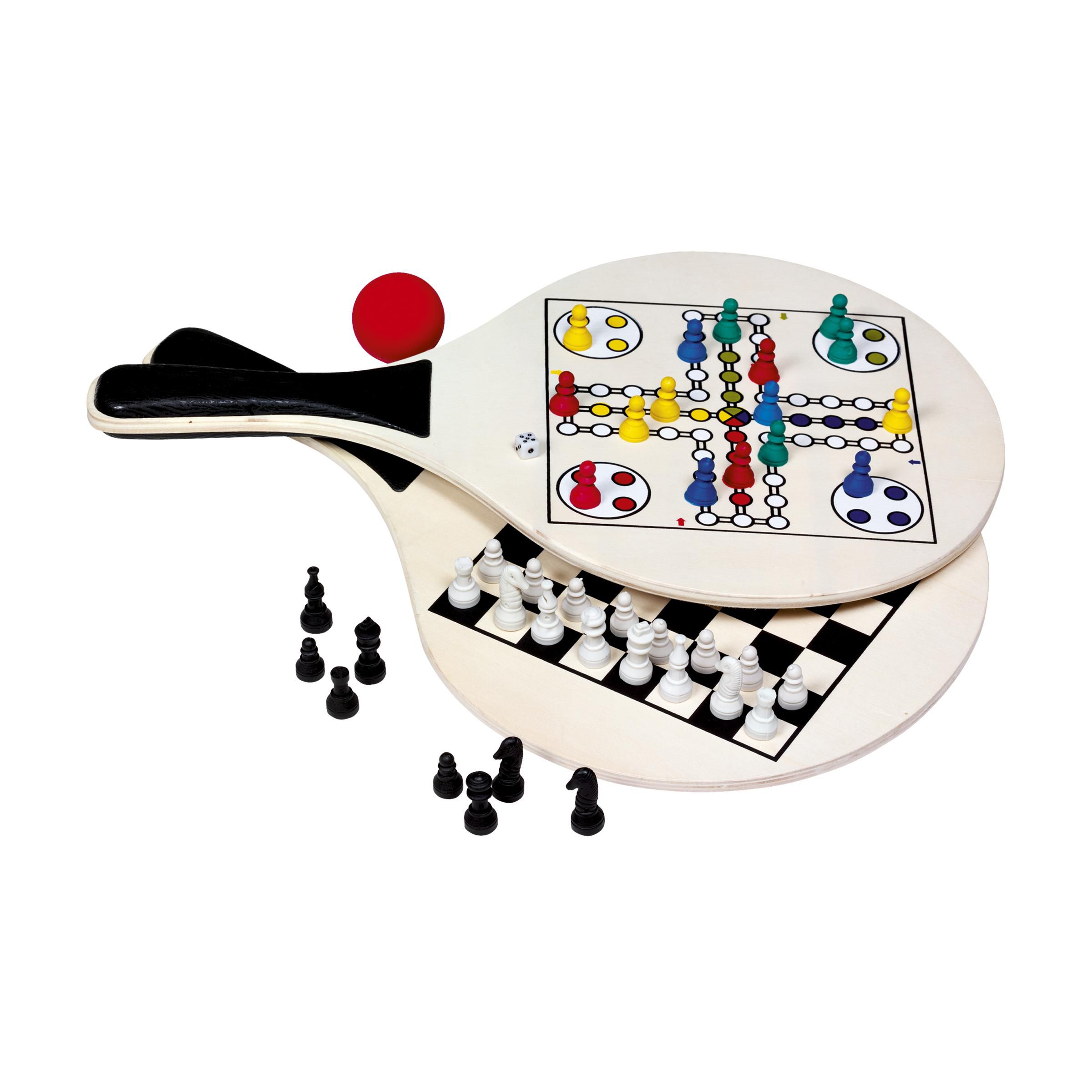 Wooden rackets incorporating 2 board games. Incl. ball and game pieces. In a nylon case.