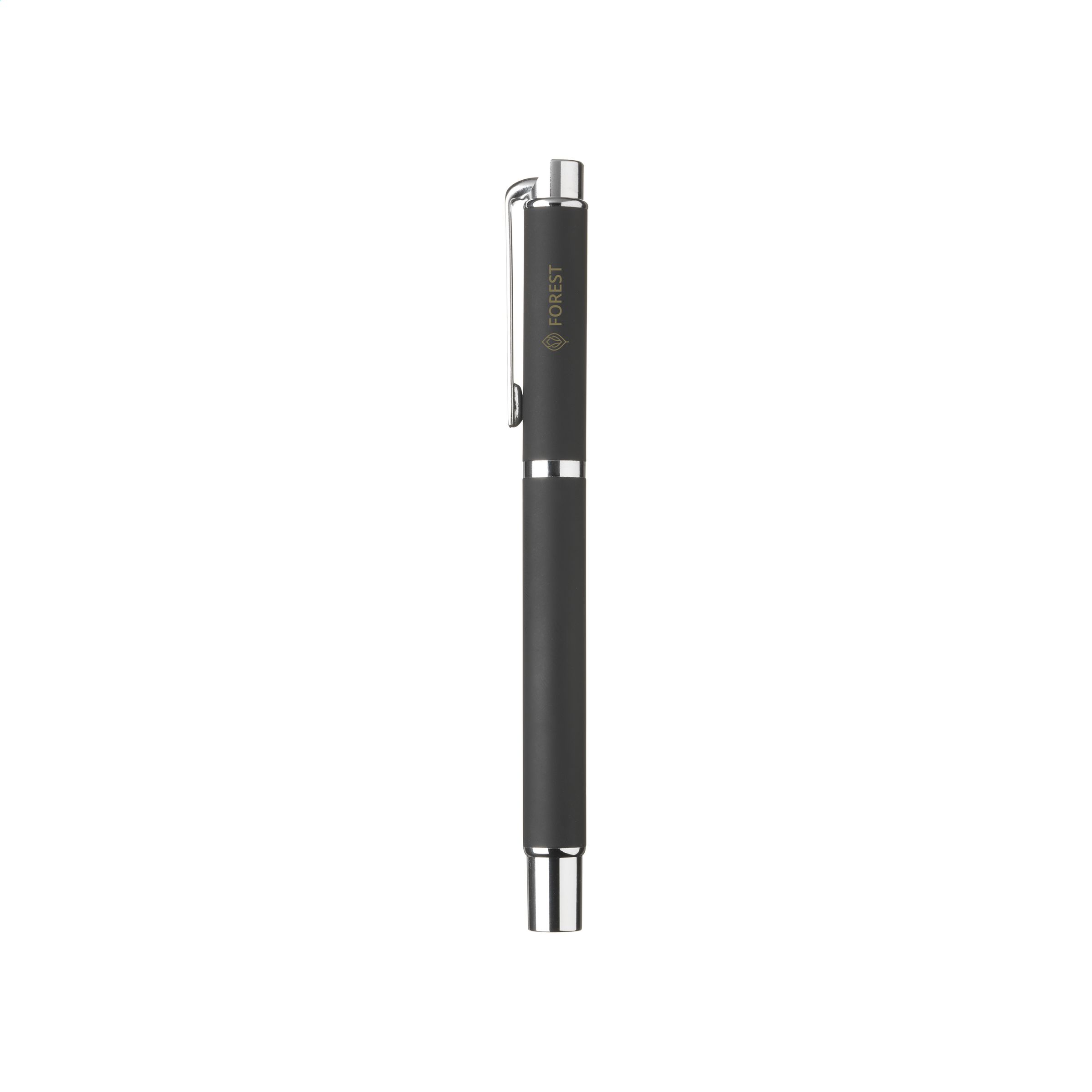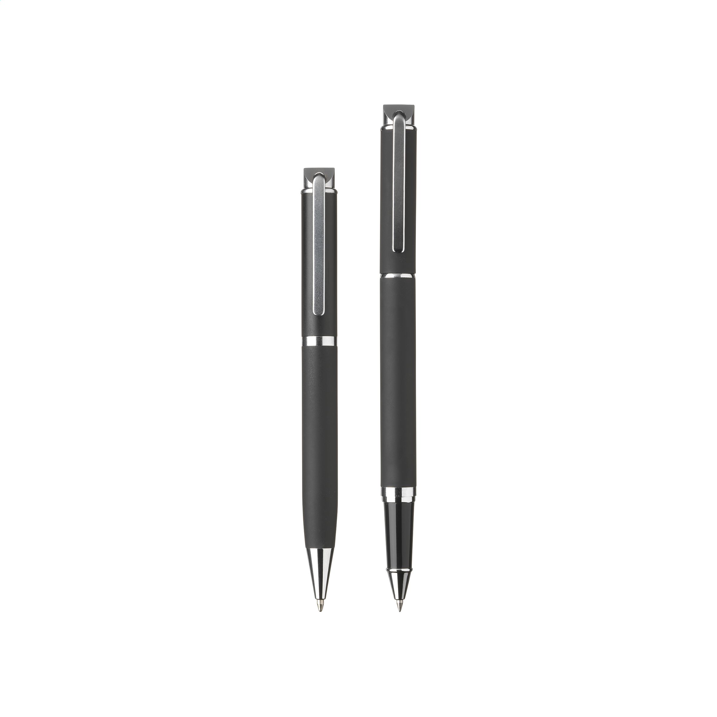 Metal writing set: blue ink pen and rollerpen. Both with stylish rubber feel finish, beautifully designed top with clip and glossy accents. Give your gift more character with our stylish gift packaging.
