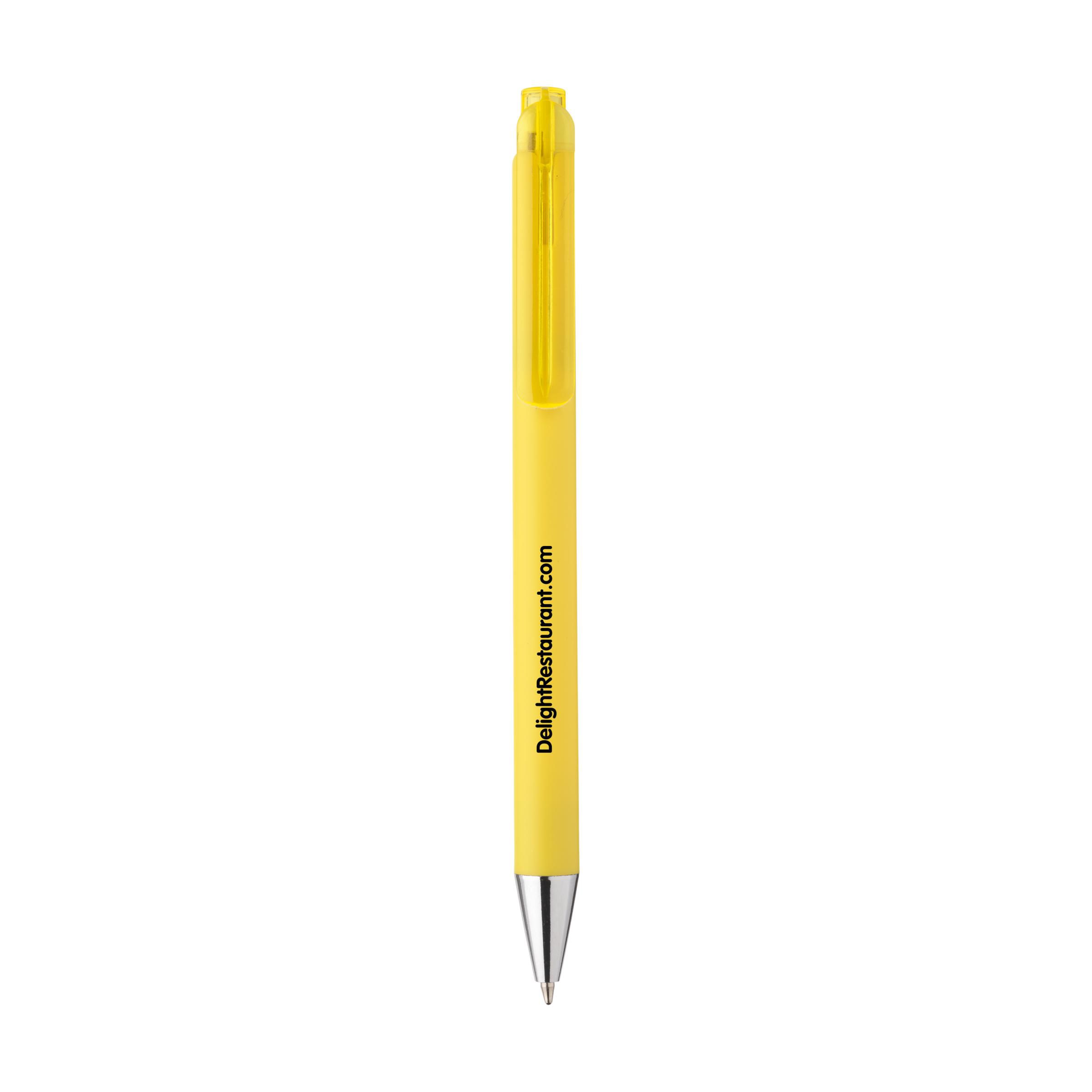 Blue ink ballpoint pen with matte finished holder and transparent coloured clip/push button.