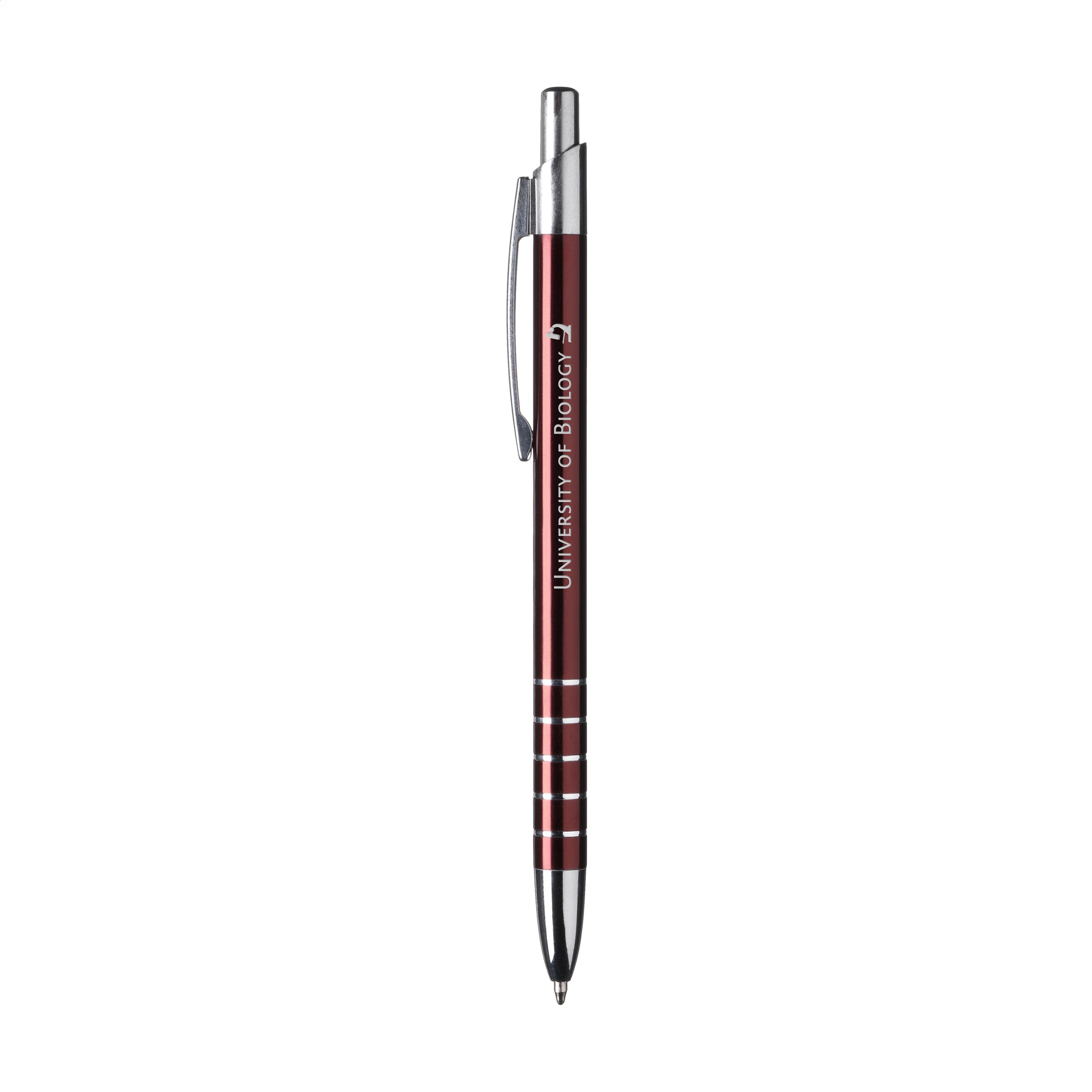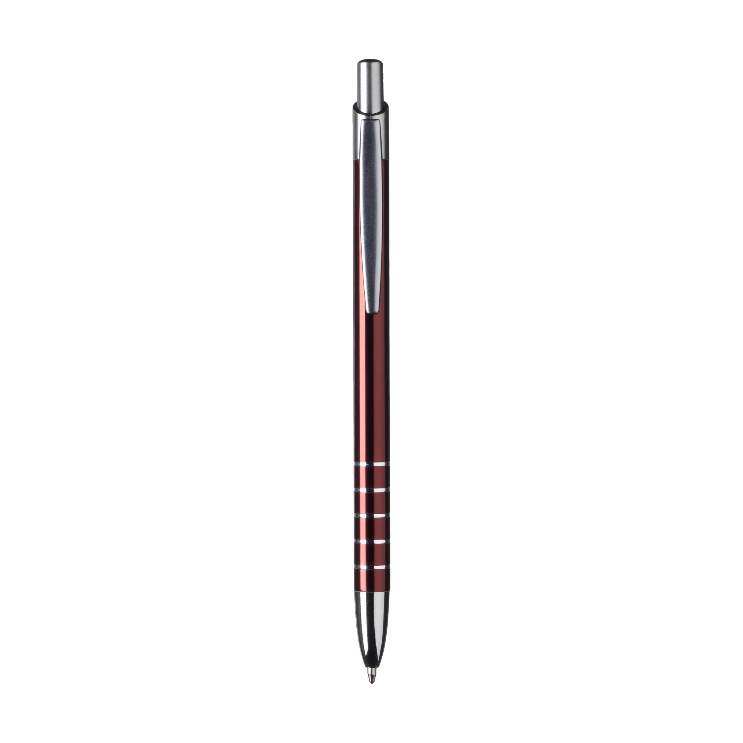 Blue ink ballpoint pen, made from aluminium. With sleek, metallic look barrel, metal clip and barrel rings.