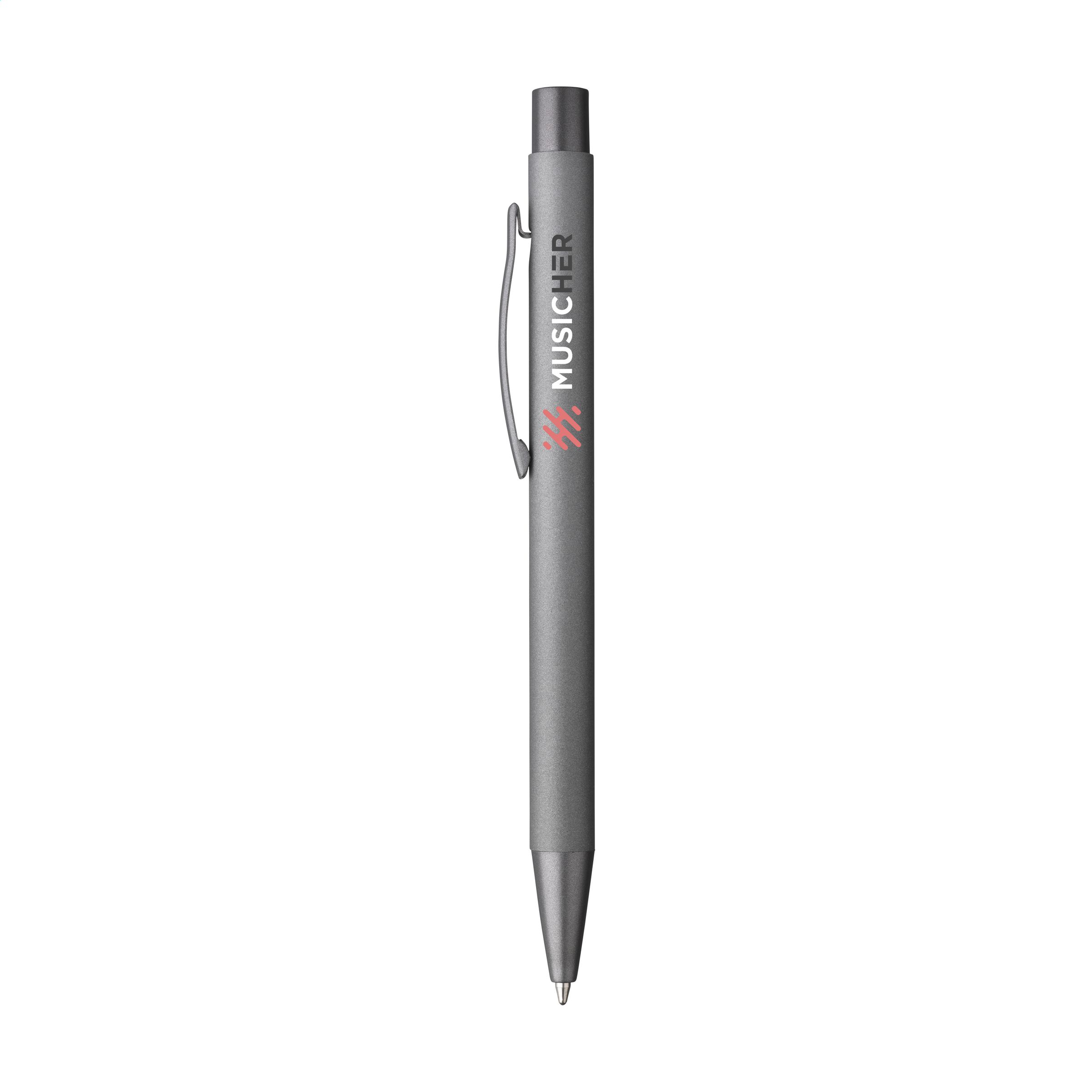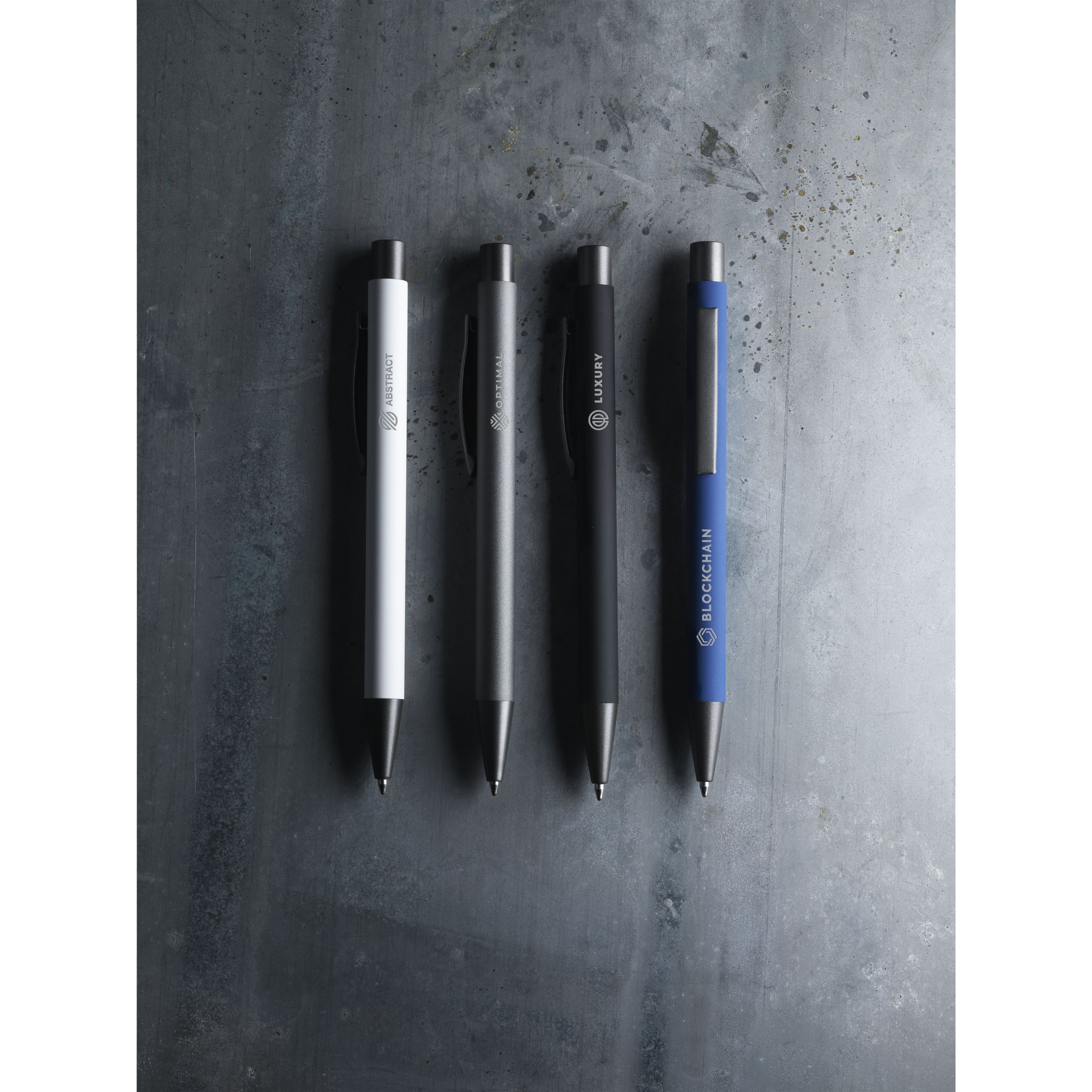 Blue ink, aluminium ballpoint pen with rubberised soft-touch finish, sturdy metal clip and plastic point and push button.
