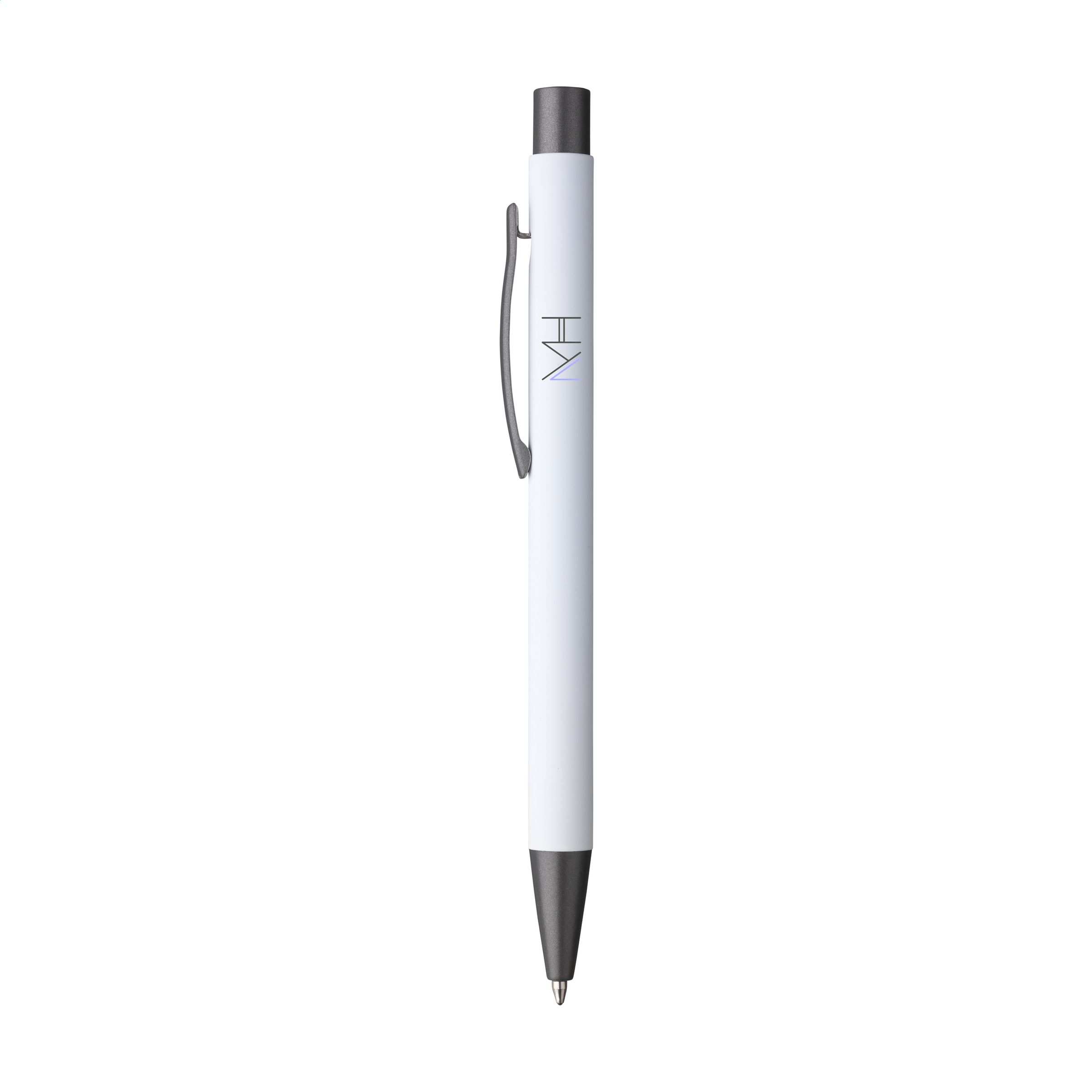 Blue ink, aluminium ballpoint pen with rubberised soft-touch finish, sturdy metal clip and plastic point and push button.