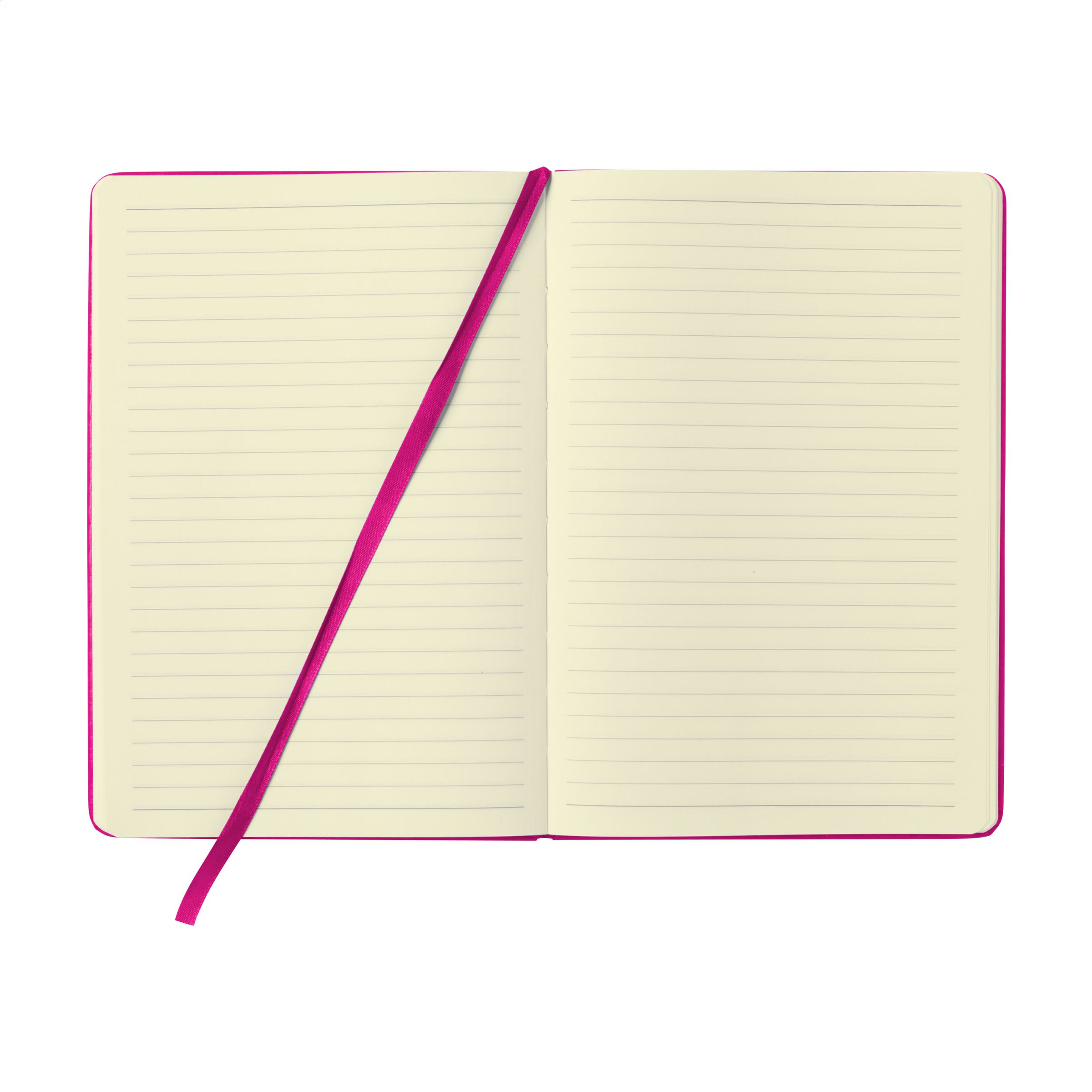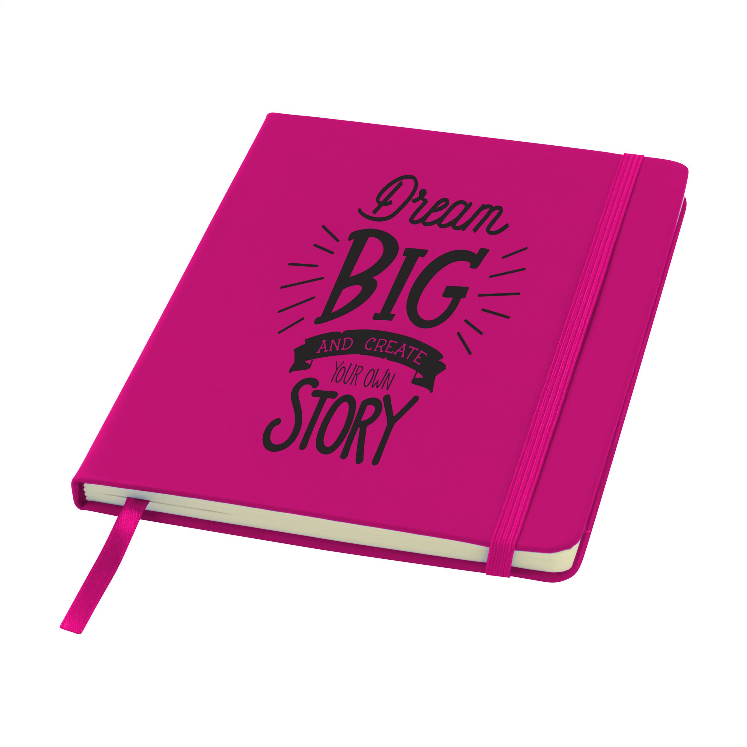 Practical notebook in A5 format. With hard PU cover, approx. 80 blank sheets of cream coloured, lined paper (70 g/m²), elastic closure and ribbon marker.