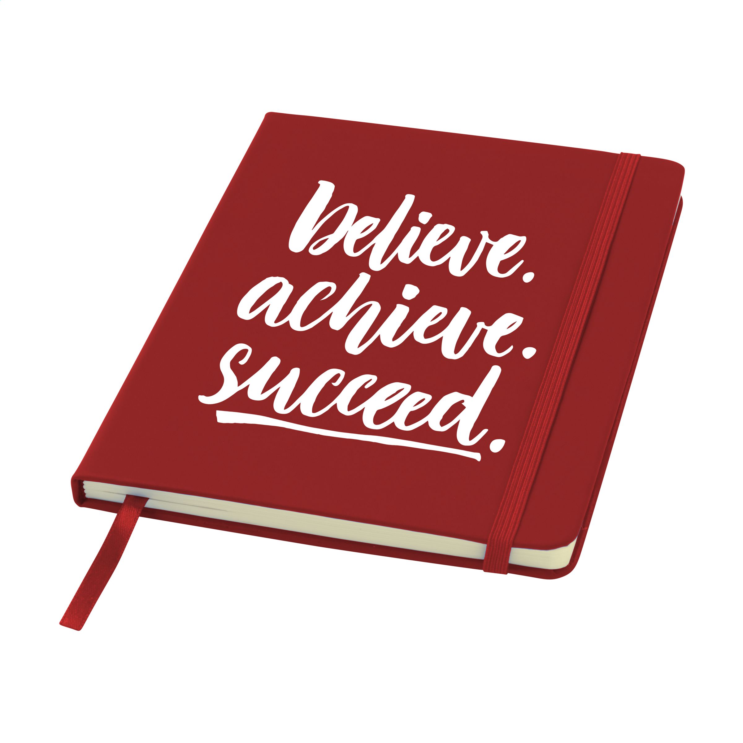 Practical notebook in A5 format. With hard PU cover, approx. 80 blank sheets of cream coloured, lined paper (70 g/m²), elastic closure and ribbon marker.
