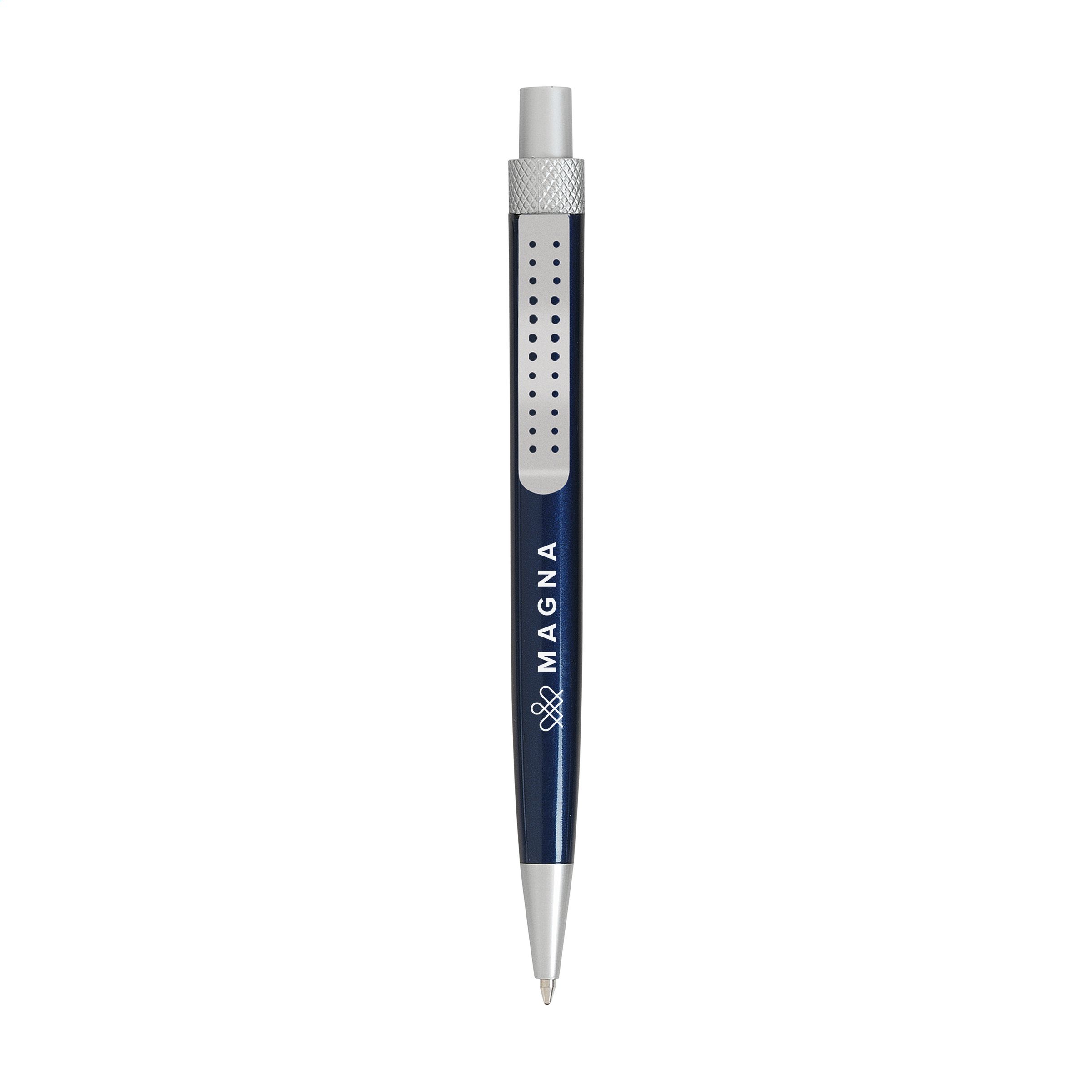 Blue ink ballpoint pen with metallic look barrel and perforated metal clip.
