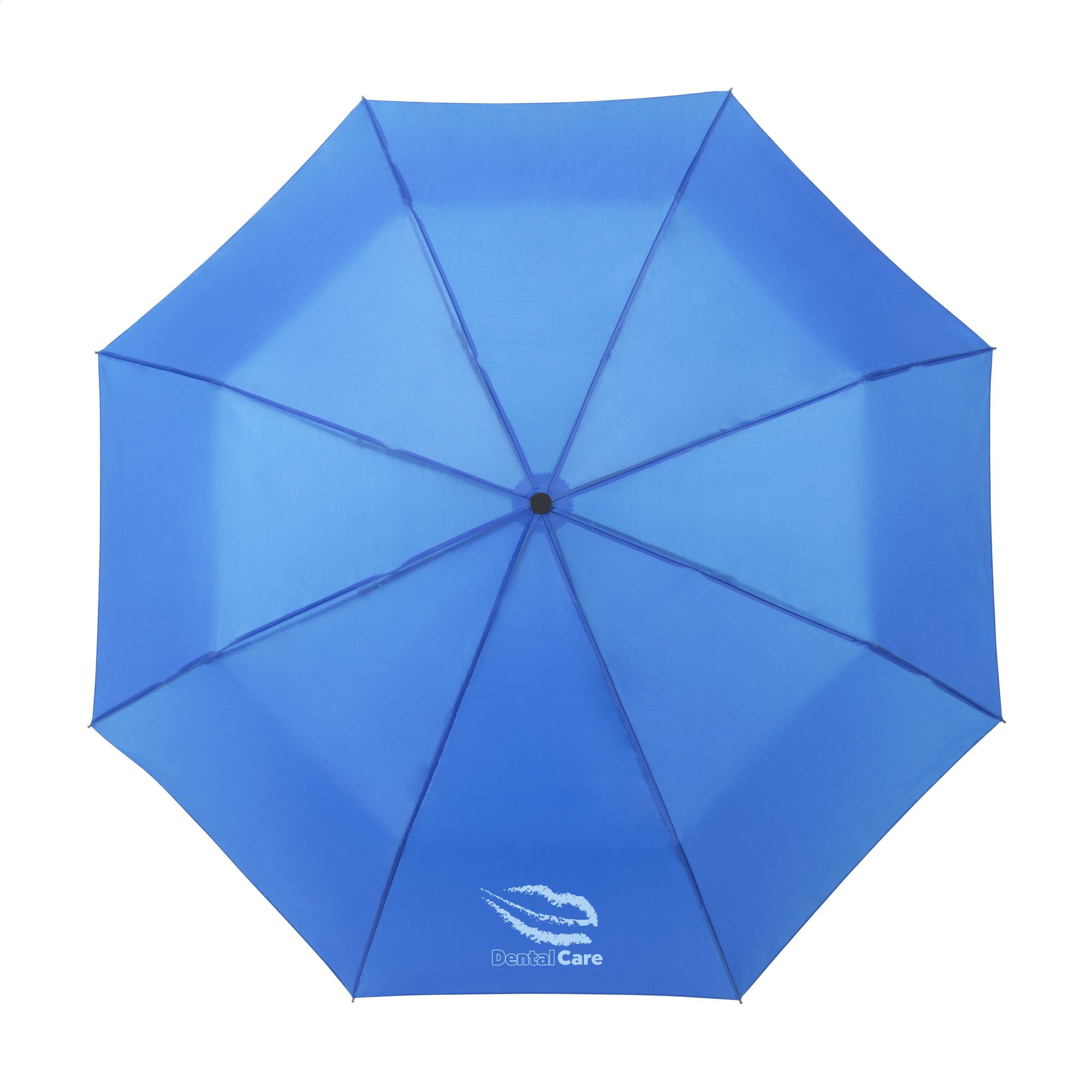 Compact, collapsible umbrella with 190T polyester canopy. Metal frame and shaft, plastic grip with loop, velcro fastening and storage bag. Manual operation.