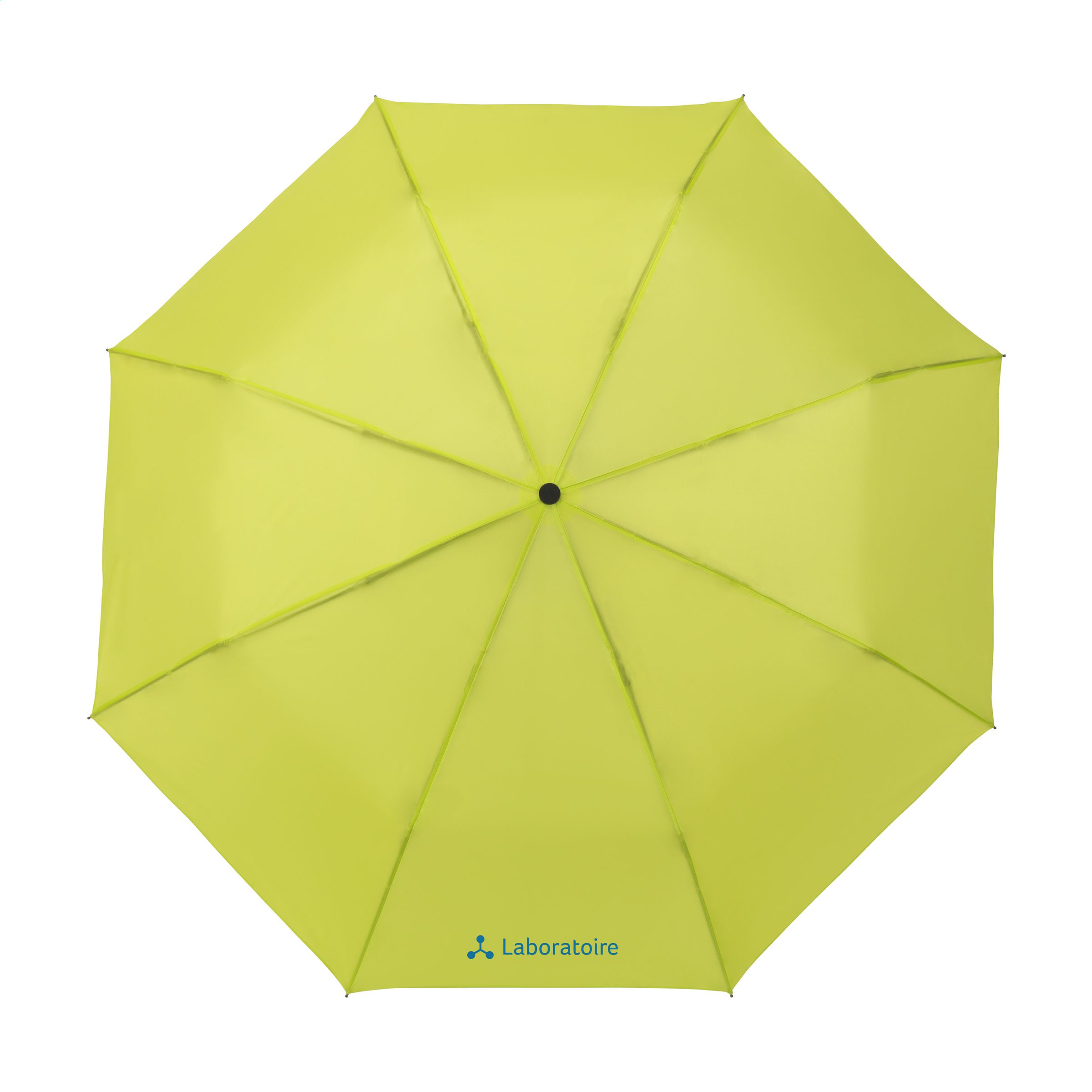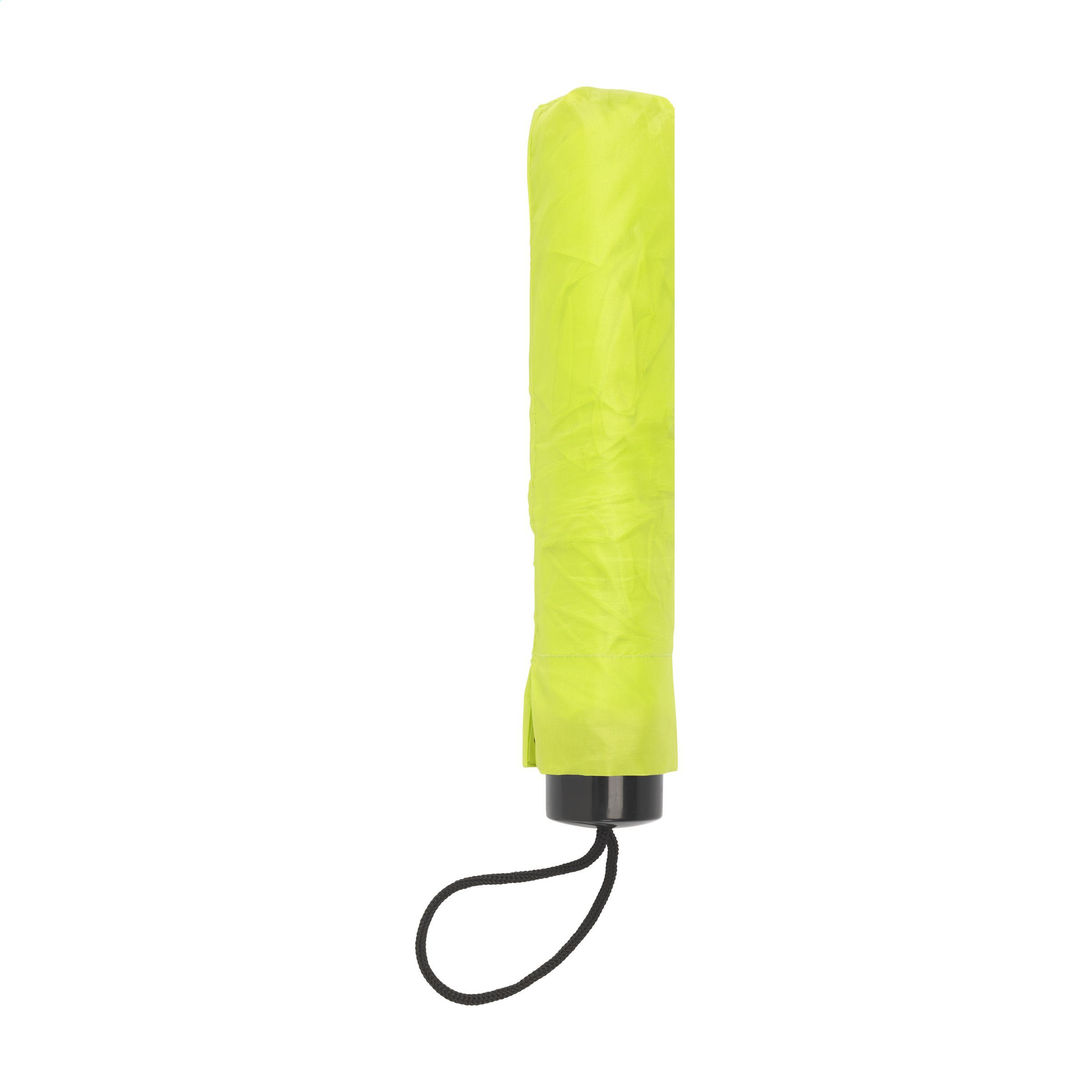 Compact, collapsible umbrella with 190T polyester canopy. Metal frame and shaft, plastic grip with loop, velcro fastening and storage bag. Manual operation.
