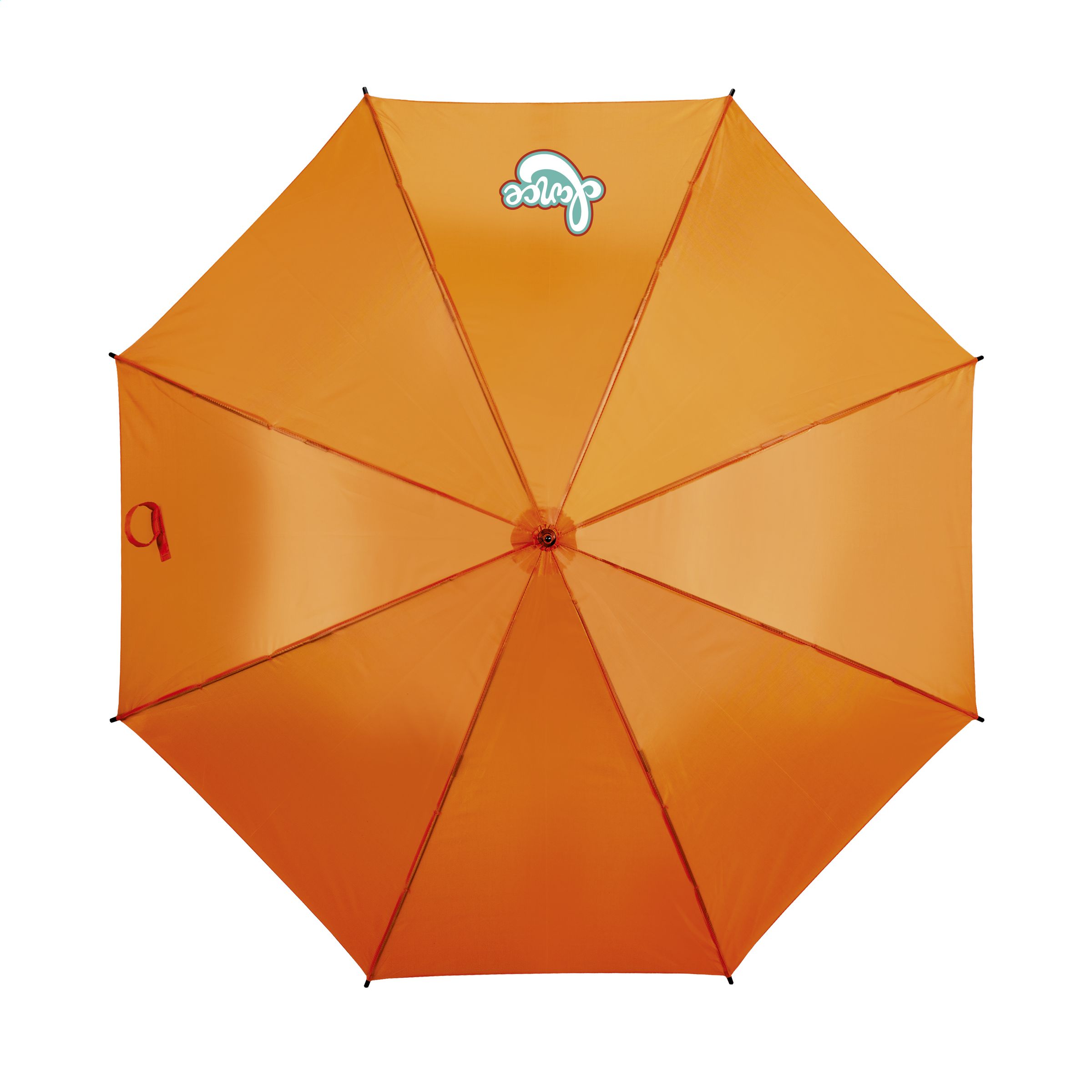 Umbrella with automatic telescopic opening. 190T polyester canopy, fibreglass frame, metal stem, velcro closure and classic curved handle.
