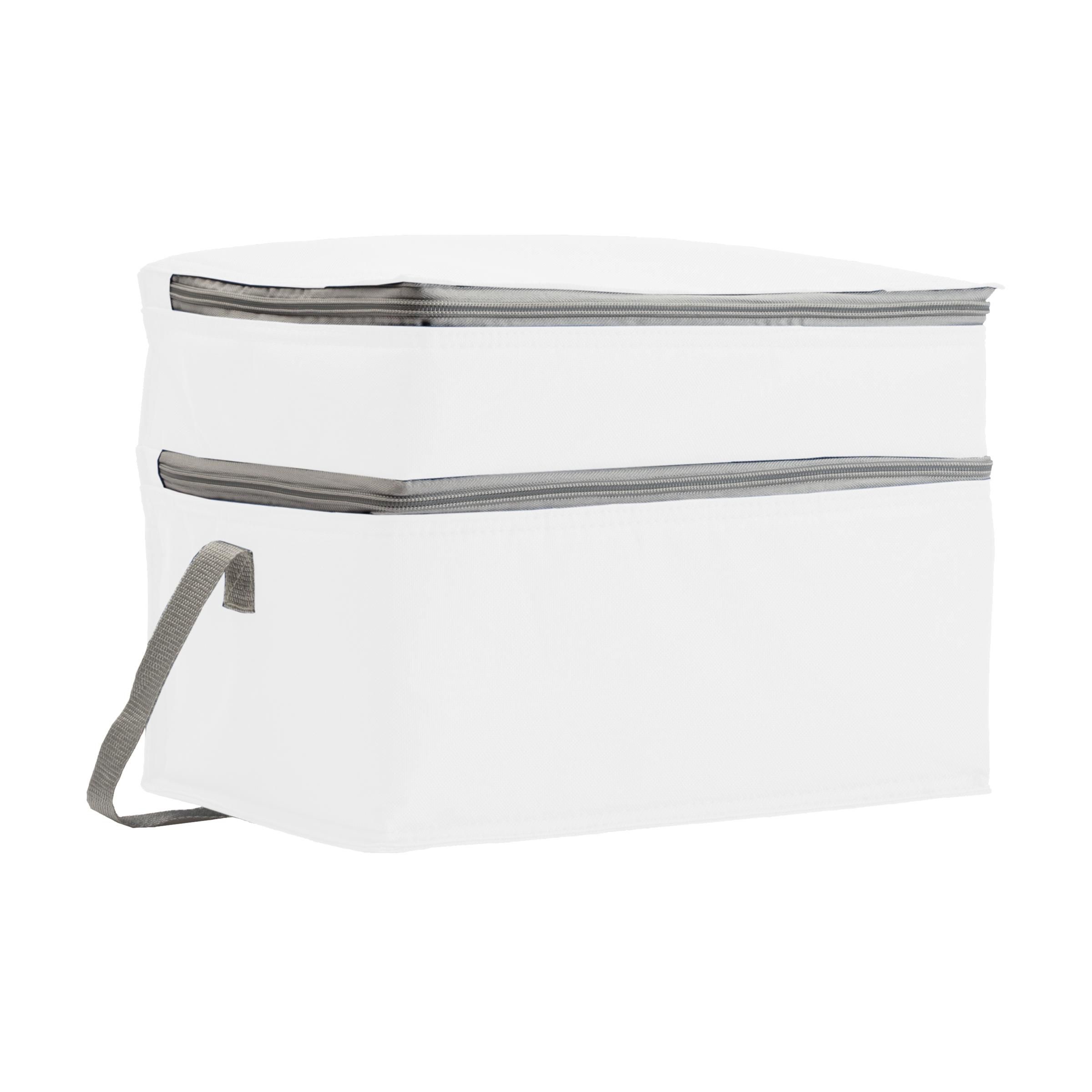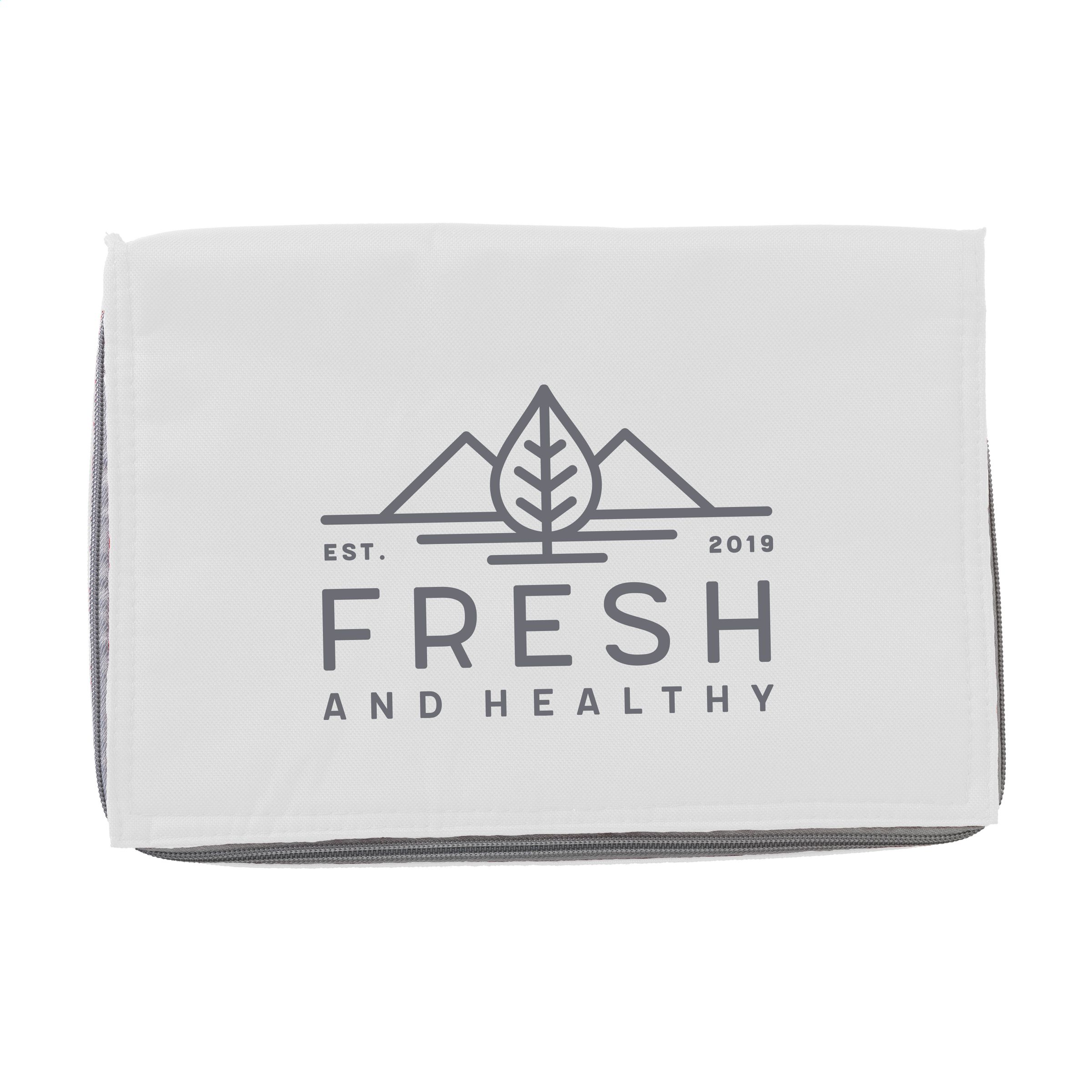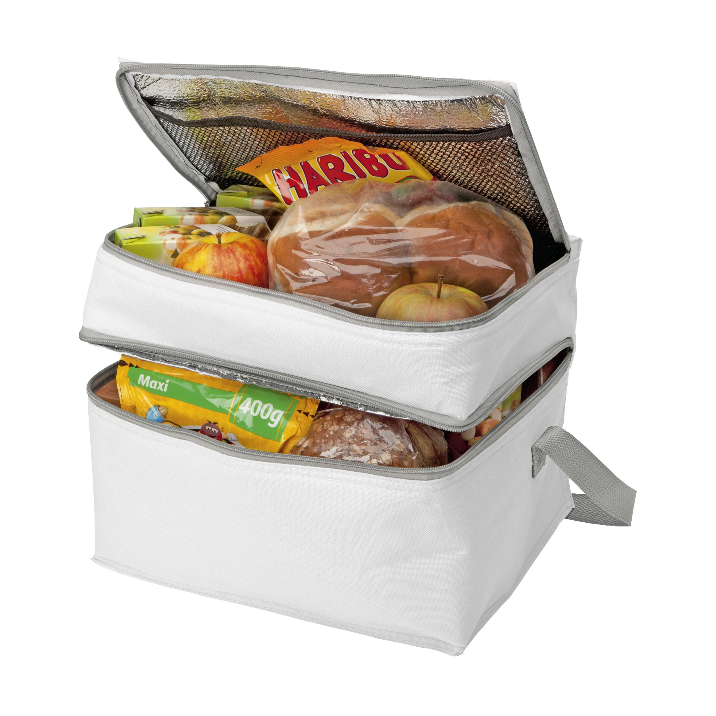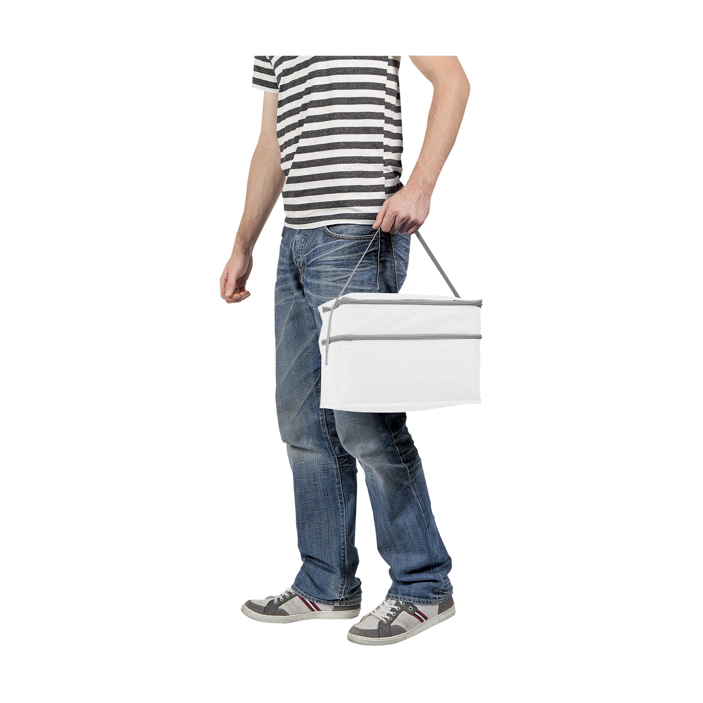 600D polyester bag with large cooler compartment, extra cooler section with mesh pocket and strap.