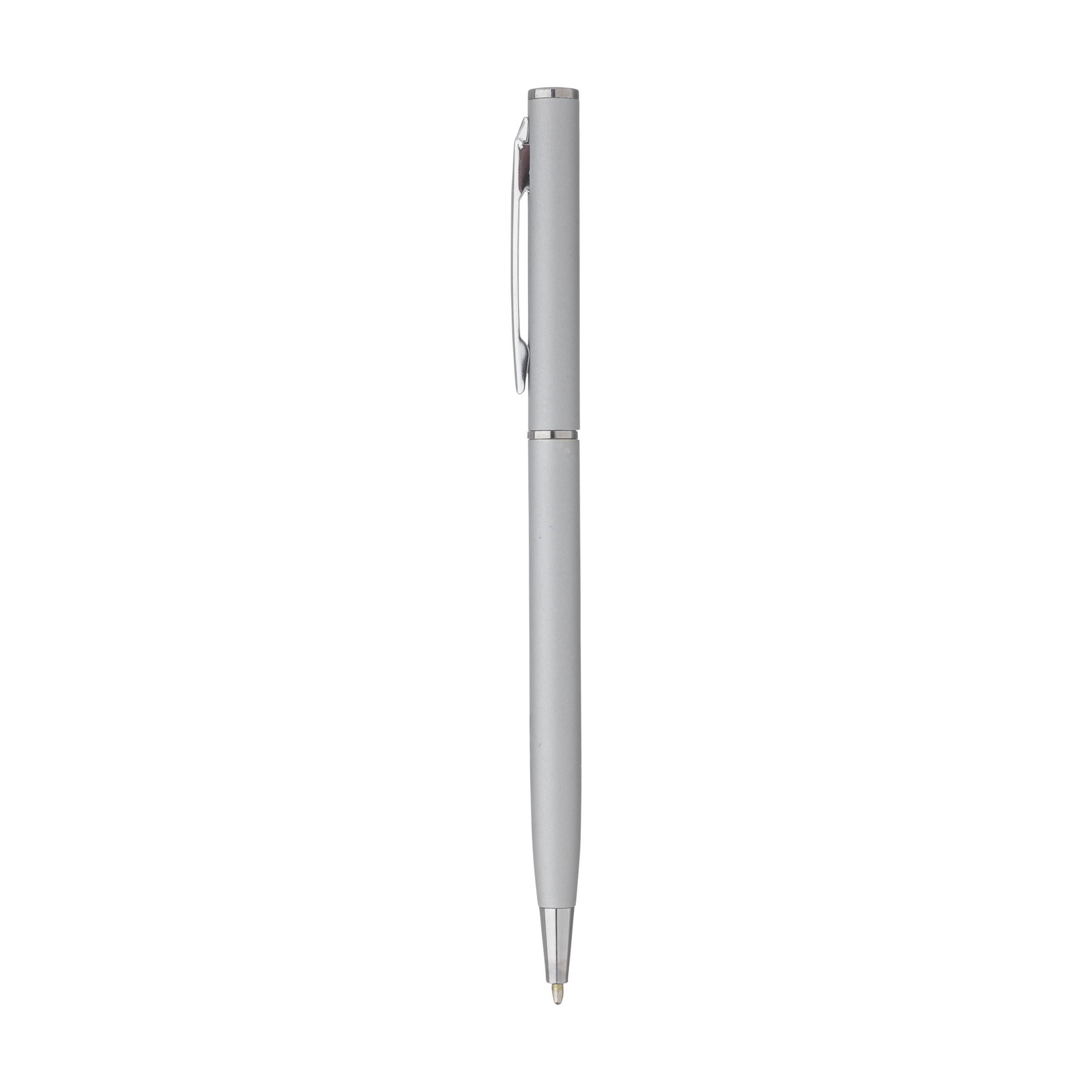 Blue ink, aluminium ballpoint pen with slim barrel. With rubberised finish, twist mechanism and metal clip, tip, ring and top.