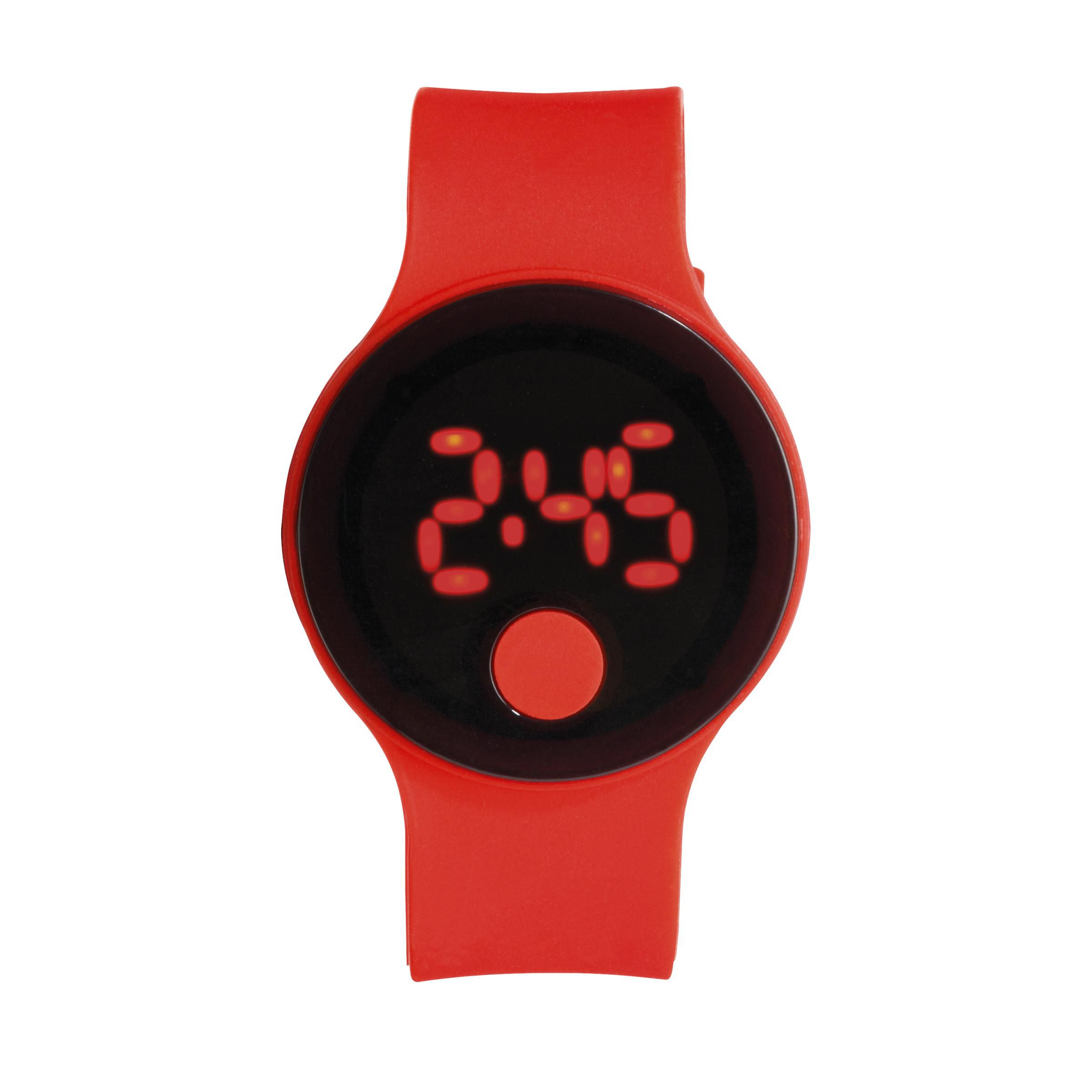 Digital touch watch with silicone wristband. With the press of a button the time, date or seconds will appear in red LED light on the display.