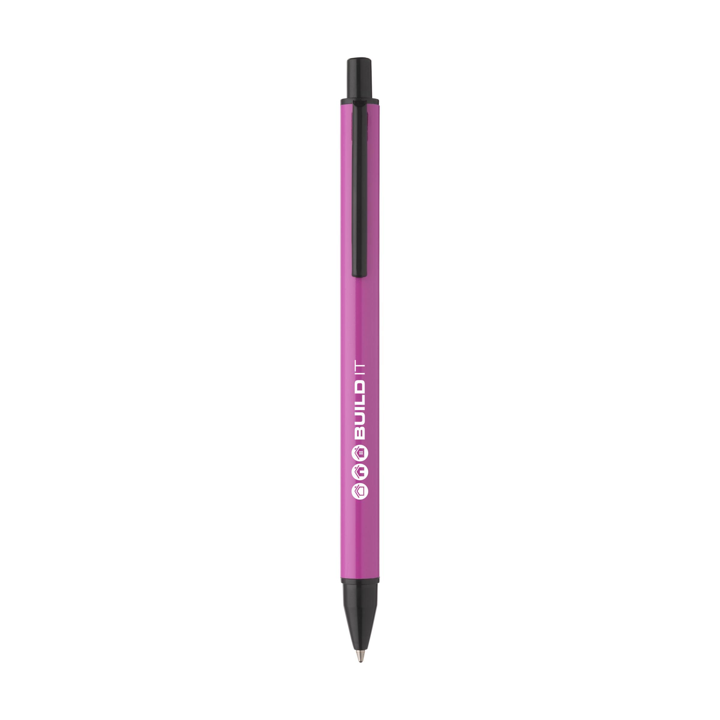 Blue ink, aluminium ballpoint pen with black accents, metal clip and sleek design.