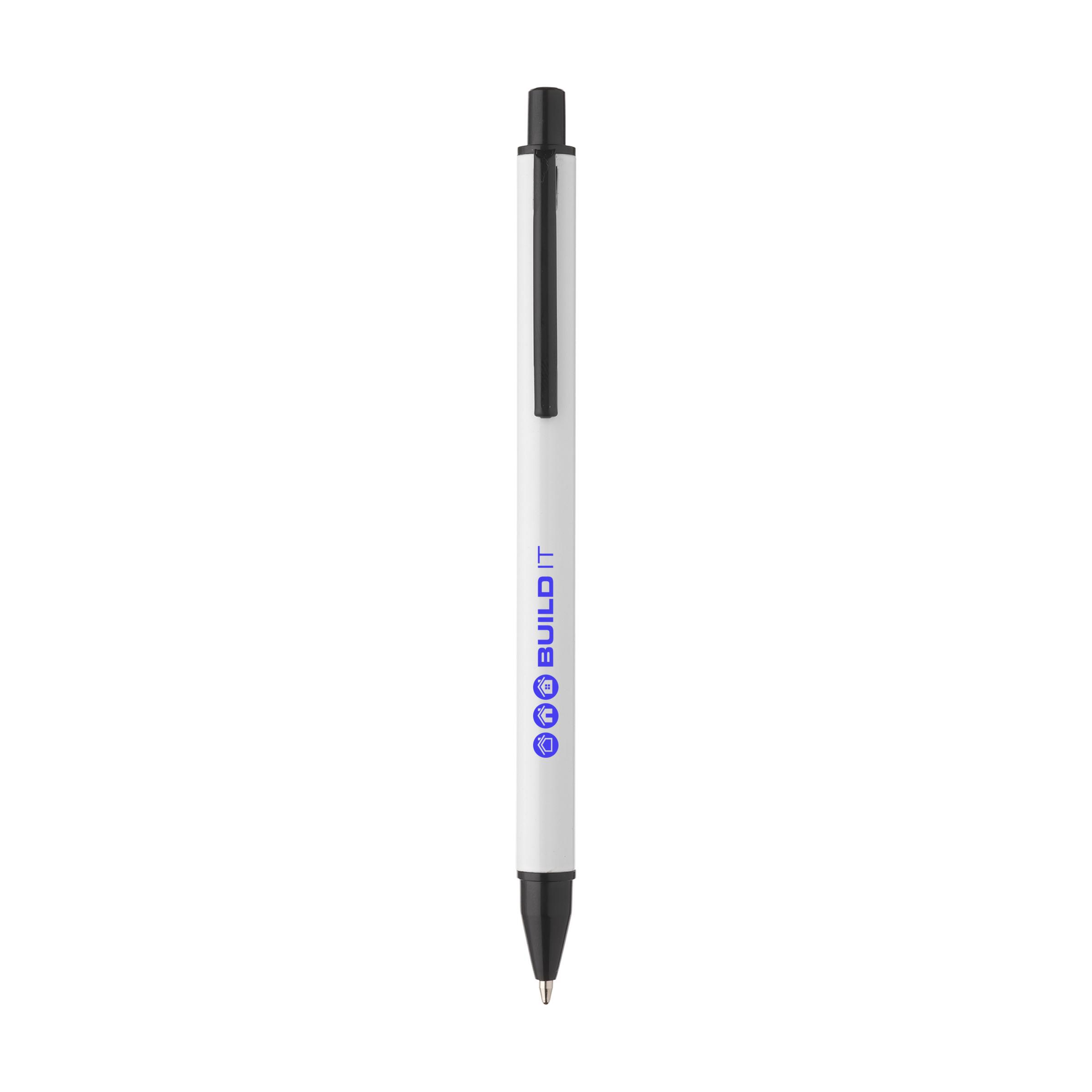 Blue ink, aluminium ballpoint pen with black accents, metal clip and sleek design.
