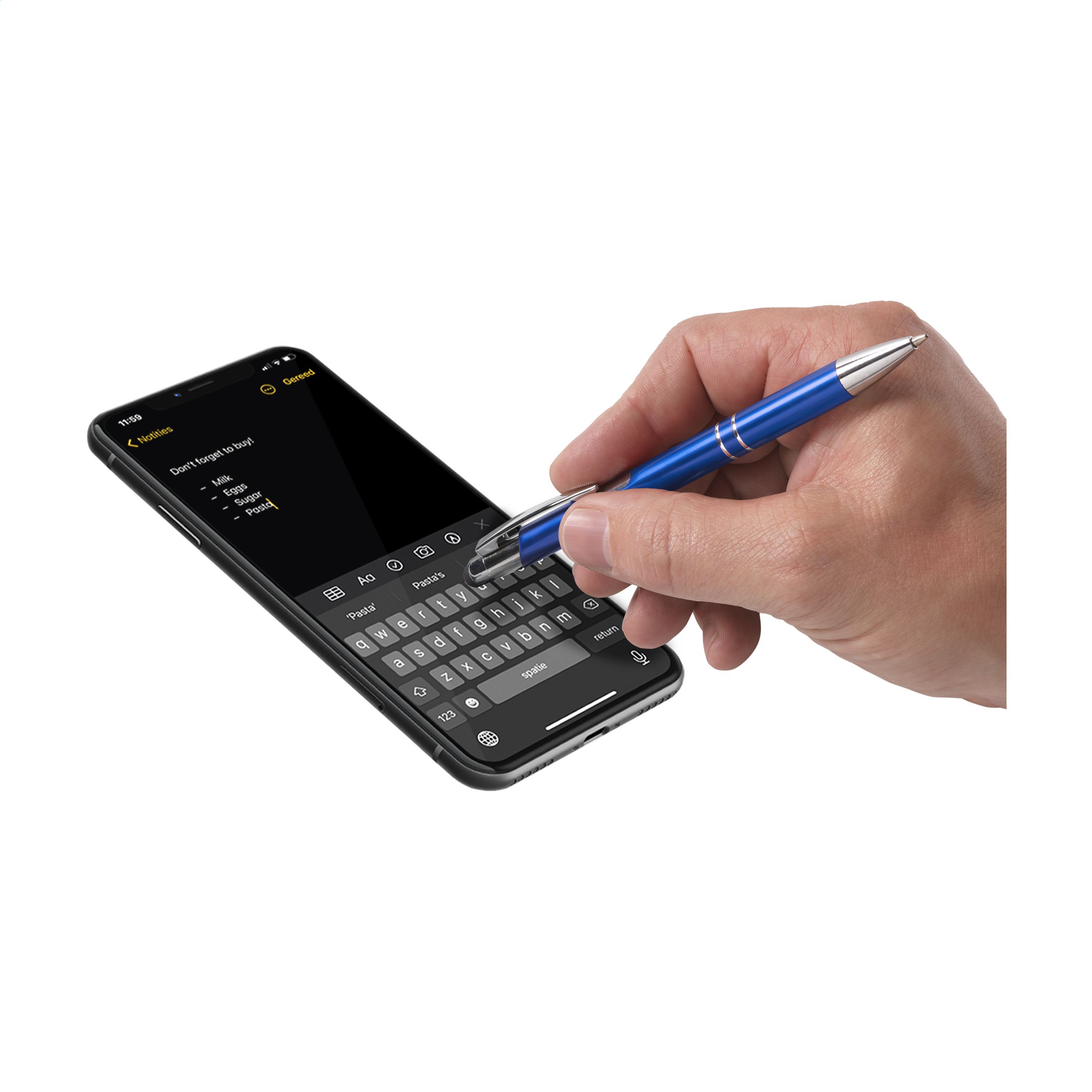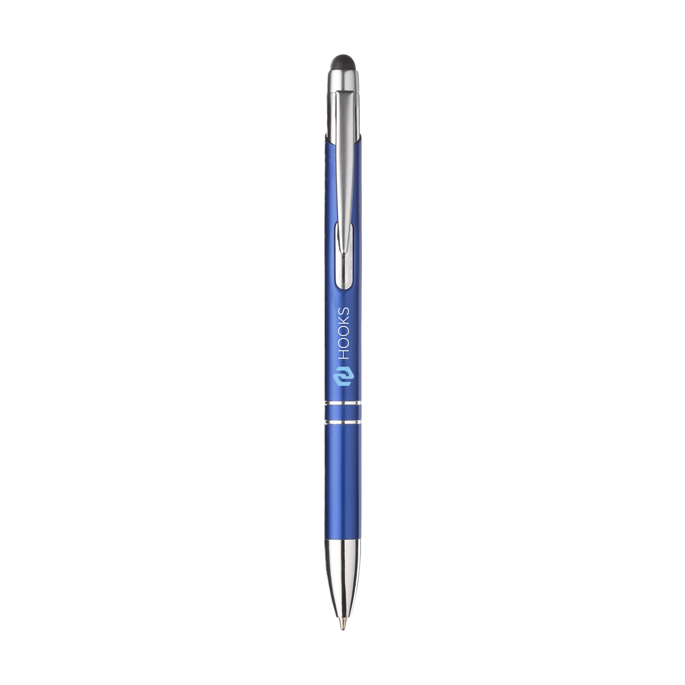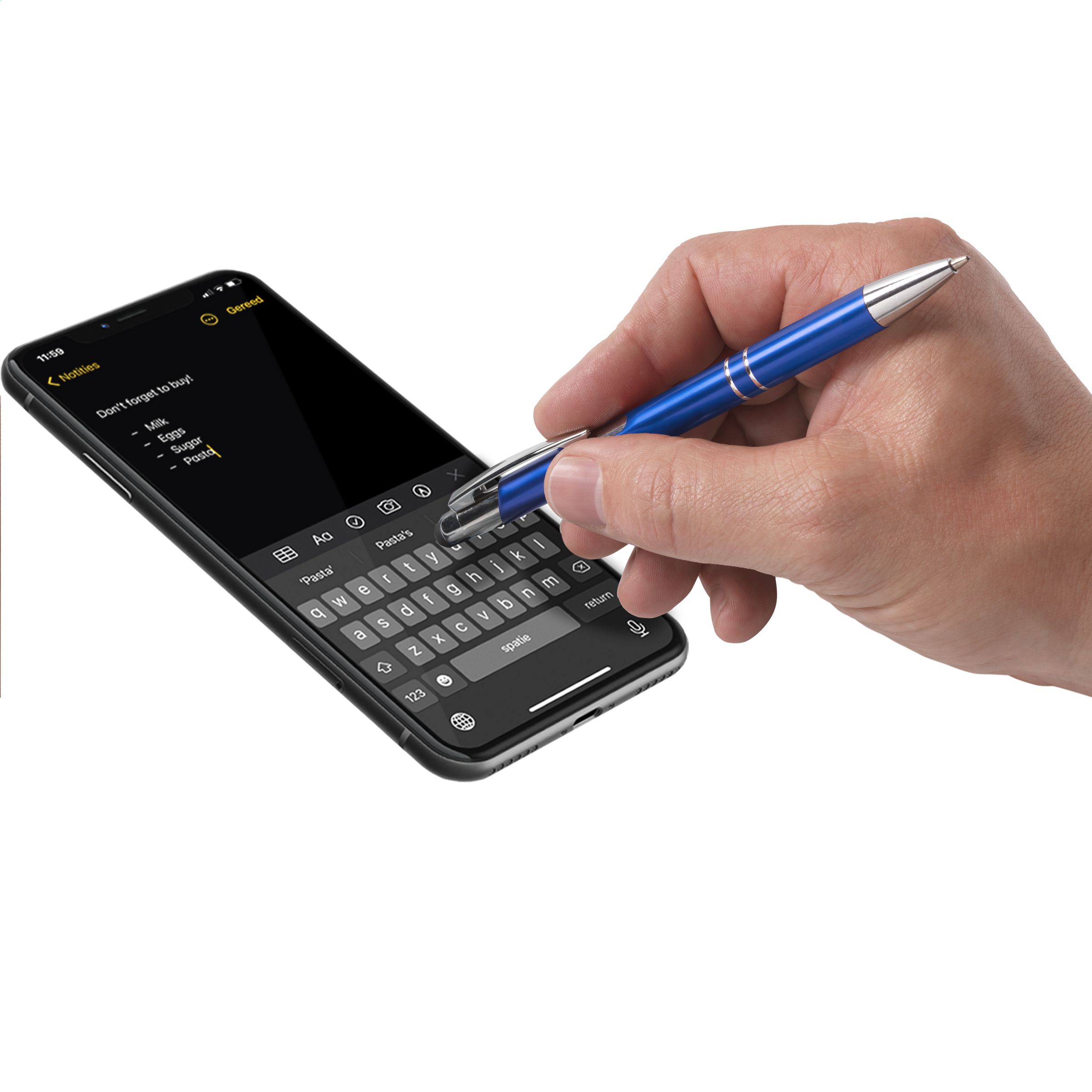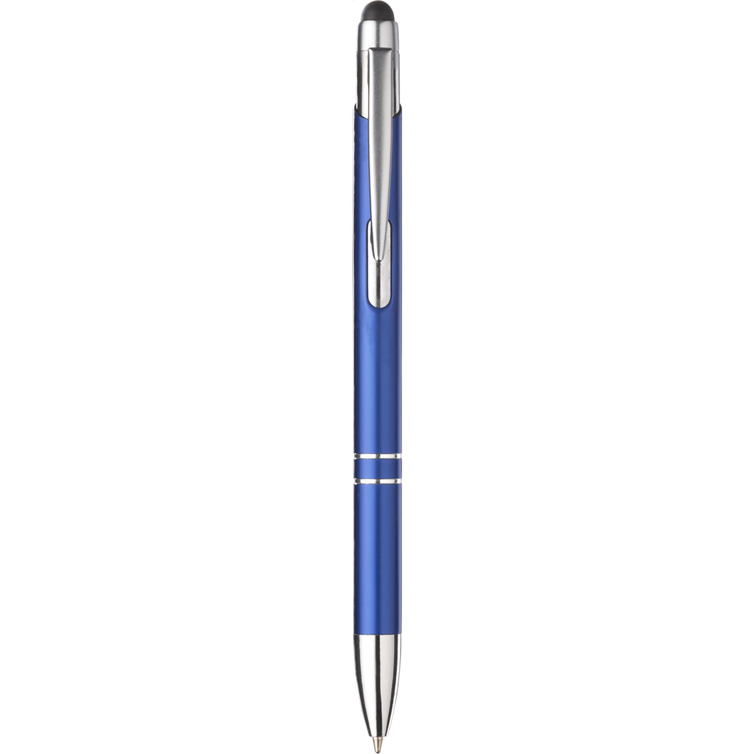 Blue ink, aluminium ballpoint pen with rubber top/pointer to operate touch screens (e.g. iPhone/iPad), matte coloured, metallic look barrel and metal clip.