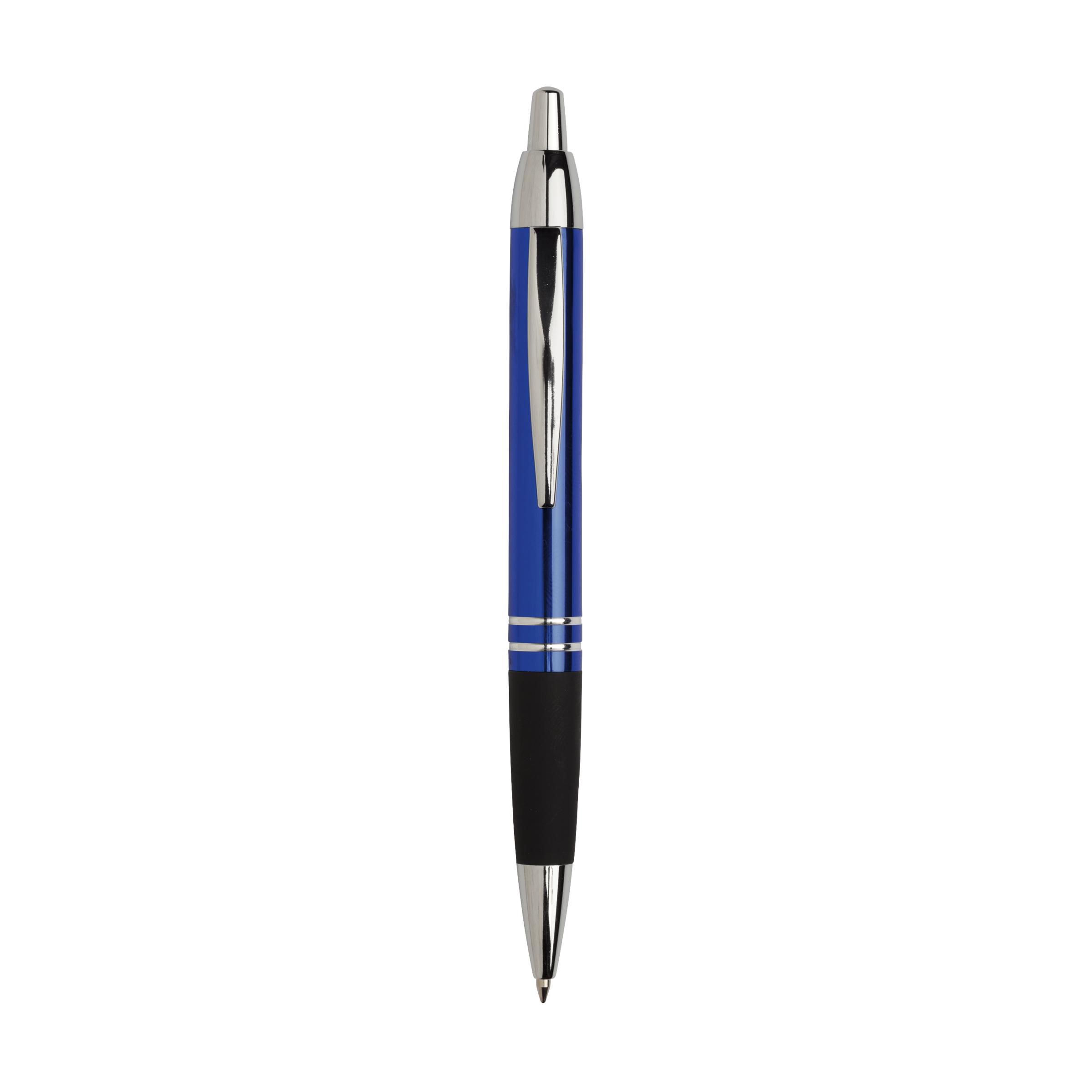 Blue ink metal ballpoint pen with glossy metallic look barrel, rubber grip, sturdy metal clip, push button and silver glossy accents.