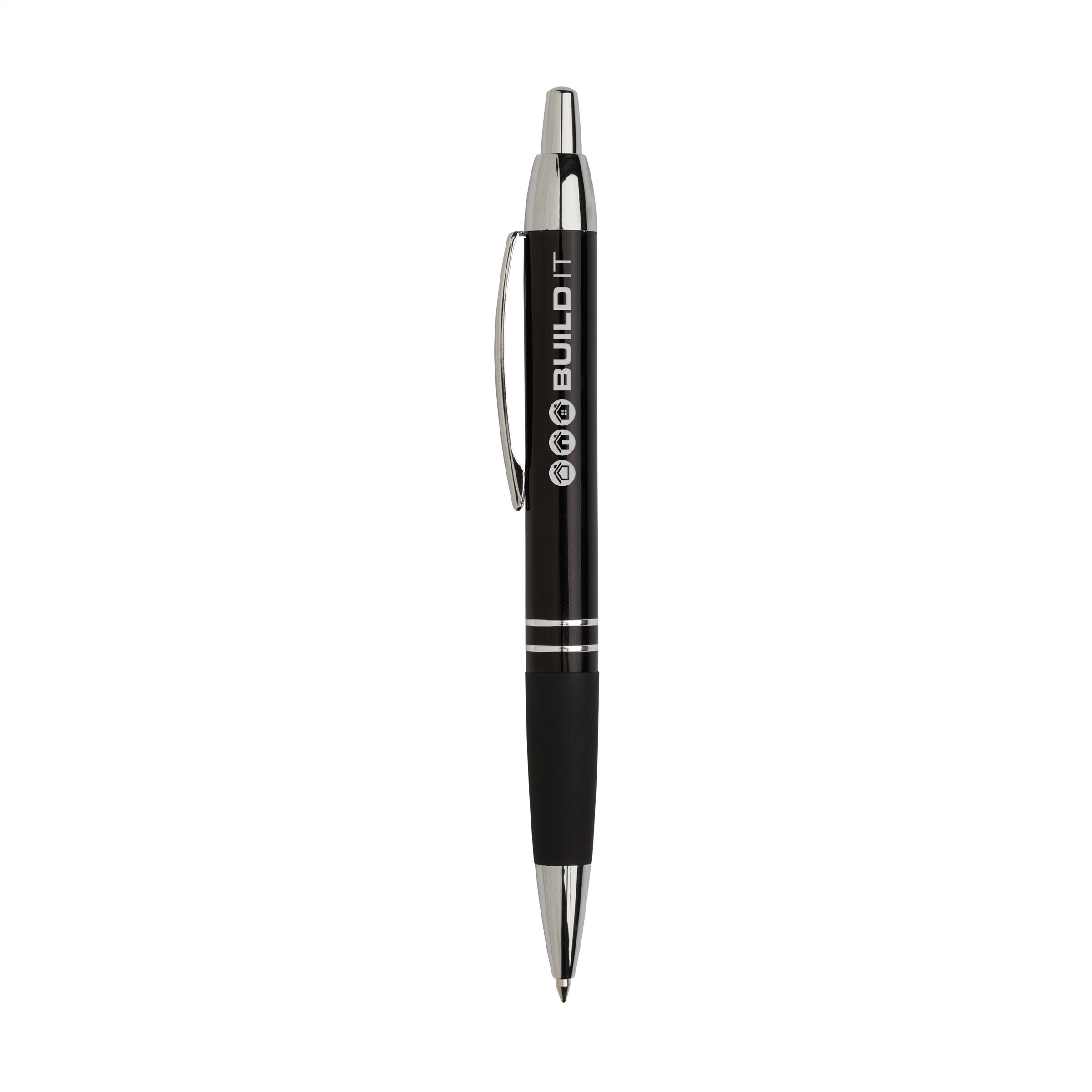 Blue ink metal ballpoint pen with glossy metallic look barrel, rubber grip, sturdy metal clip, push button and silver glossy accents.