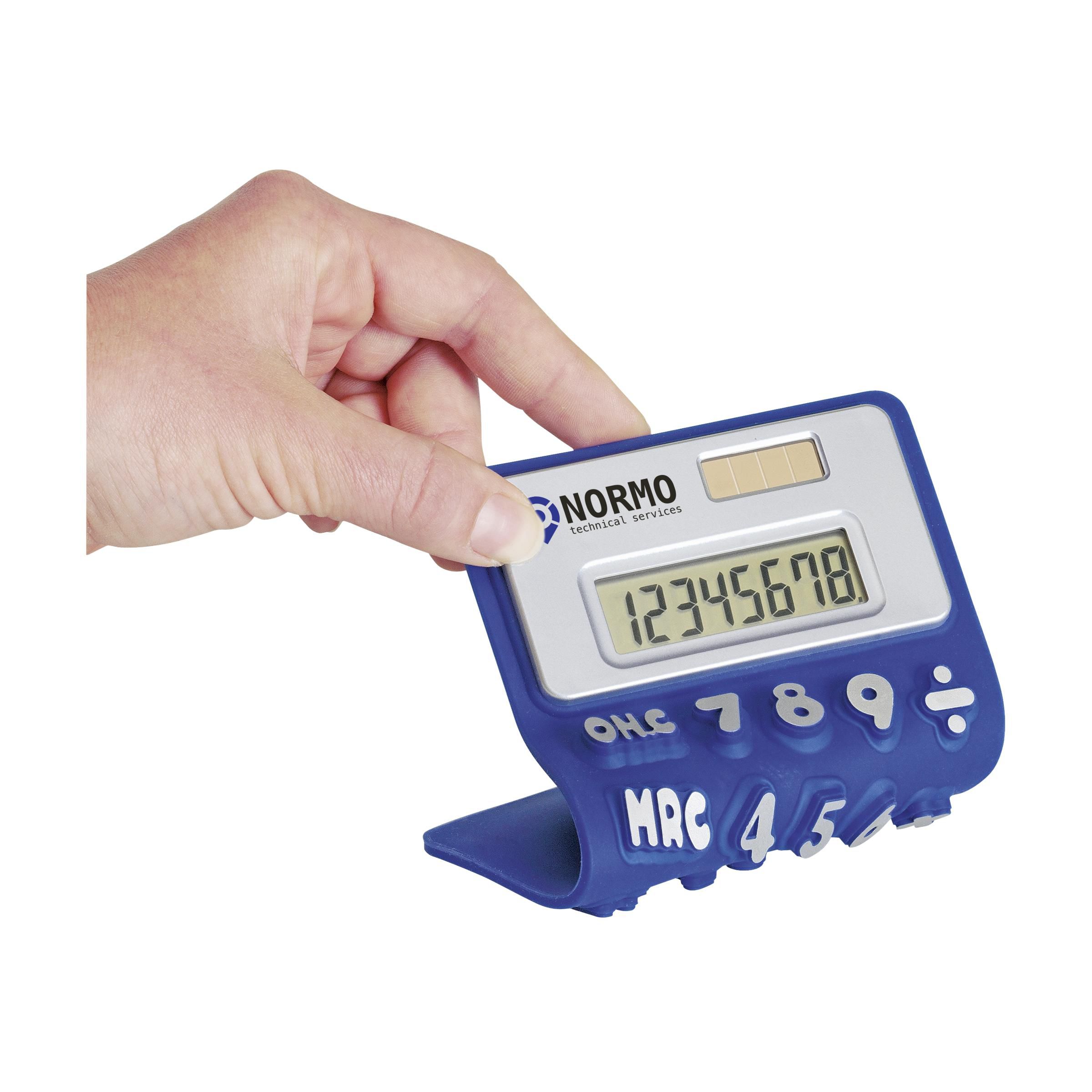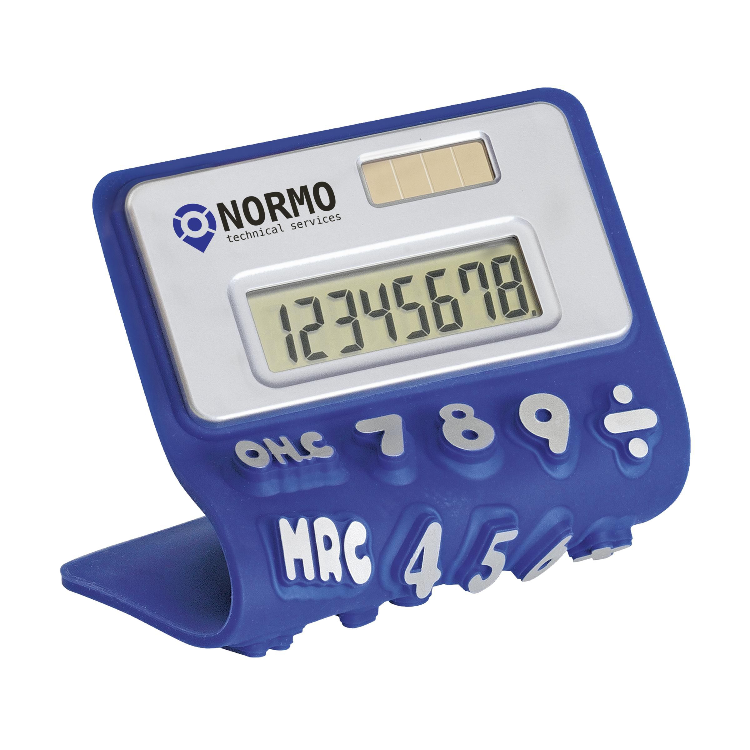 Flexible, rubber non-slip calculator with 8-digit display and dual power. Incl. cell battery and user manual. In a box.