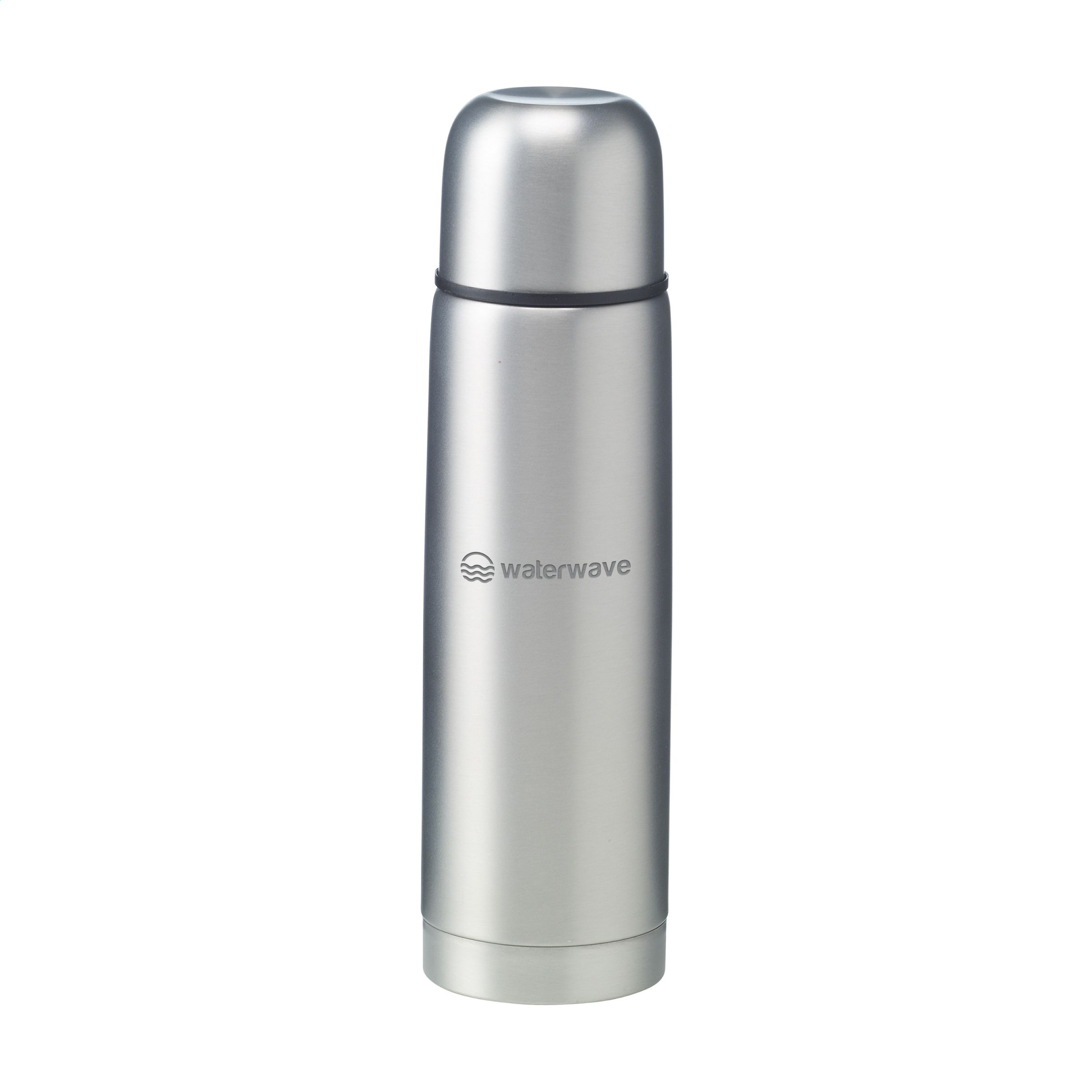 Double-walled, vacuum-insulated, stainless steel thermo bottle with double screw cap and a handy pouring system with snap closure. The cap can also be used as a drinking cup. Finished with a frosted, metallic finish. Capacity 500 ml. Each piece in a box.