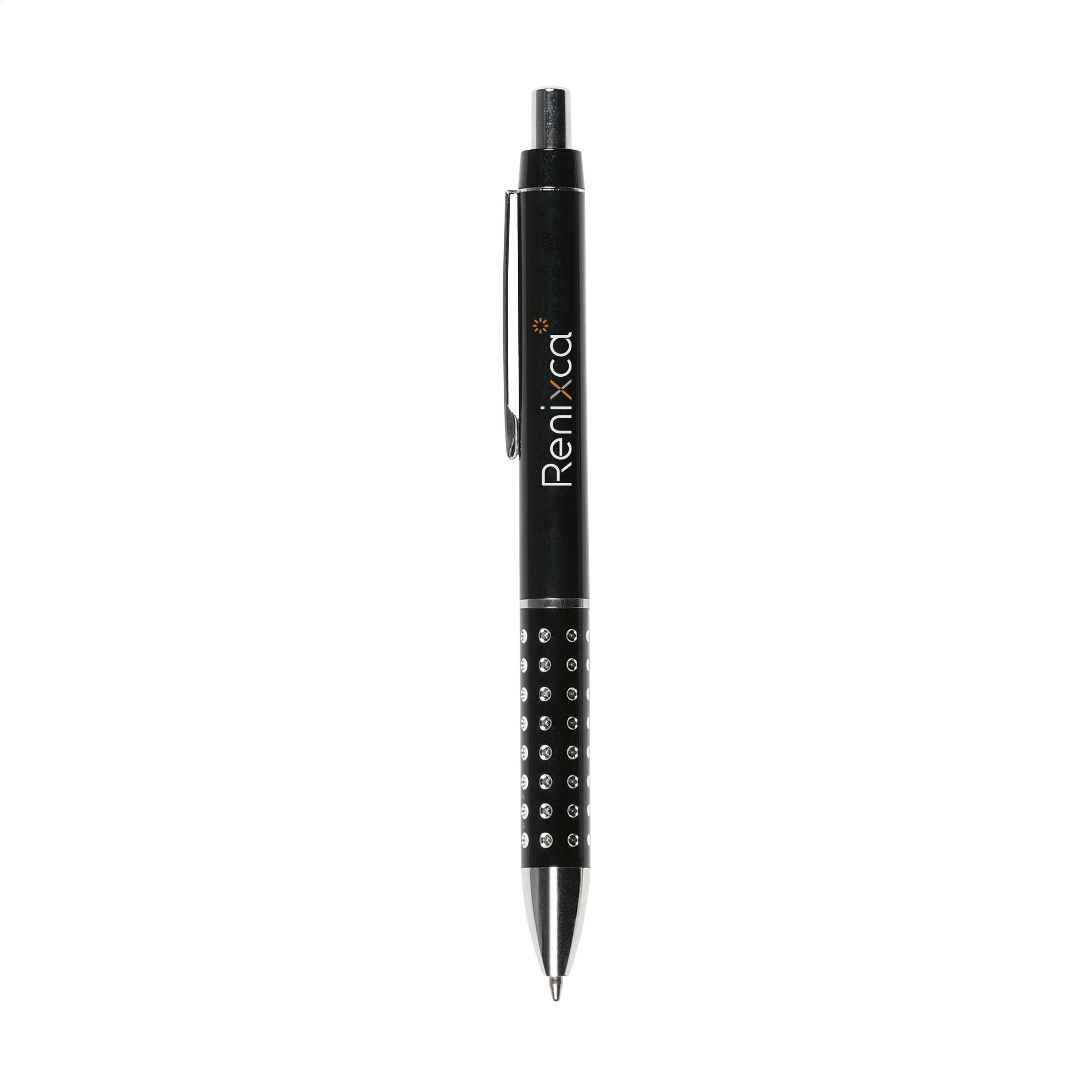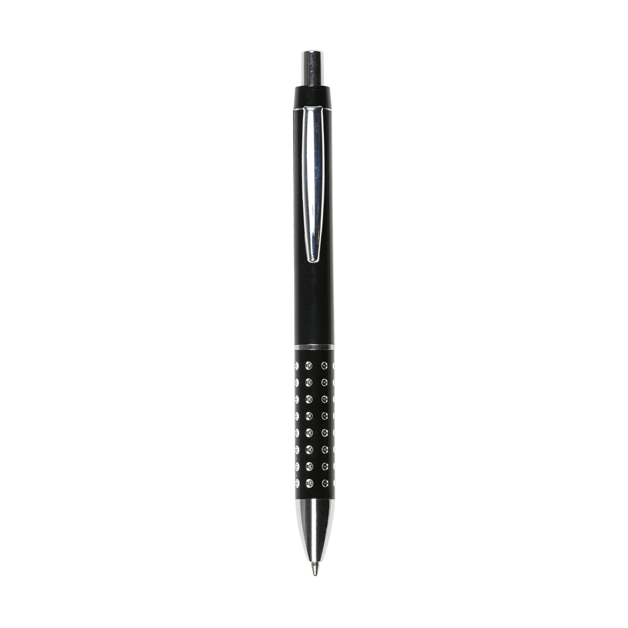 Blue or black ink ballpoint pen featuring a non-slip grip with inlaid aluminium circles and metal clip. Please state your preference when ordering.