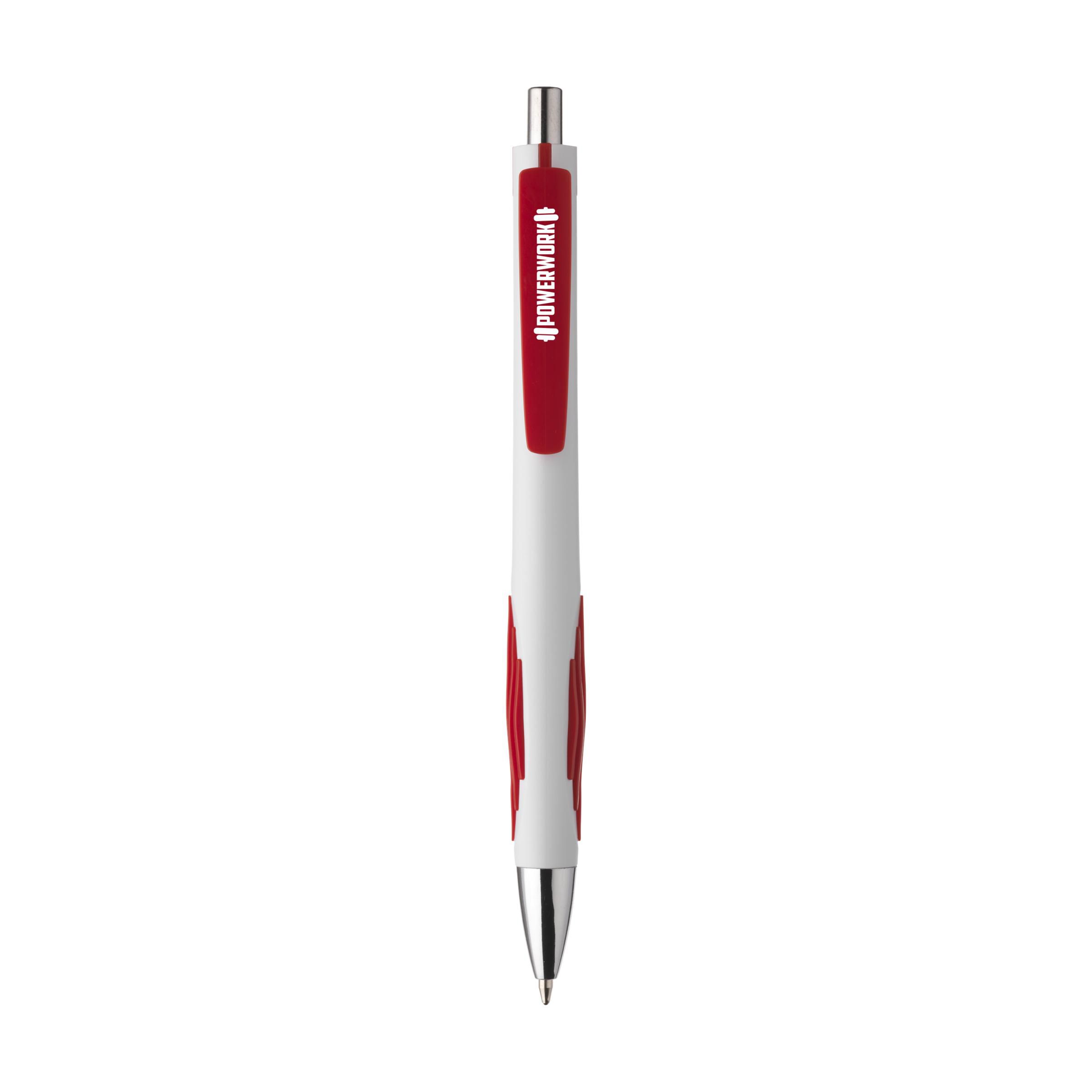 Blue ink ballpoint pen with striking grip for an enjoyable writing experience and large, coloured clip.