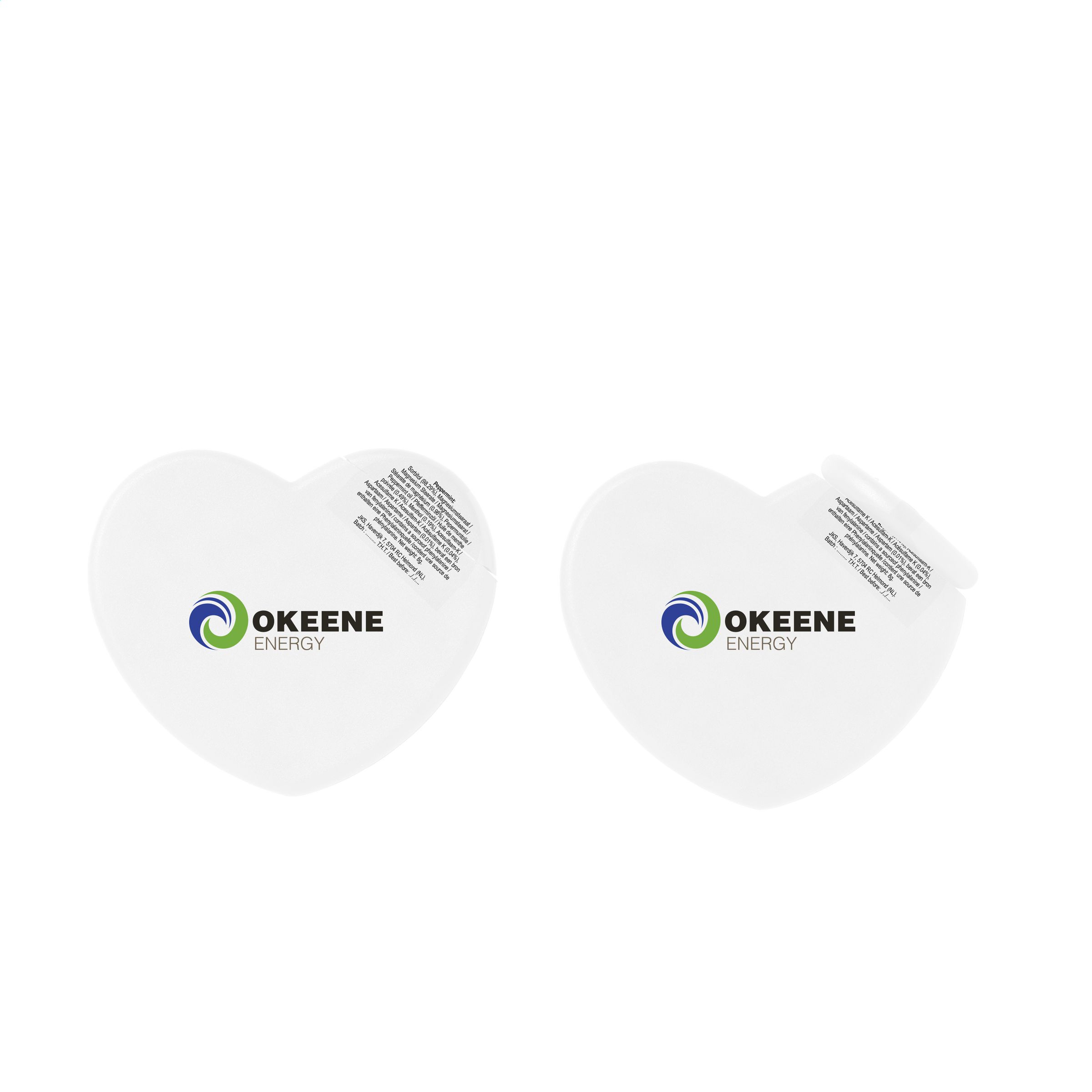 Compact, flat plastic dispenser in the shape of a heart, filled with approx. 8 g (50 pieces) of sugar free peppermints.