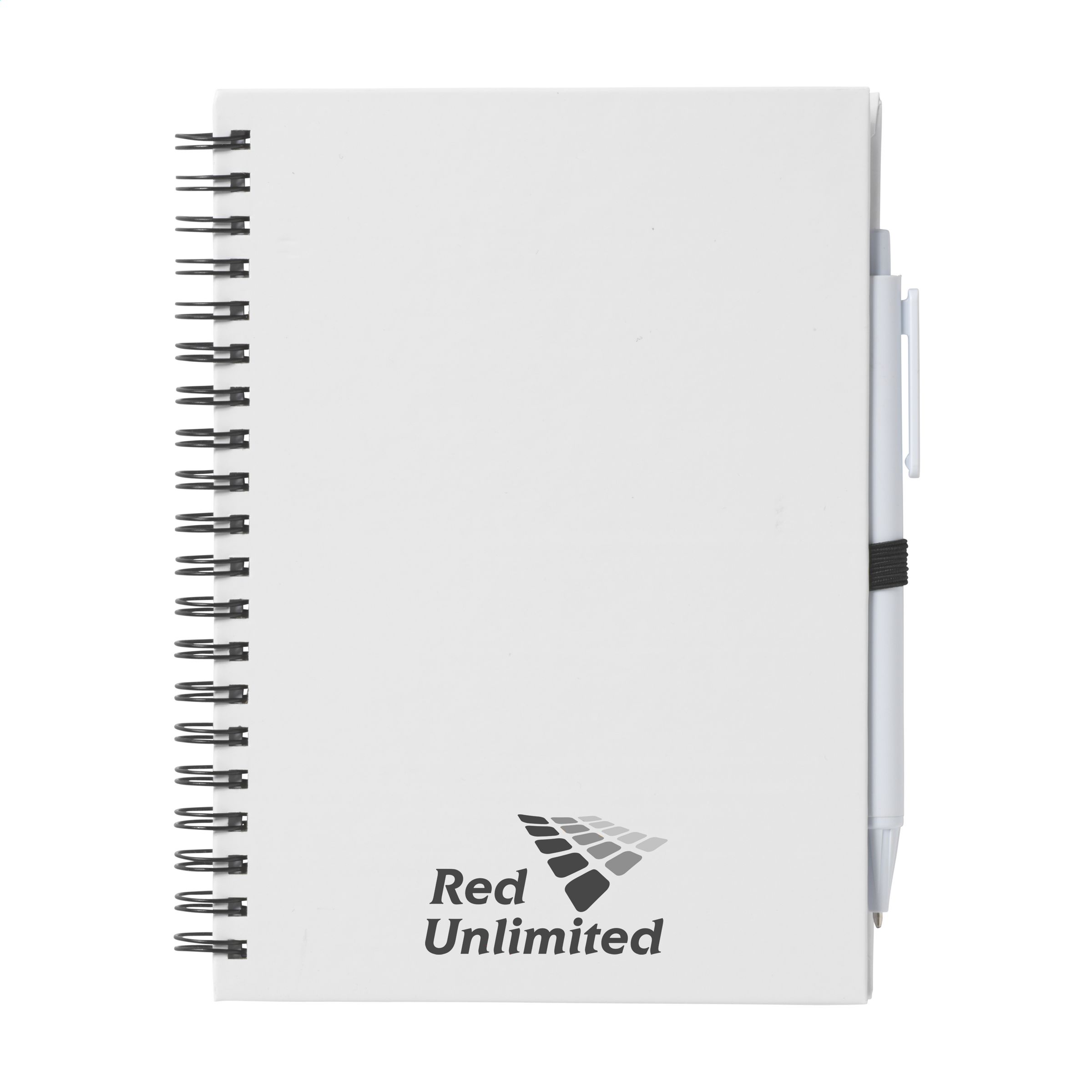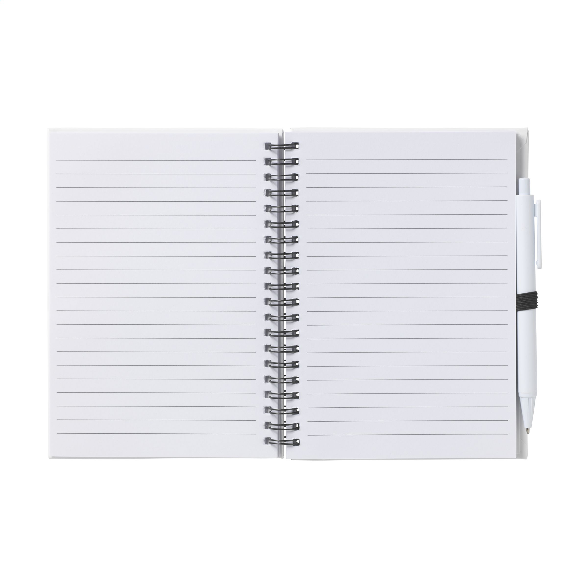 Notebook with approx. 70 sheets of white lined paper and cardboard coloured cover. Bound in a strong, spiral bound. Includes matching, blue ink ballpoint pen.