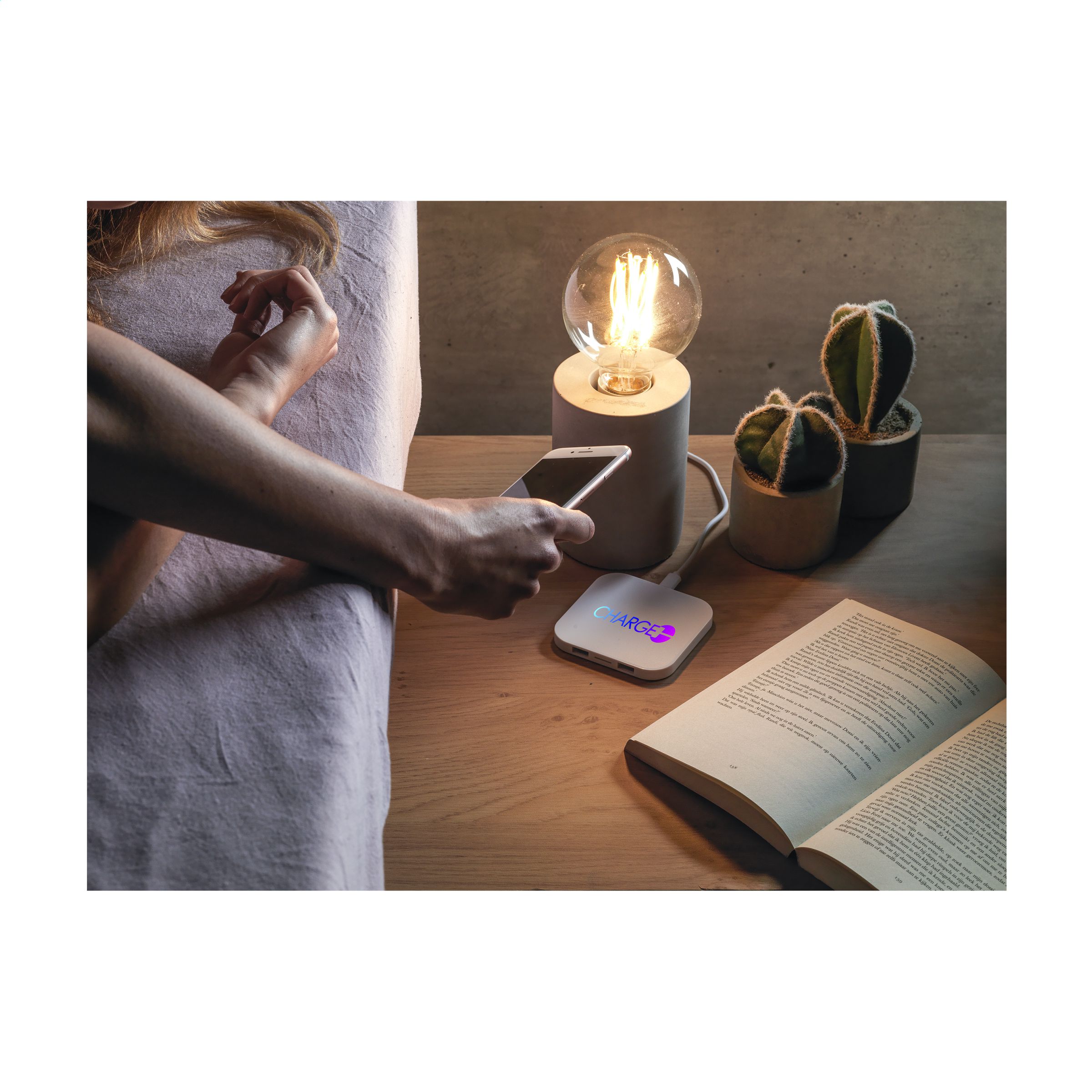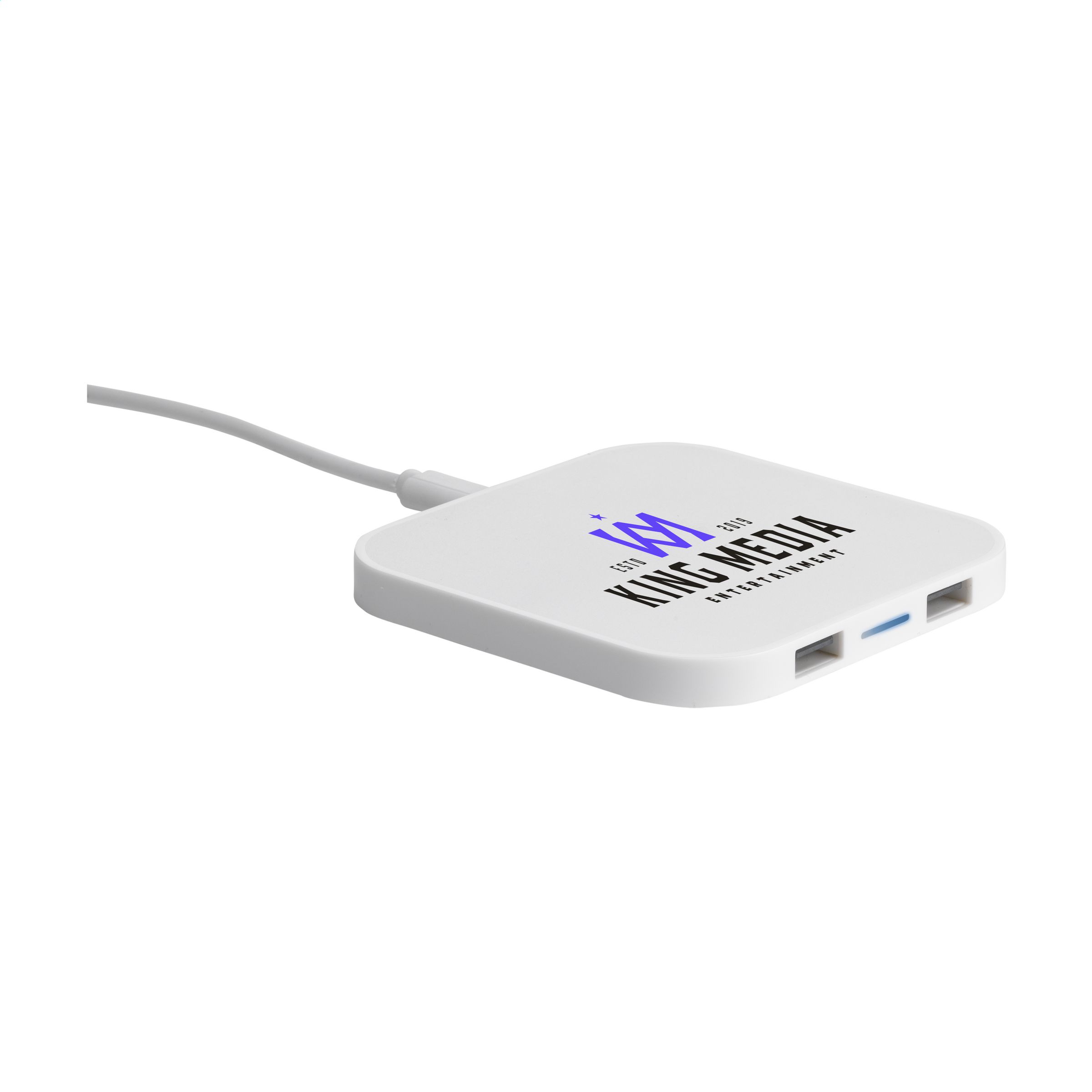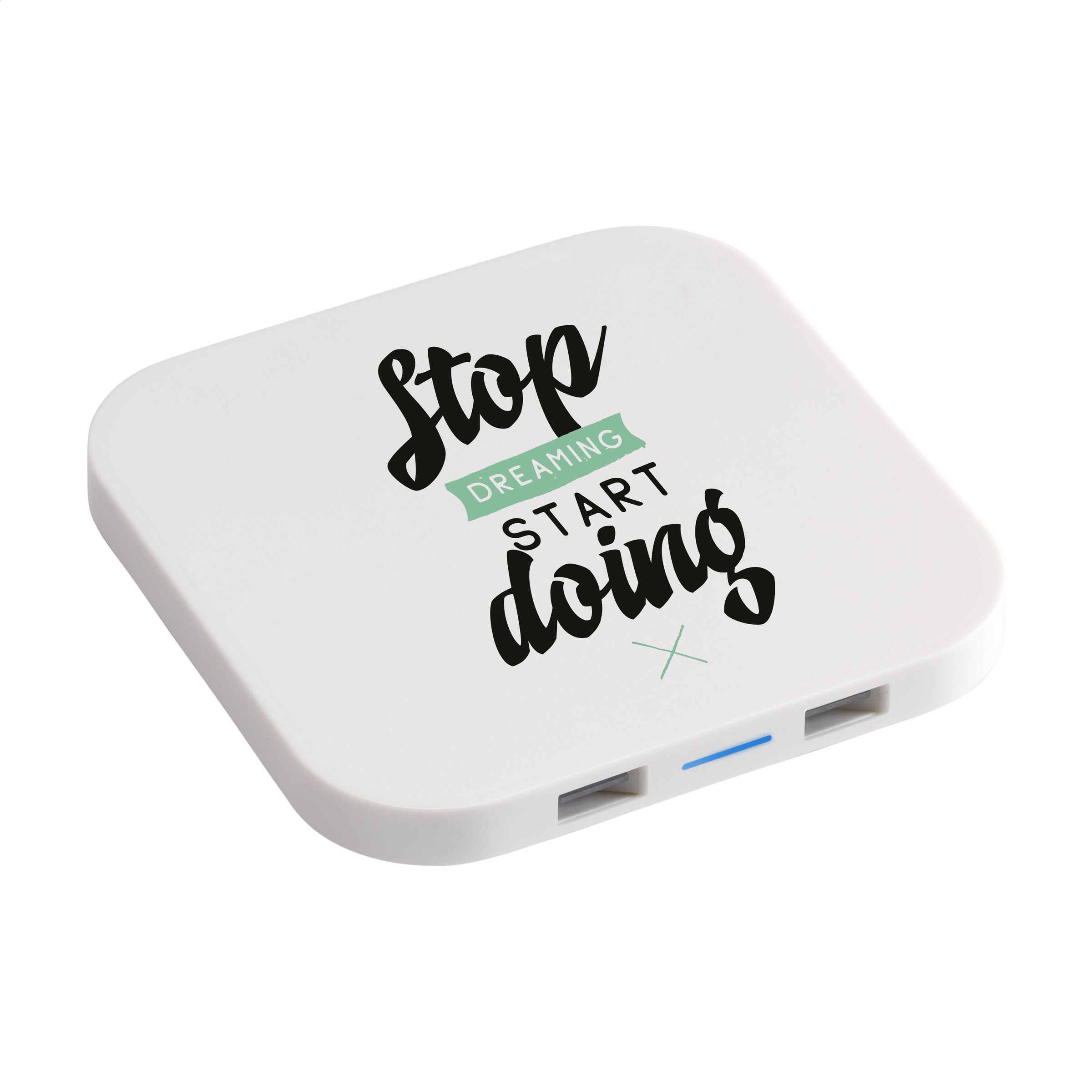 Wireless ABS charger for mobile devices that support Qi wireless charging (newest generation Android and iPhones generation 8 or higher). With indicator light and 2 HUB ports for connecting additional devices. Input: DC5V/1.5A. Wireless output: DC5V/1A (5W). Includes micro-USB charging cable and user manual. Each piece in a box.