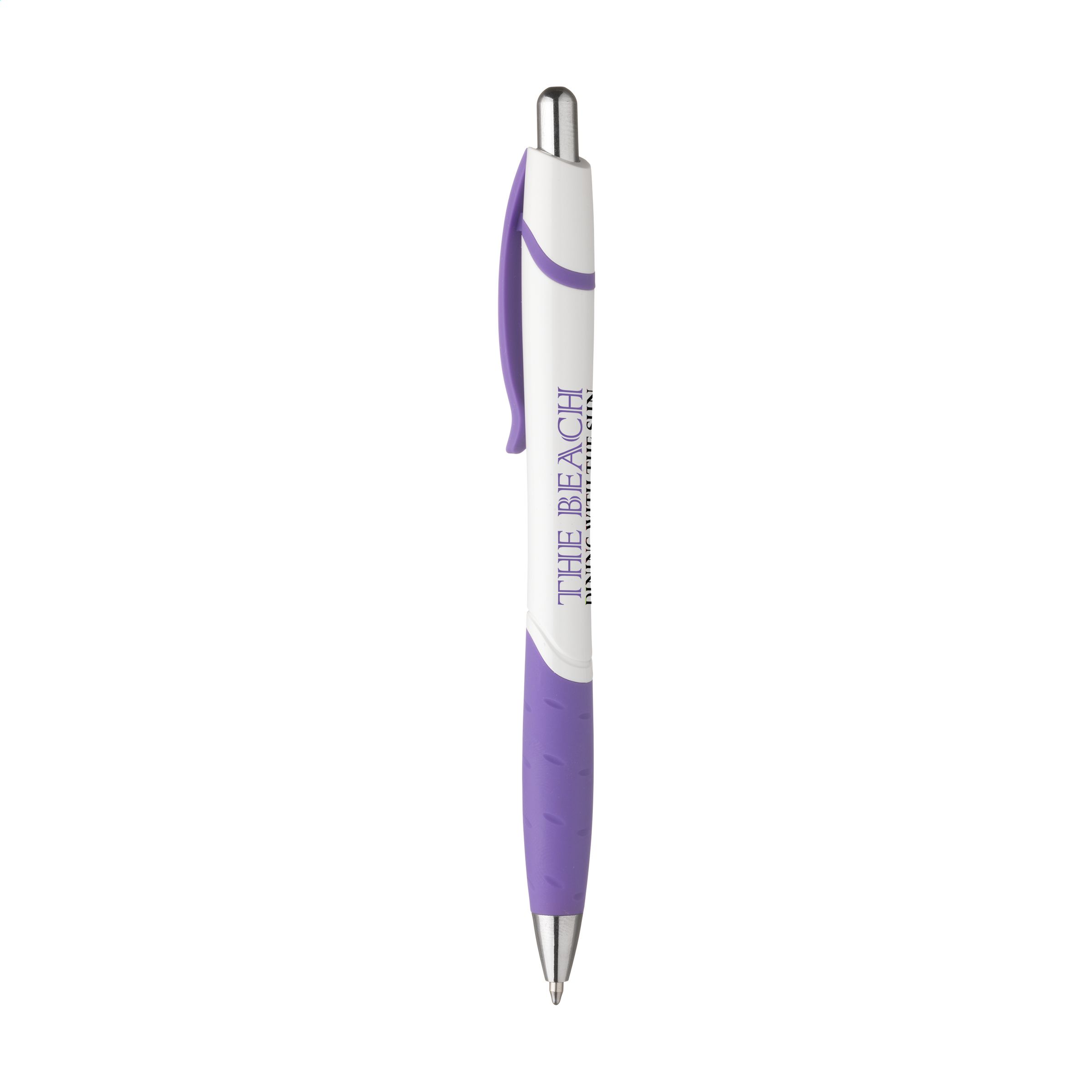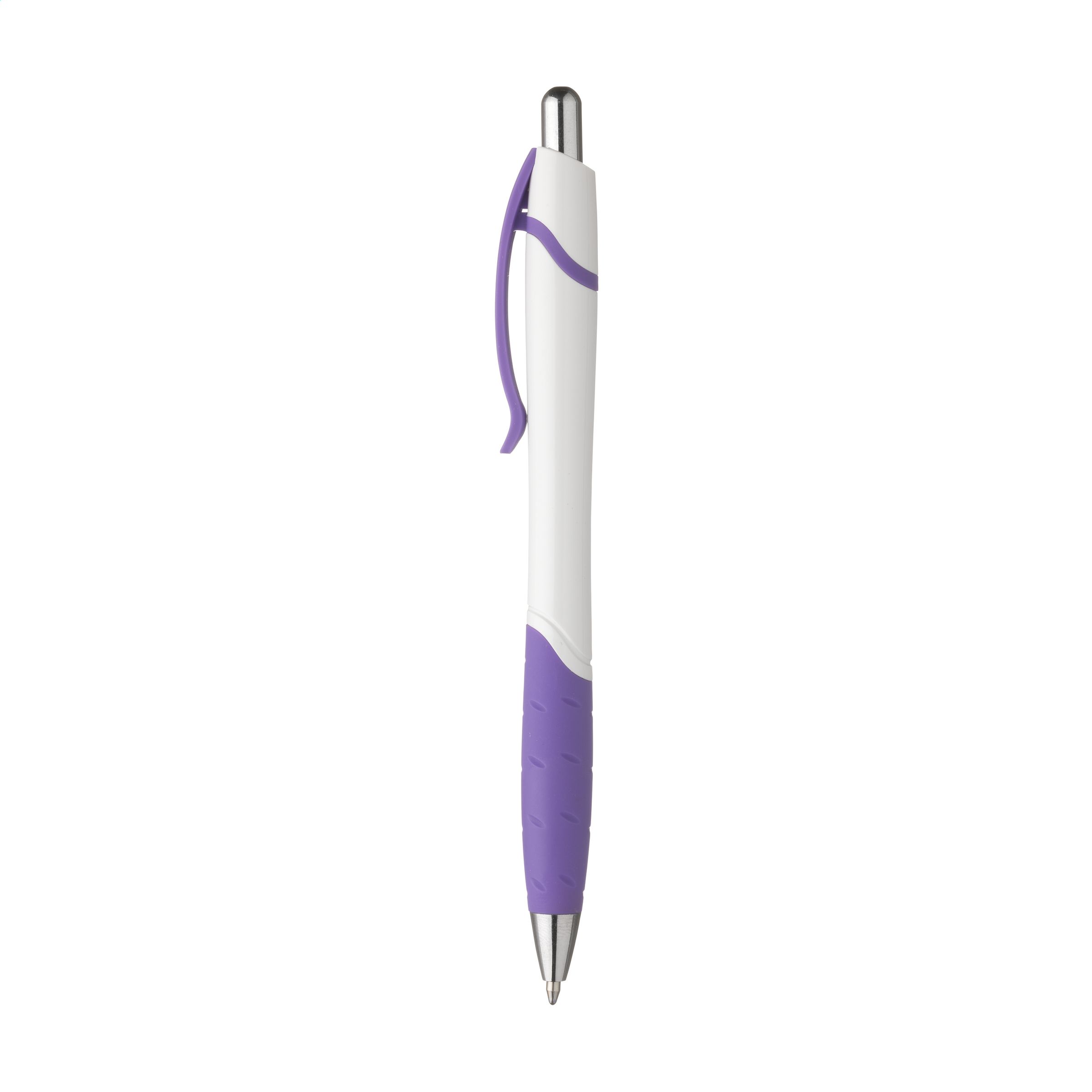 Blue ink ballpoint pen with colour accents, rubber grip and elegant clip.