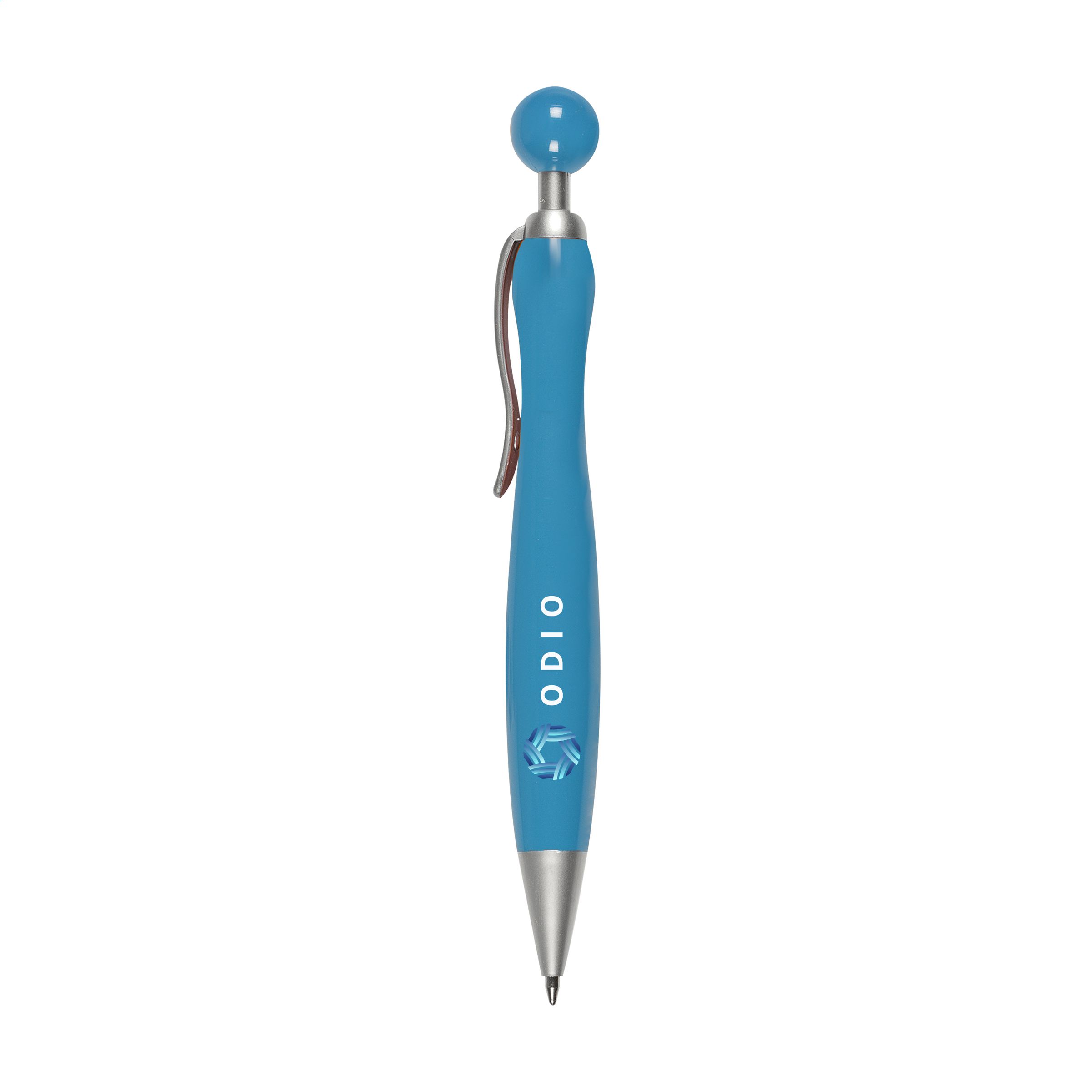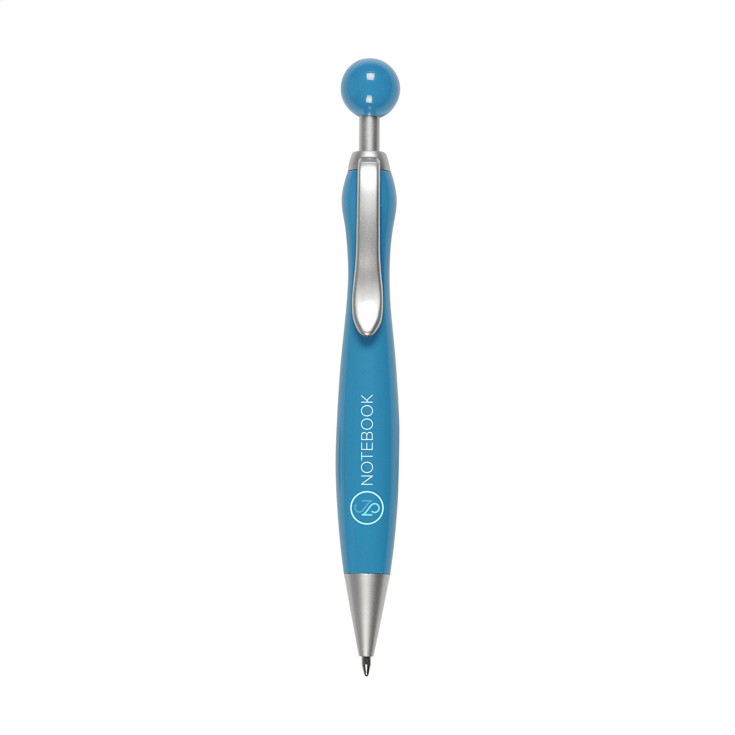 Blue ink ballpoint pen with spherical push button.