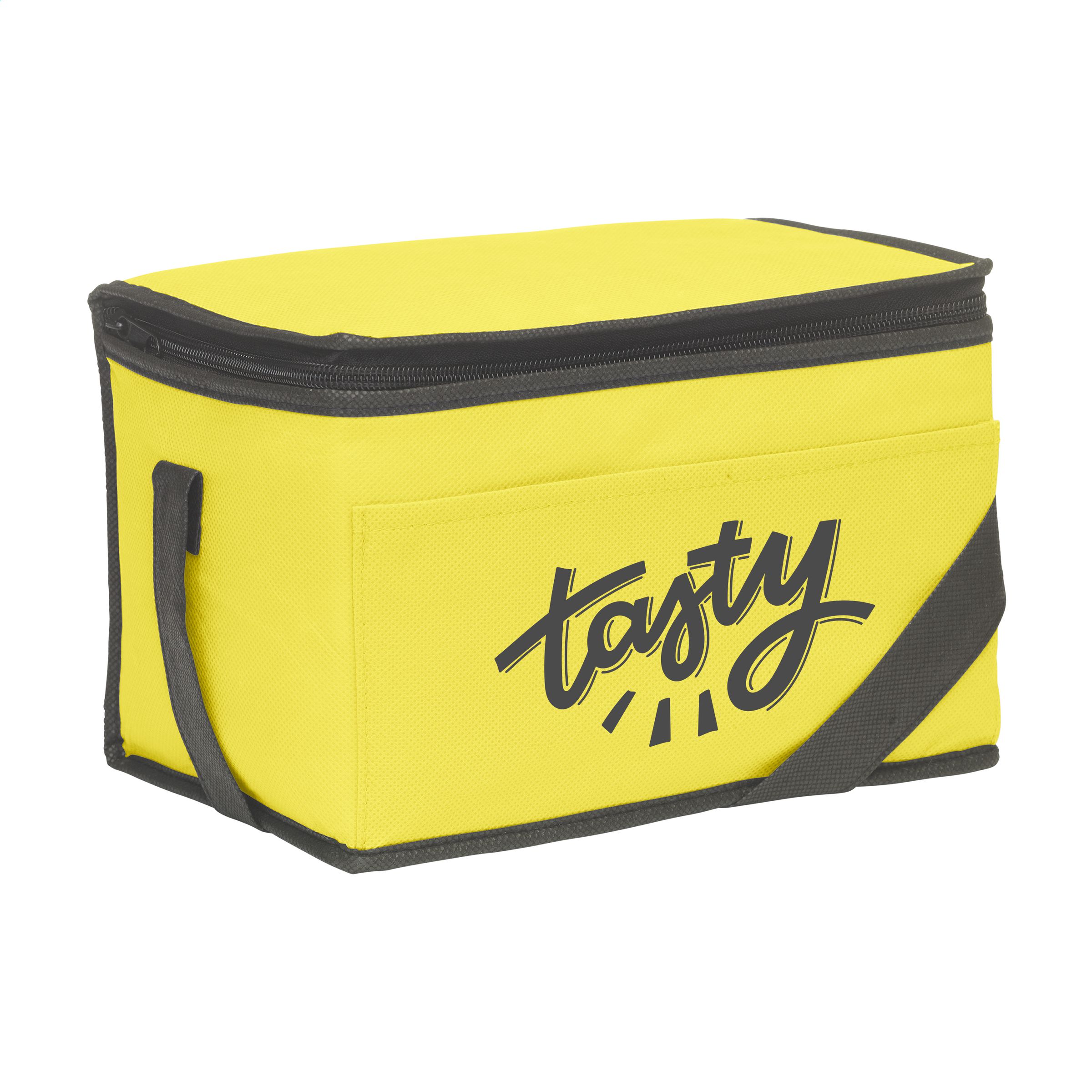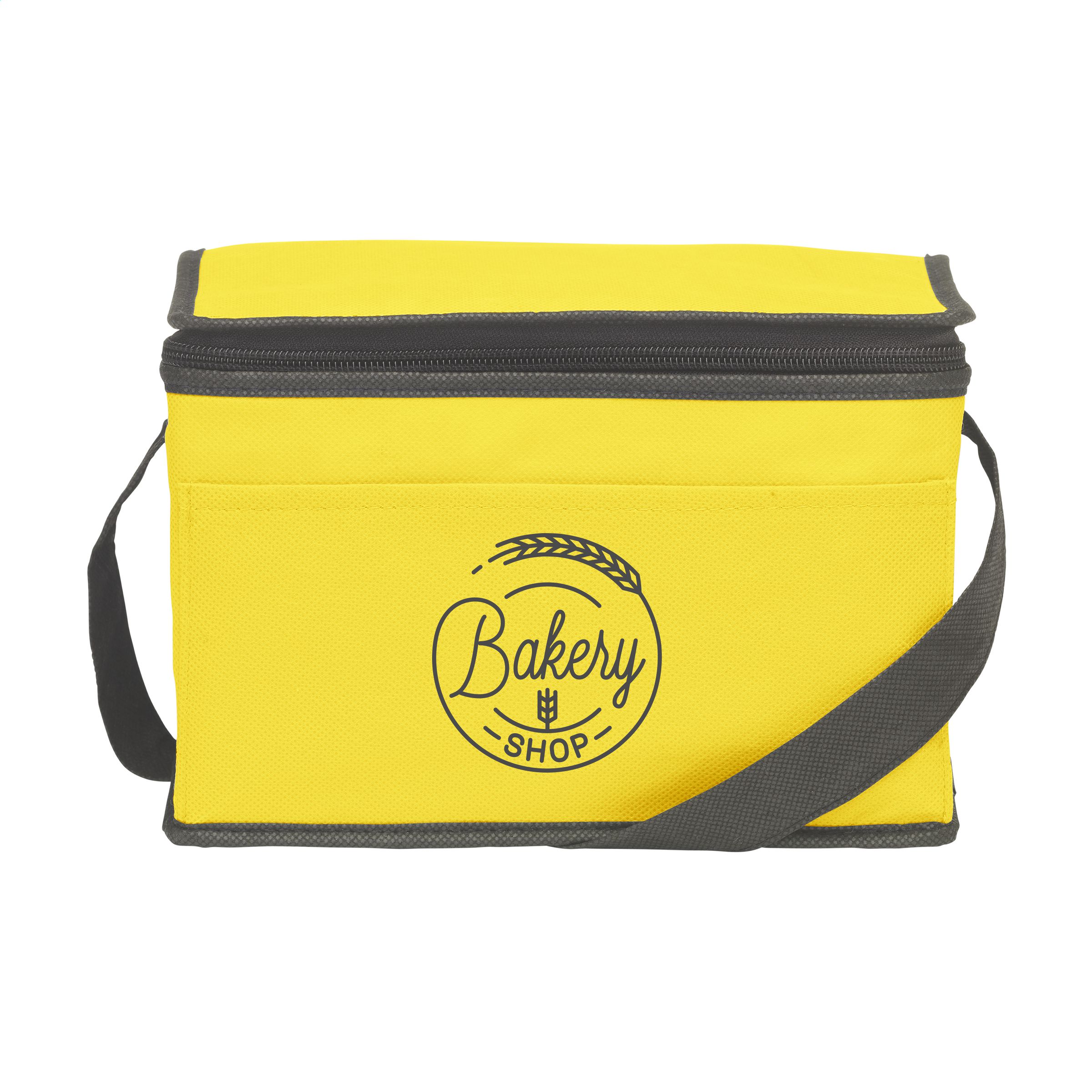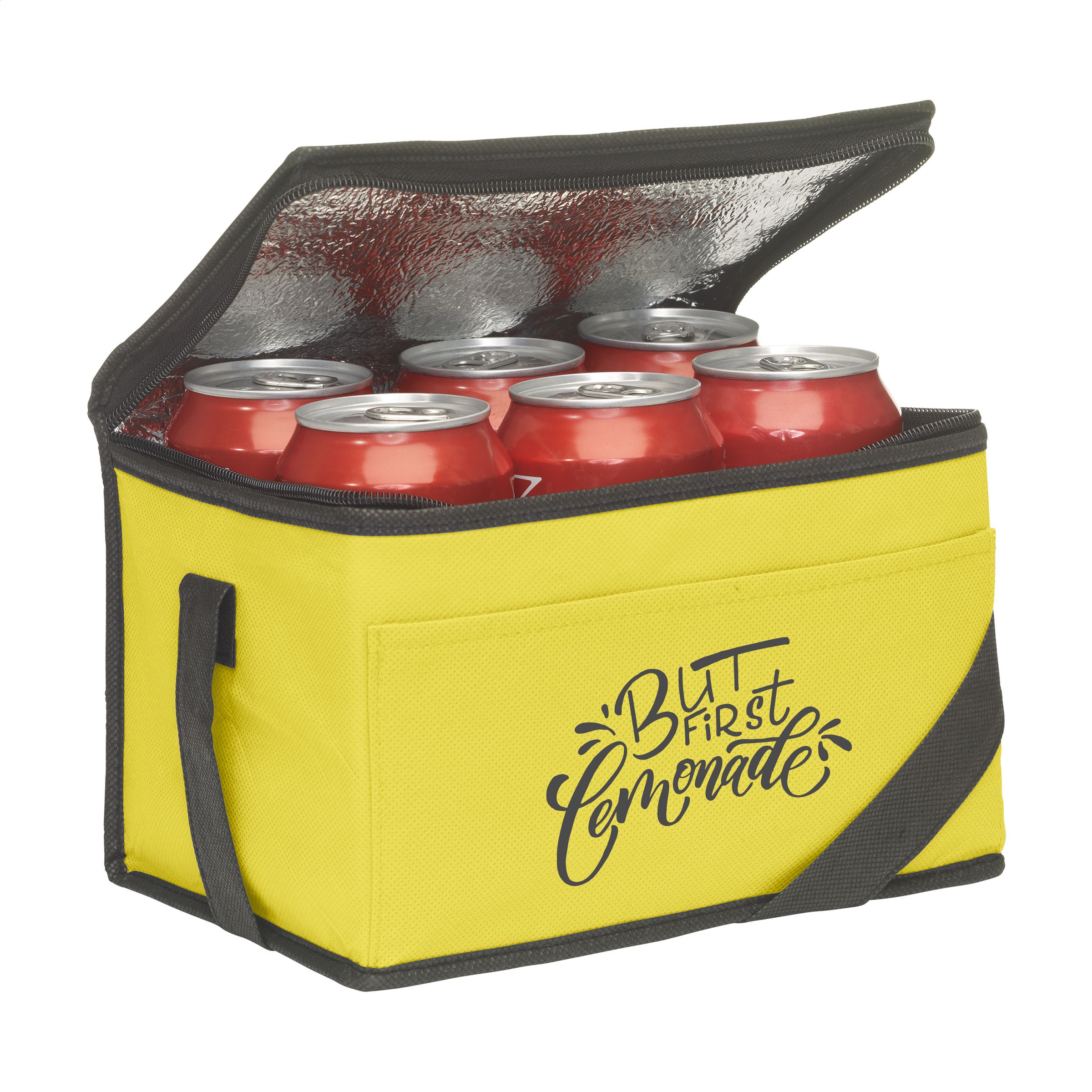 Cooler bag made of non-woven fabric (80 g/m²) suitable for 6 cans of drinks or food. With strap.