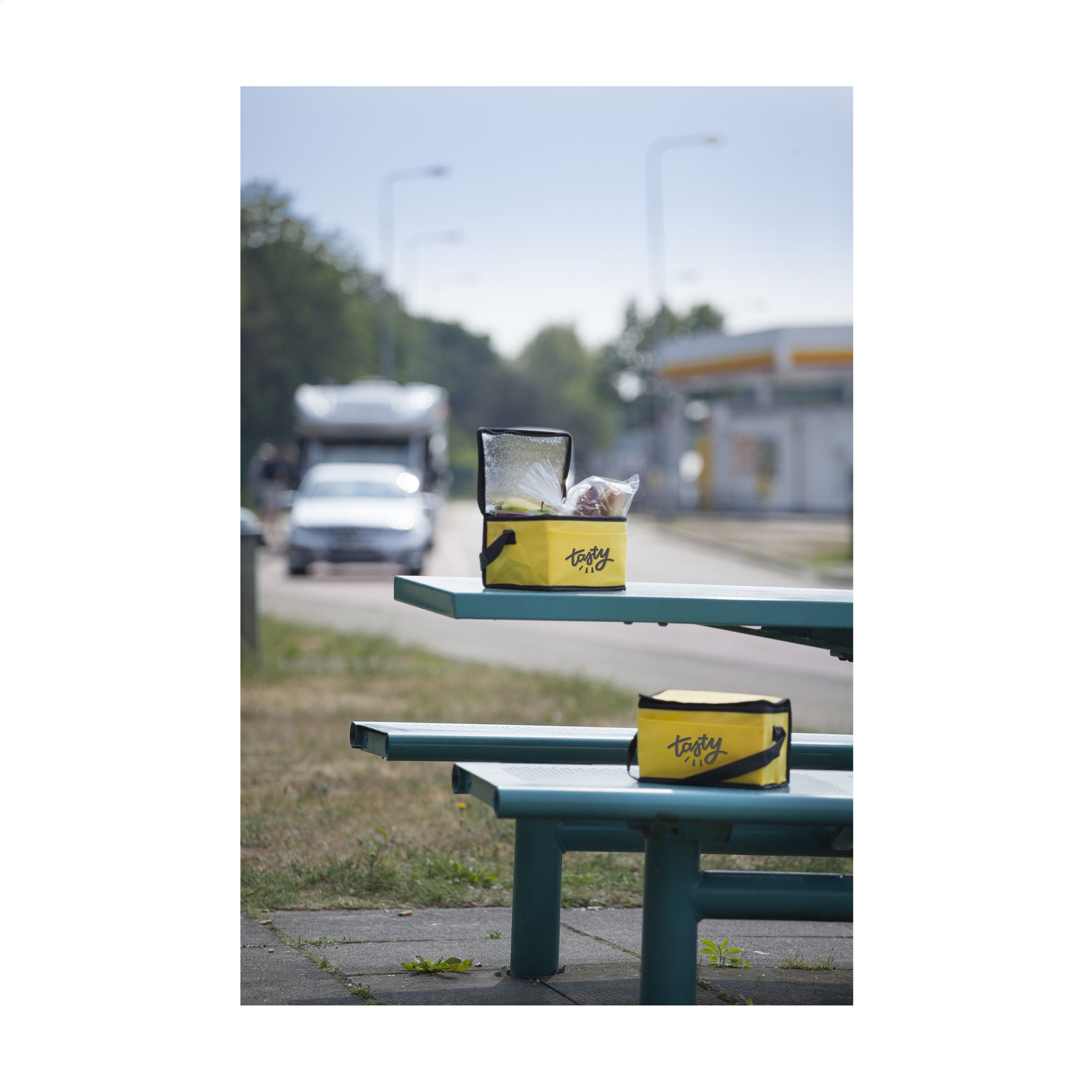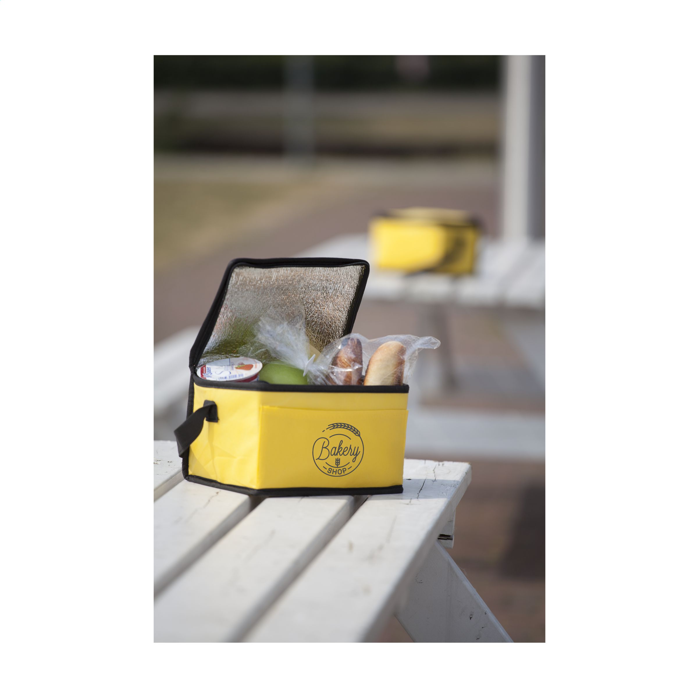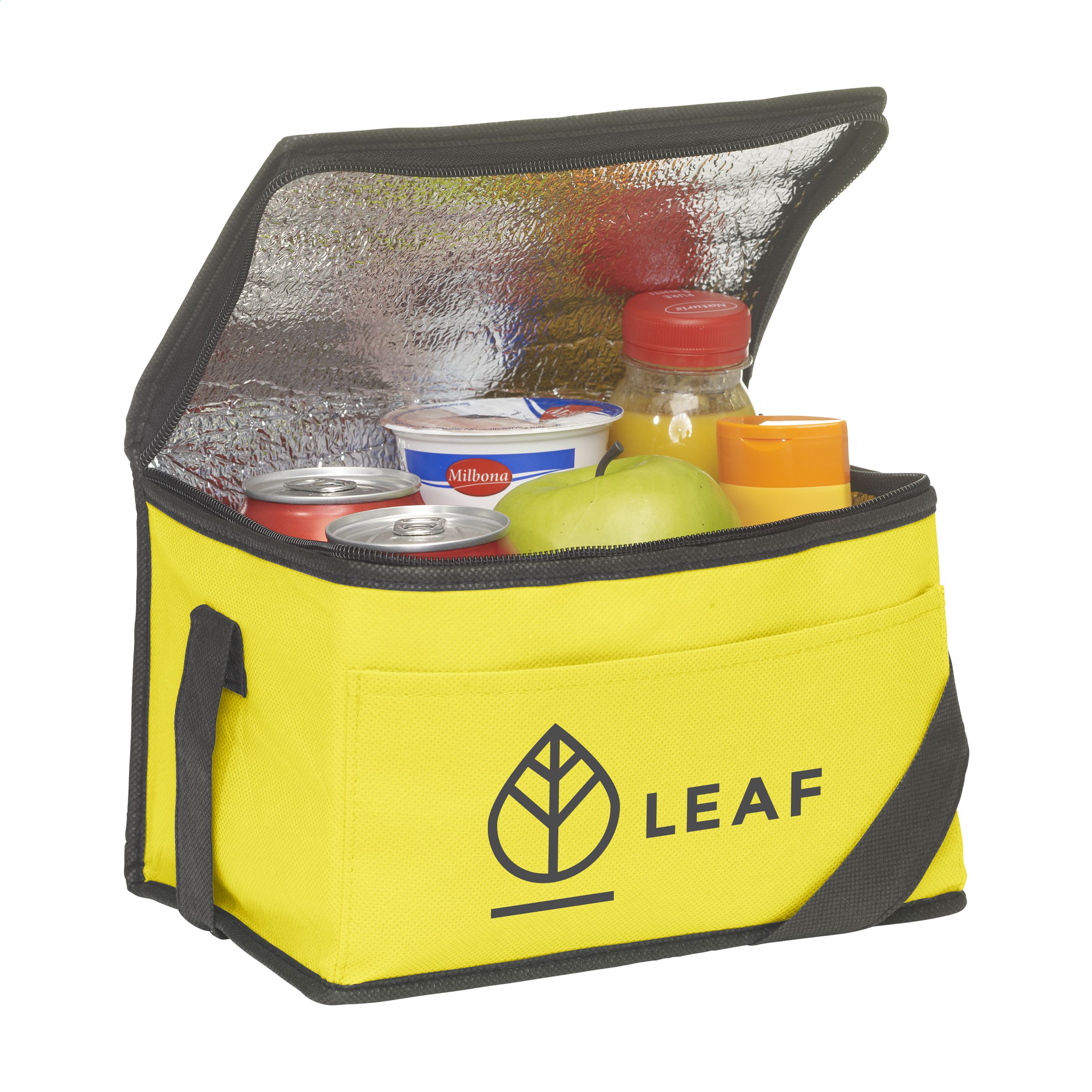 Cooler bag made of non-woven fabric (80 g/m²) suitable for 6 cans of drinks or food. With strap.